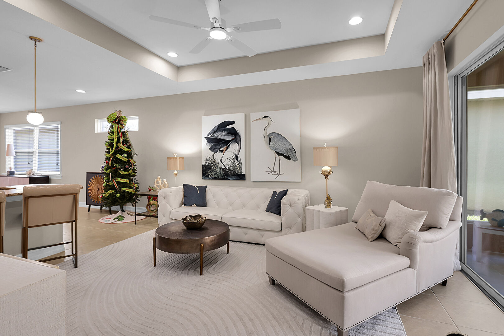 Baseboards Wall, Ceiling Fan, Drywall, Natural Light, Recessed Lighting, Tile Floor, Tray Ceiling, Vent, Natural Light, Recessed Lighting, Tray Ceiling, U Shaped Kitchen