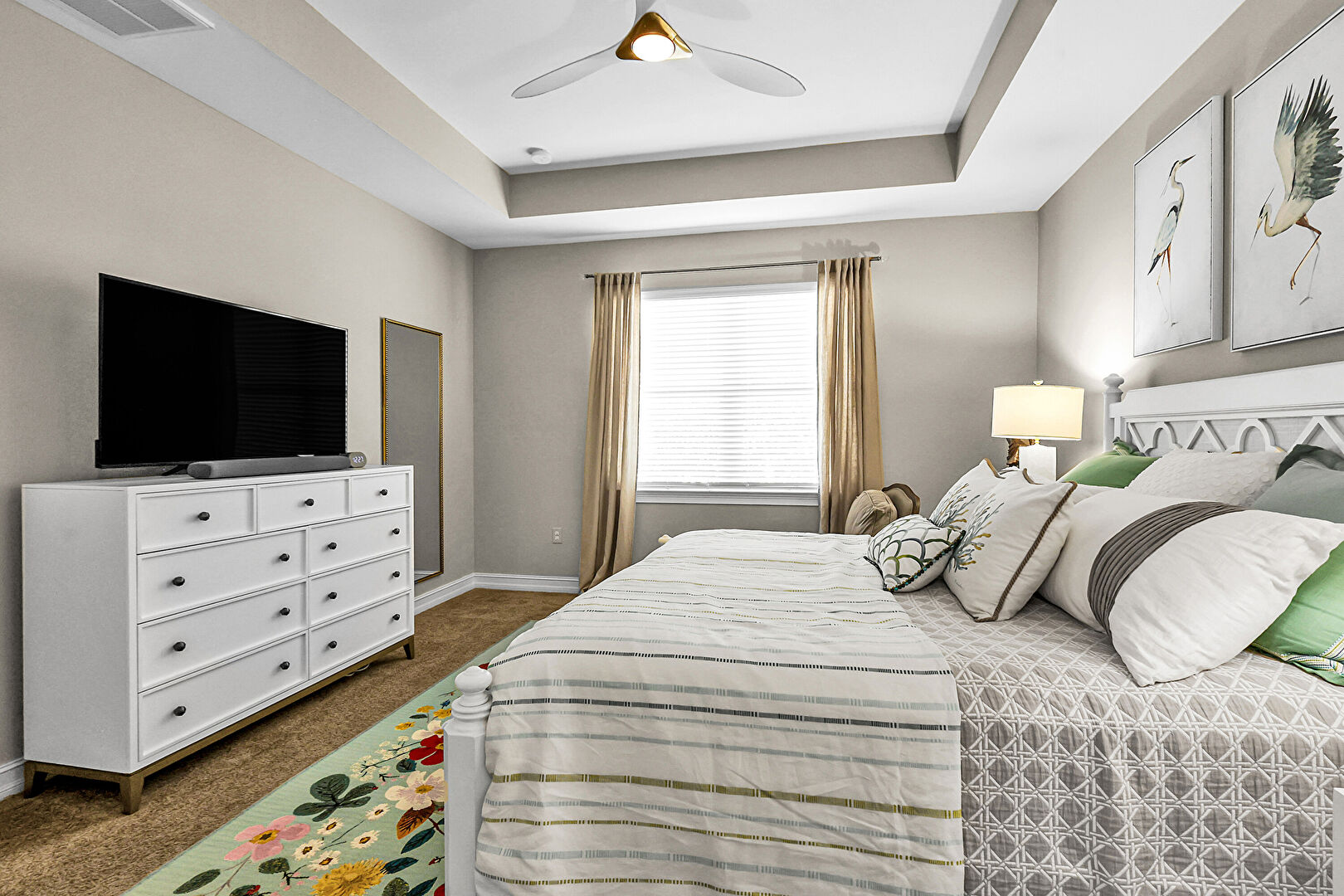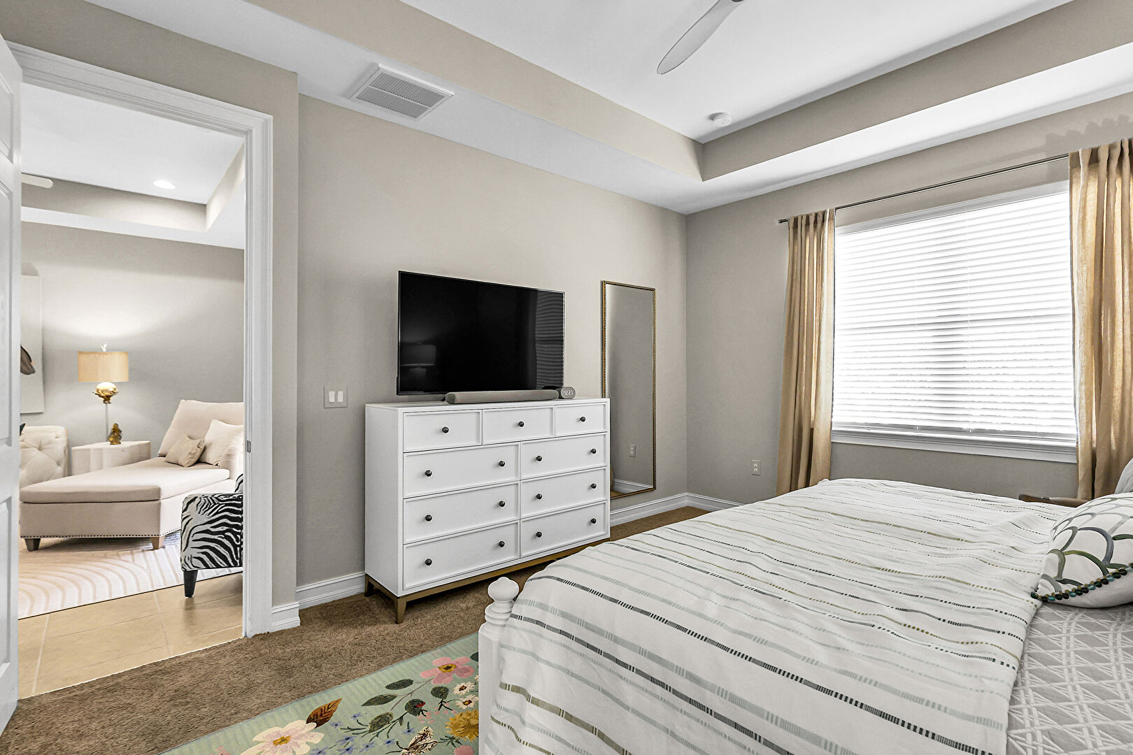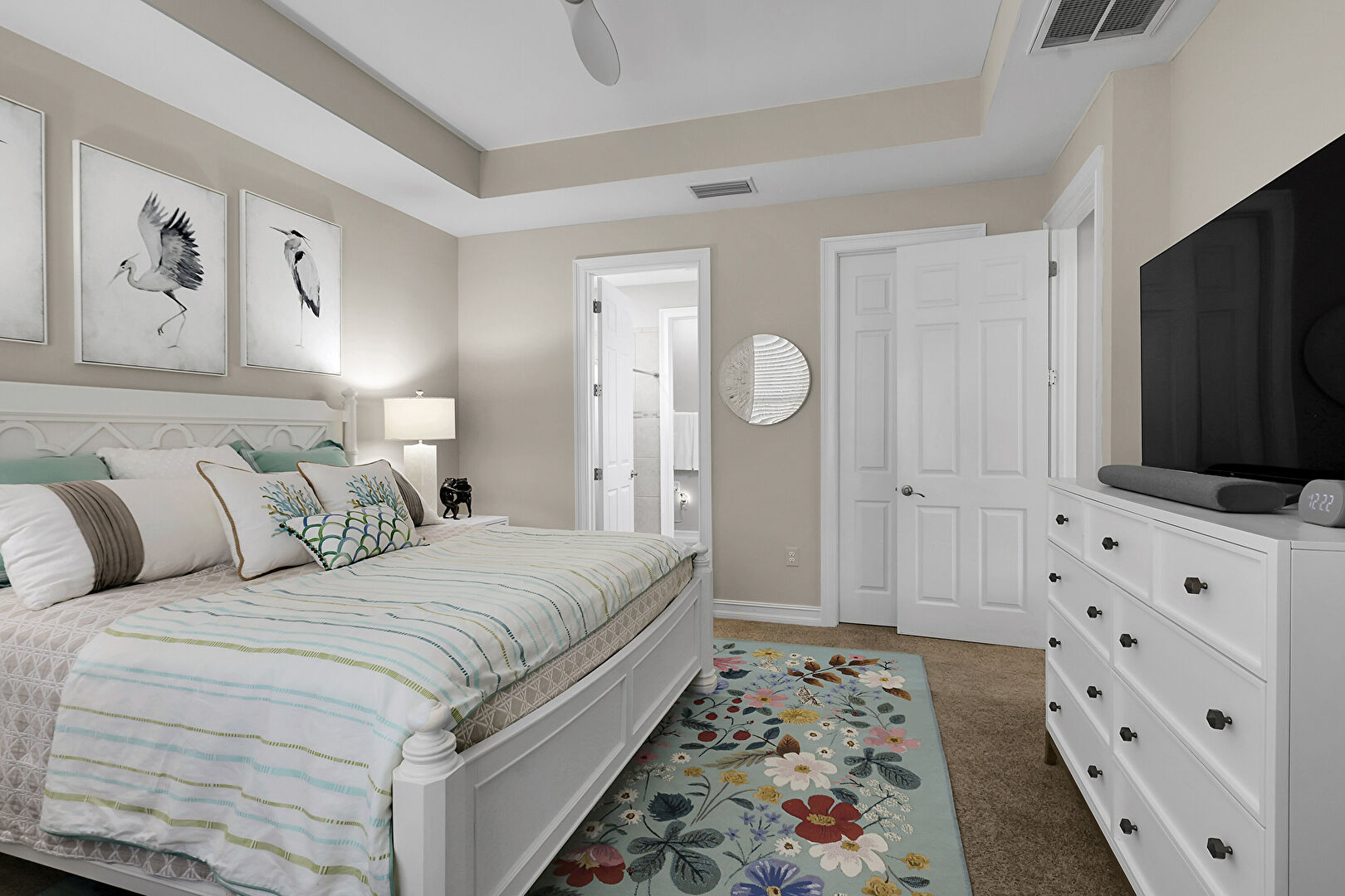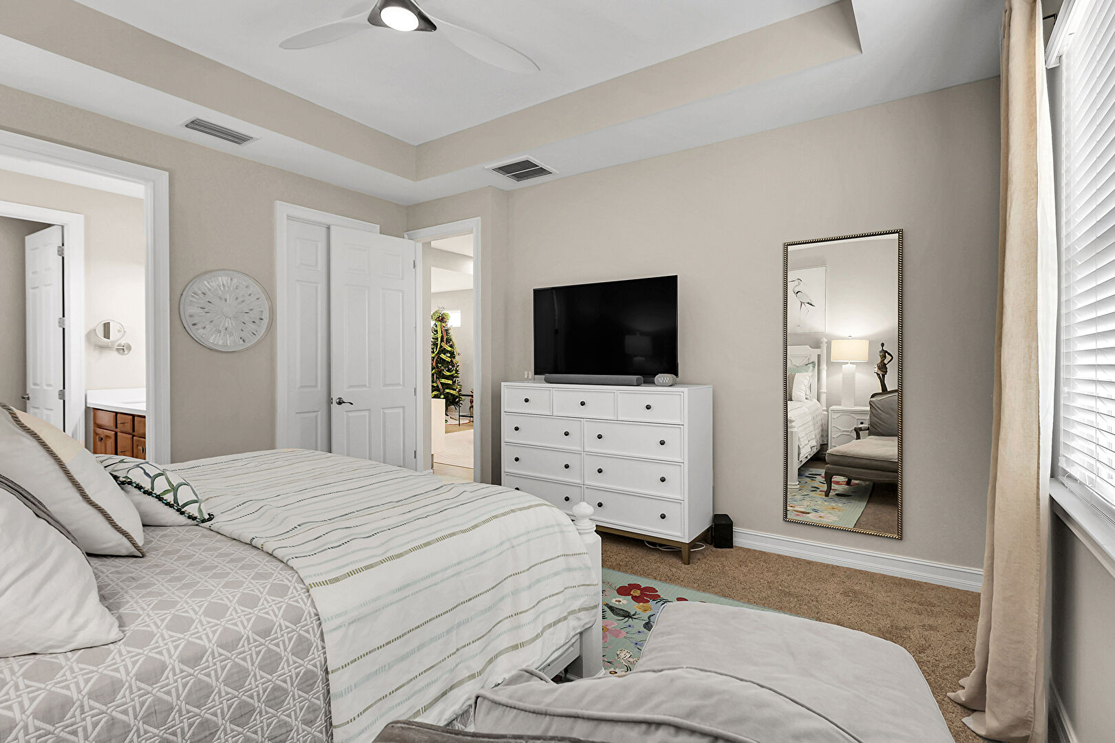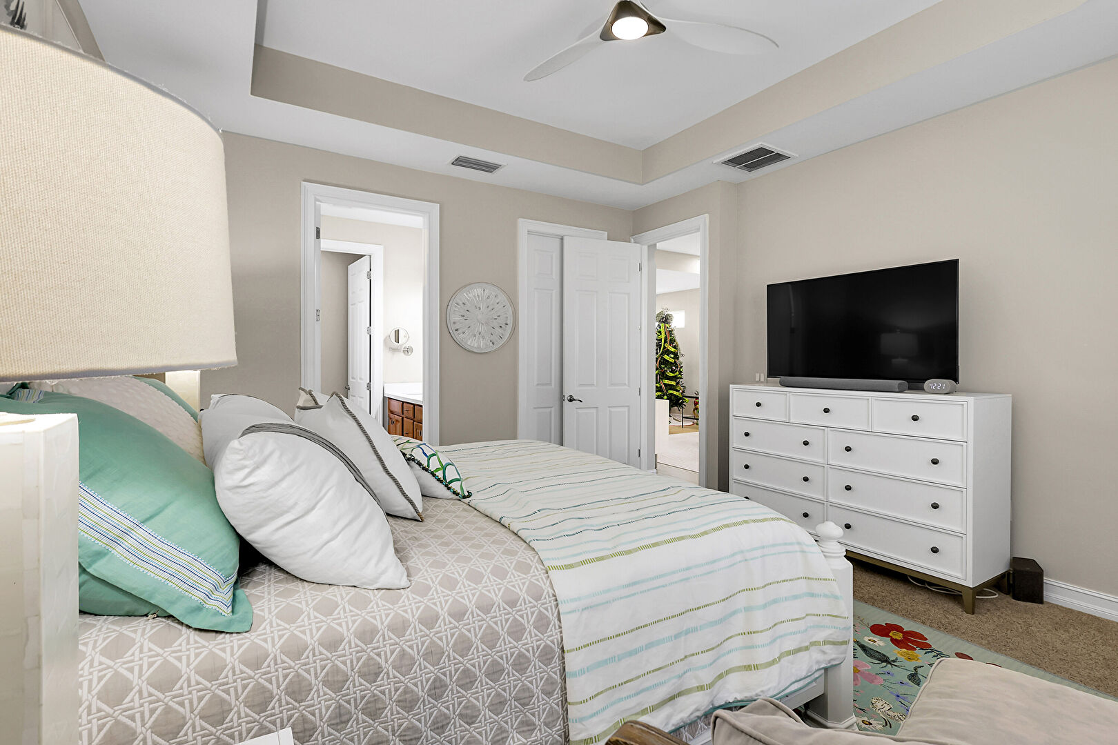 Baseboards Wall, Carpet, Ceiling Fan, Drywall, Ensuite Bathroom, Natural Light, Recessed Lighting, Tile Floor, Tray Ceiling, Vent, Carpet, Ceiling Fan, Drywall, Ensuite Bathroom, Vent