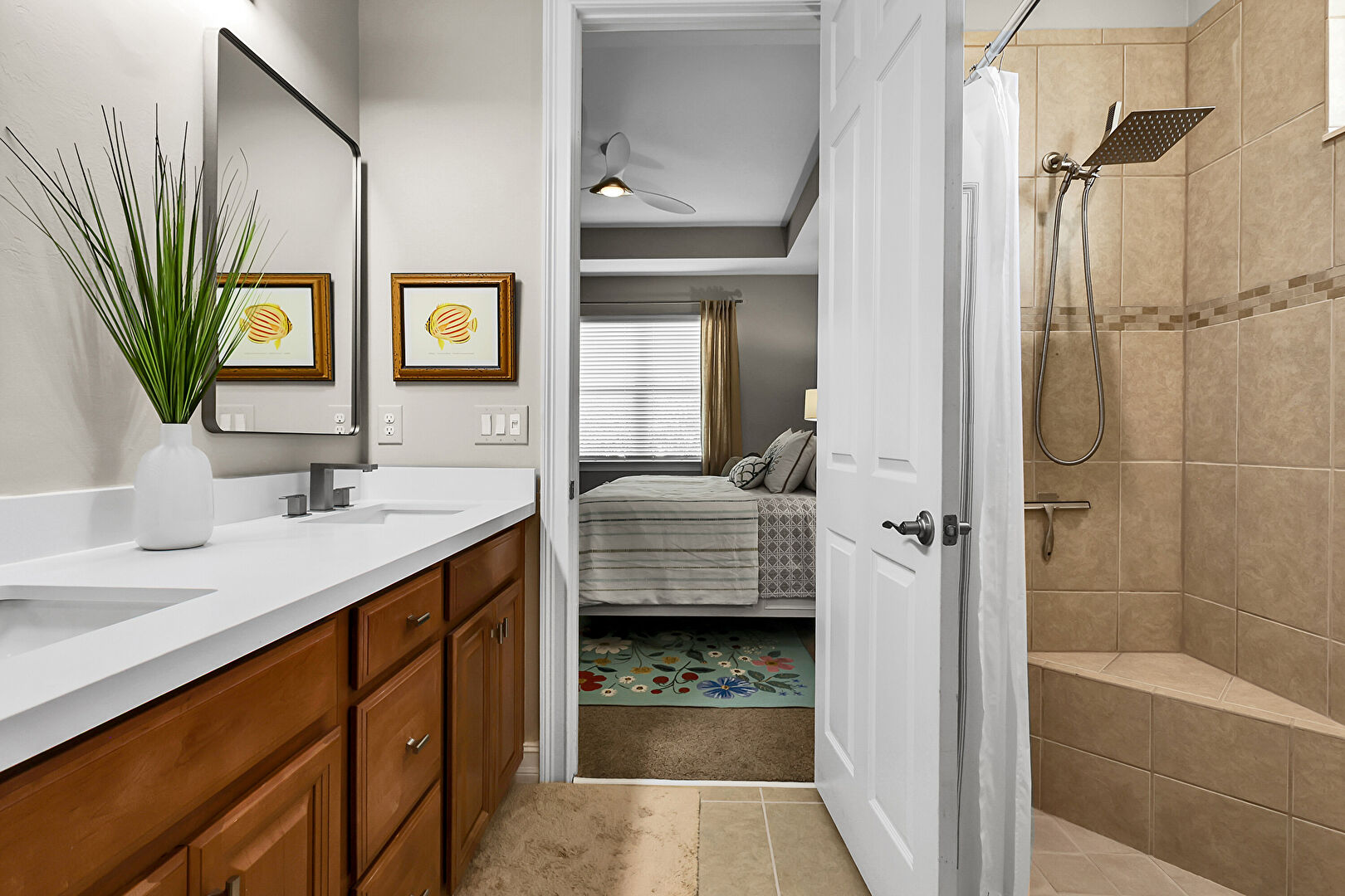 Carpet, Ceiling Fan, Double Vanity, Drywall, Ensuite Bathroom, Full Bathroom, Natural Light, Tile Floor, Baseboards Wall, Ceiling Fan, Natural Light