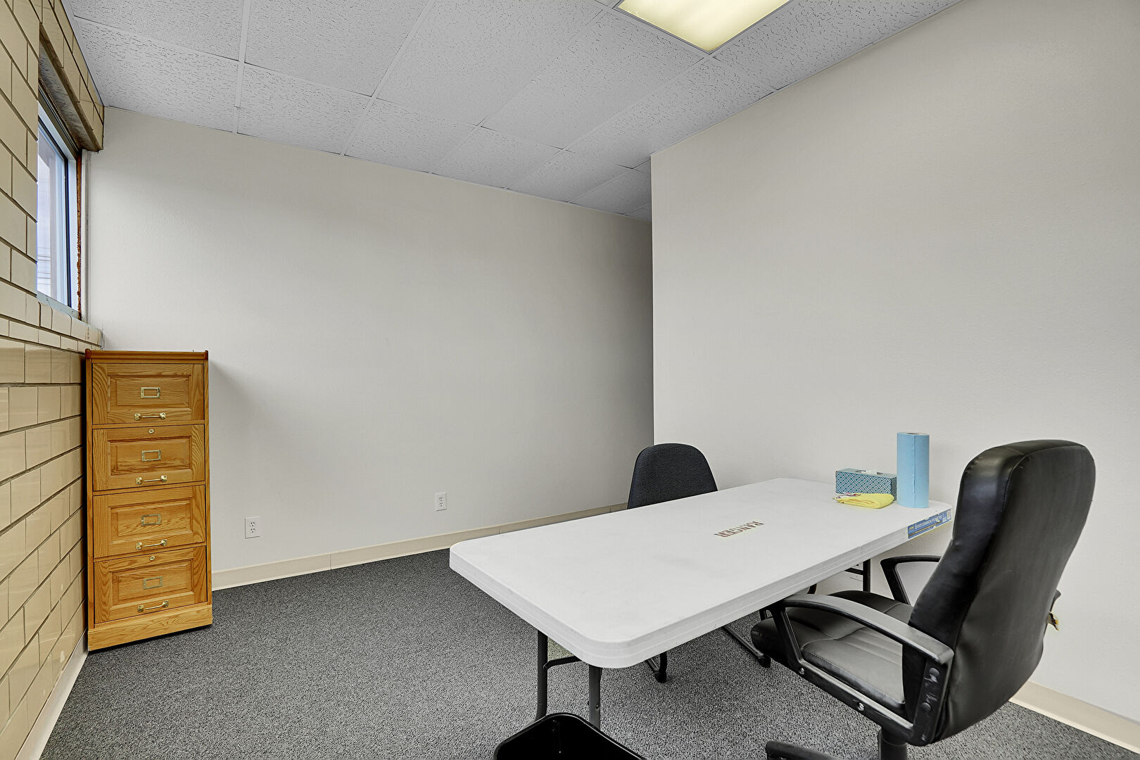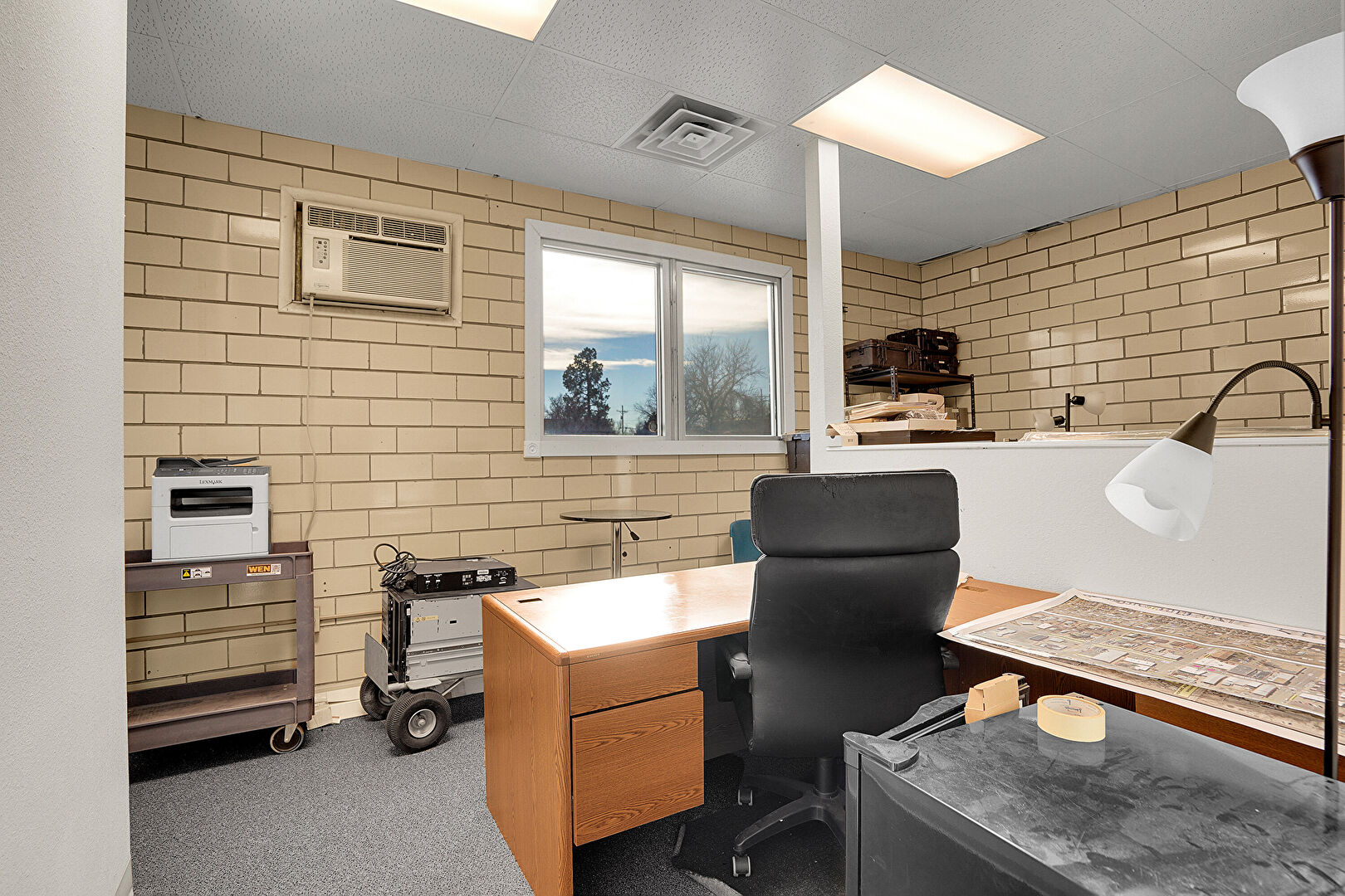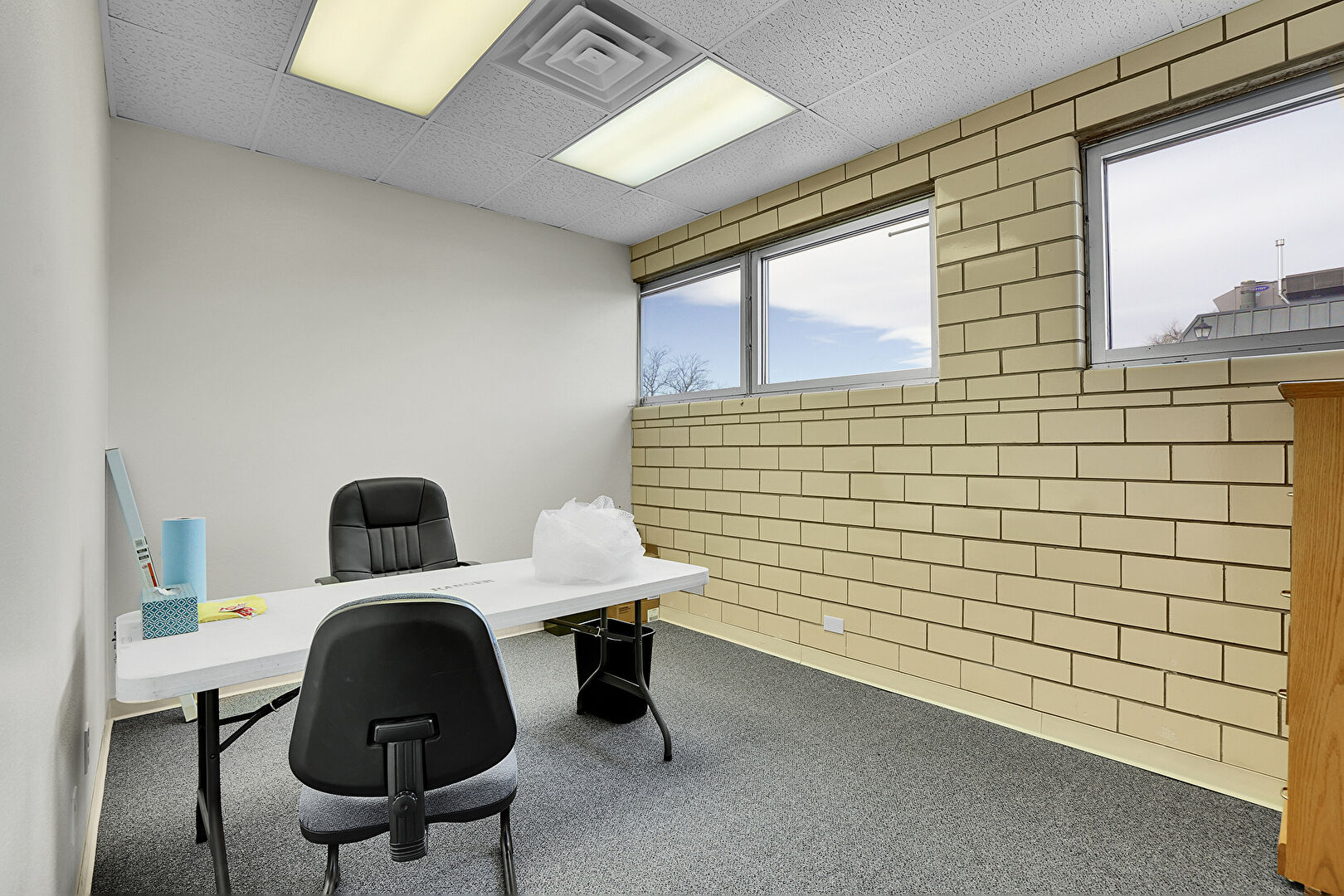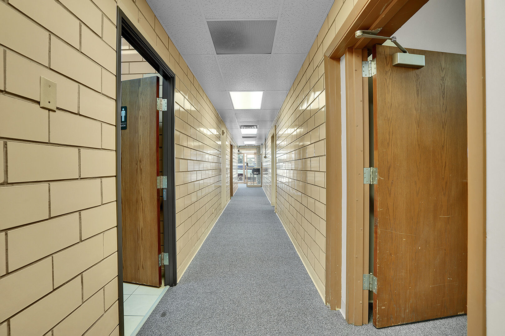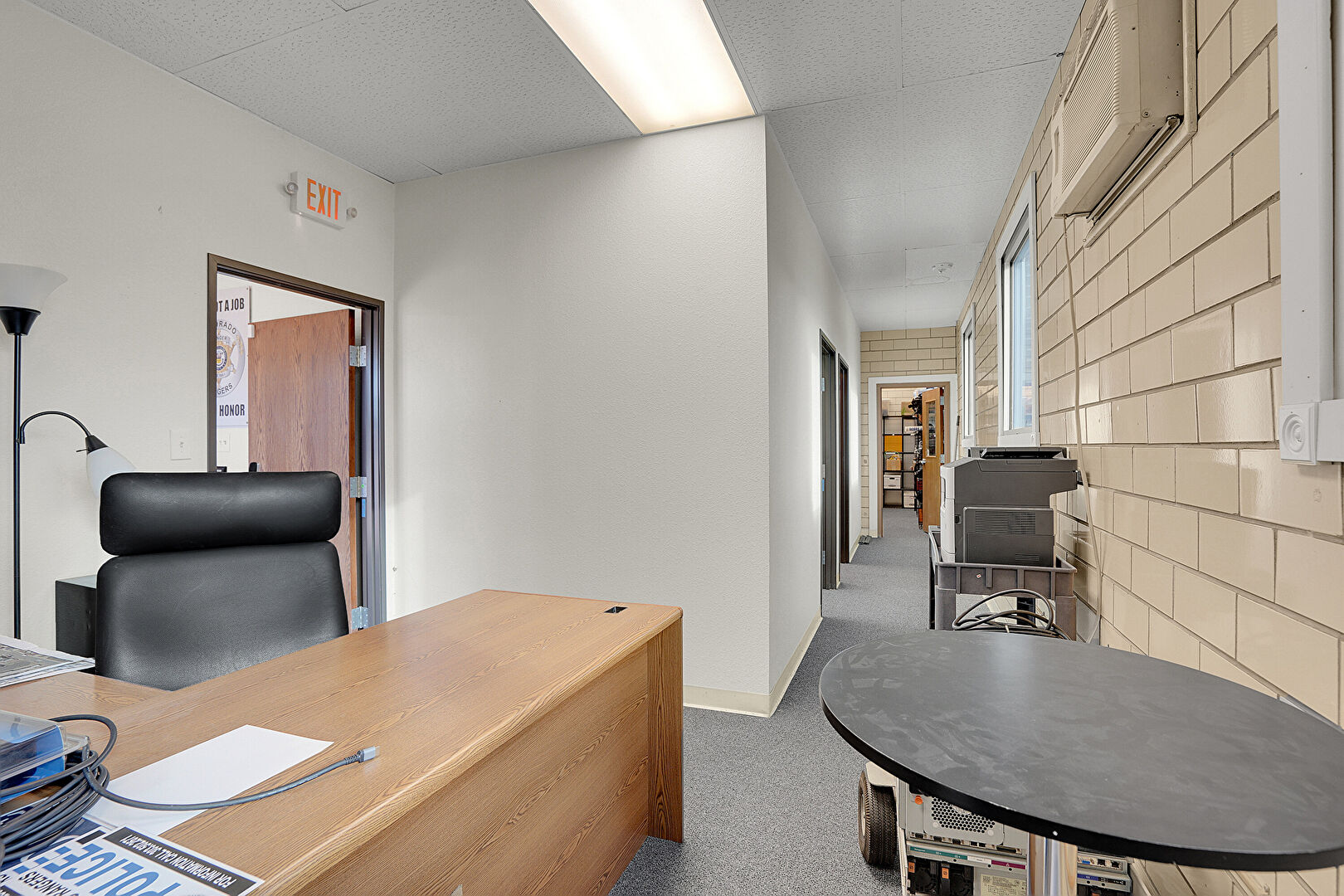 Accent Wall, Baseboard Radiator, Baseboards Wall, Carpet, Drop Ceiling, Drywall, Fire Extinguisher, Natural Light, Office Area, Textured Ceiling, Tile Wall, Vent, Wall Mounted Ac, Baseboards Wall, Brick Wall, Carpet, Drop Ceiling, Drywall, Fire Extinguisher, Natural Light, Office Area, Vent