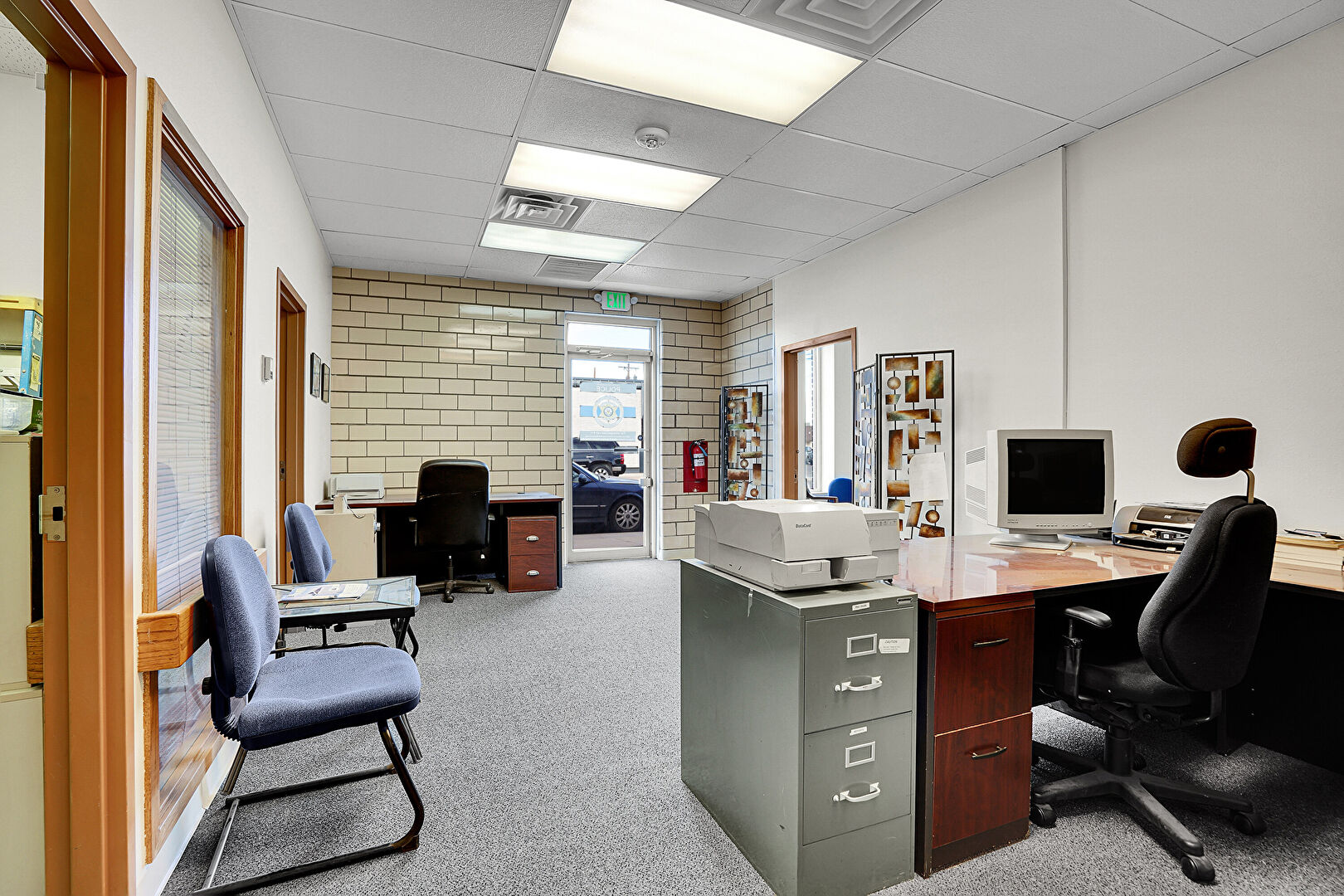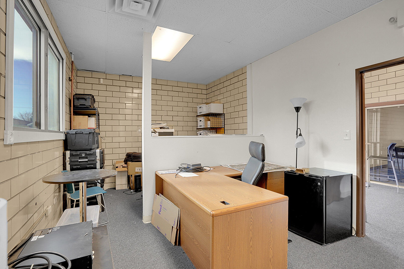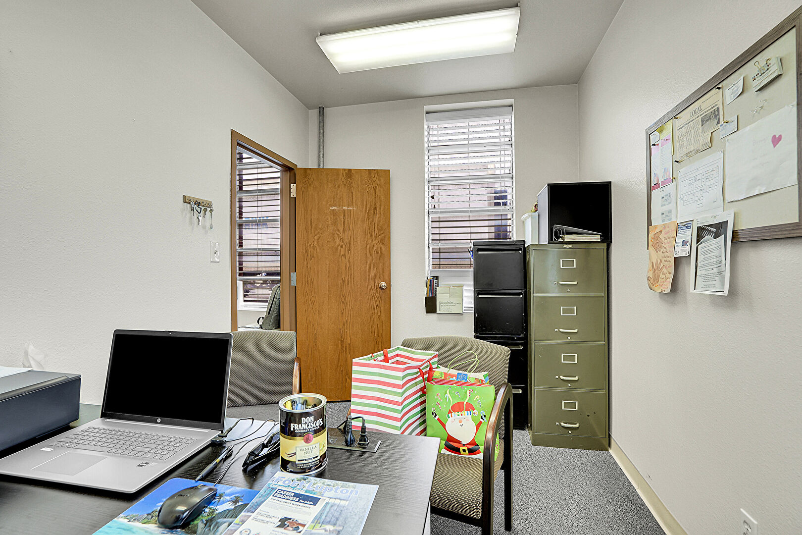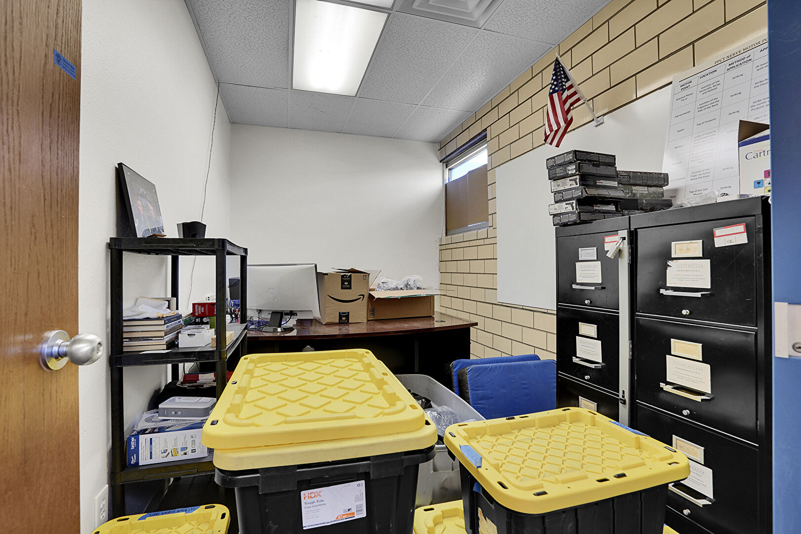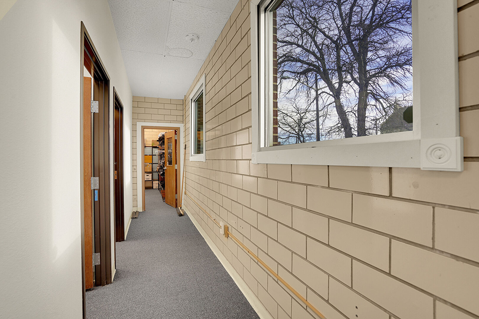 Accent Wall, Baseboard Radiator, Baseboards Wall, Carpet, Drop Ceiling, Drywall, Fire Extinguisher, Natural Light, Office Area, Textured Ceiling, Tile Wall, Vent, Wall Mounted Ac, Baseboards Wall, Brick Wall, Carpet, Drop Ceiling, Drywall, Fire Extinguisher, Natural Light, Office Area, Vent