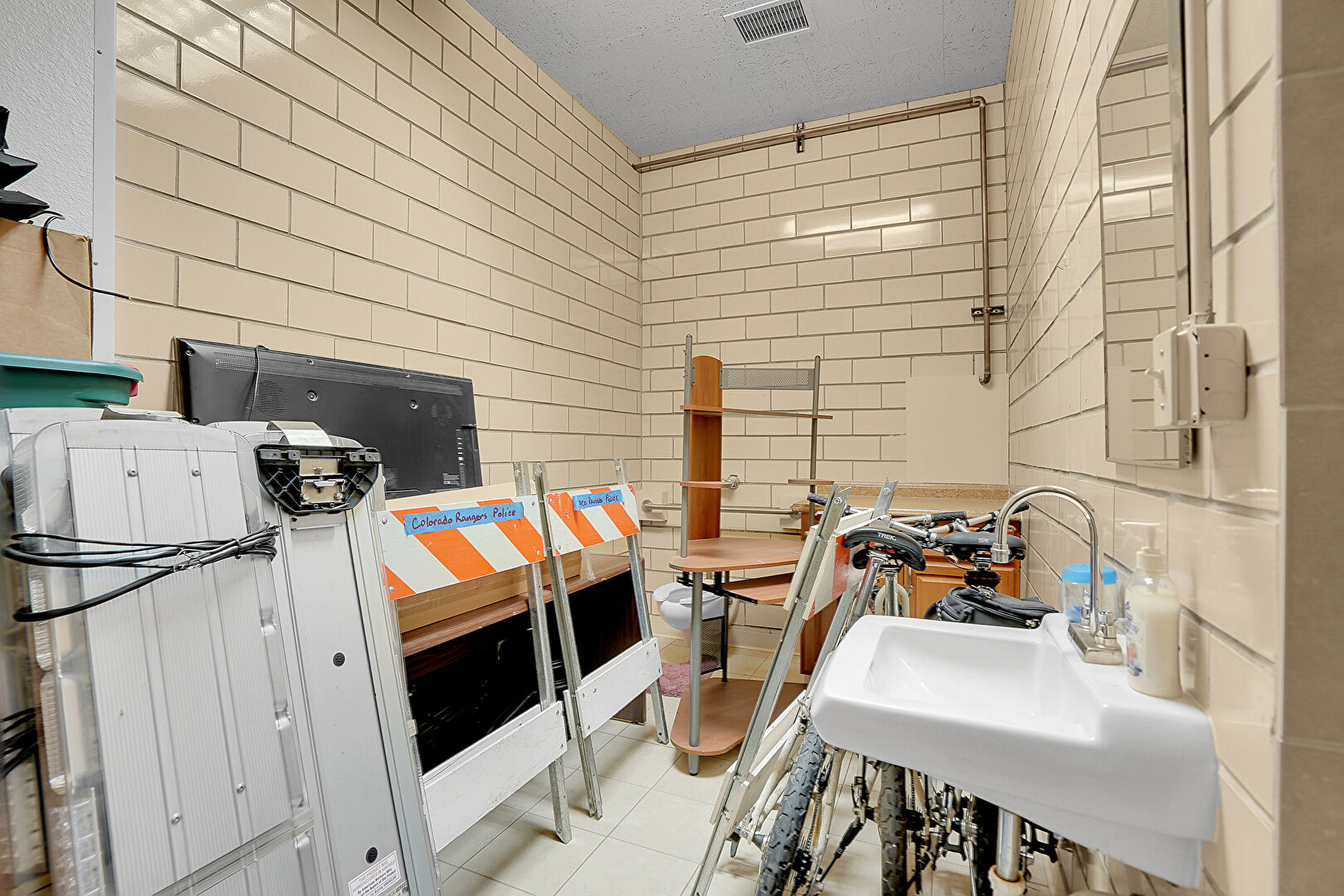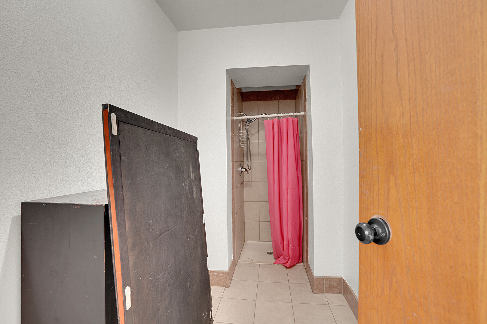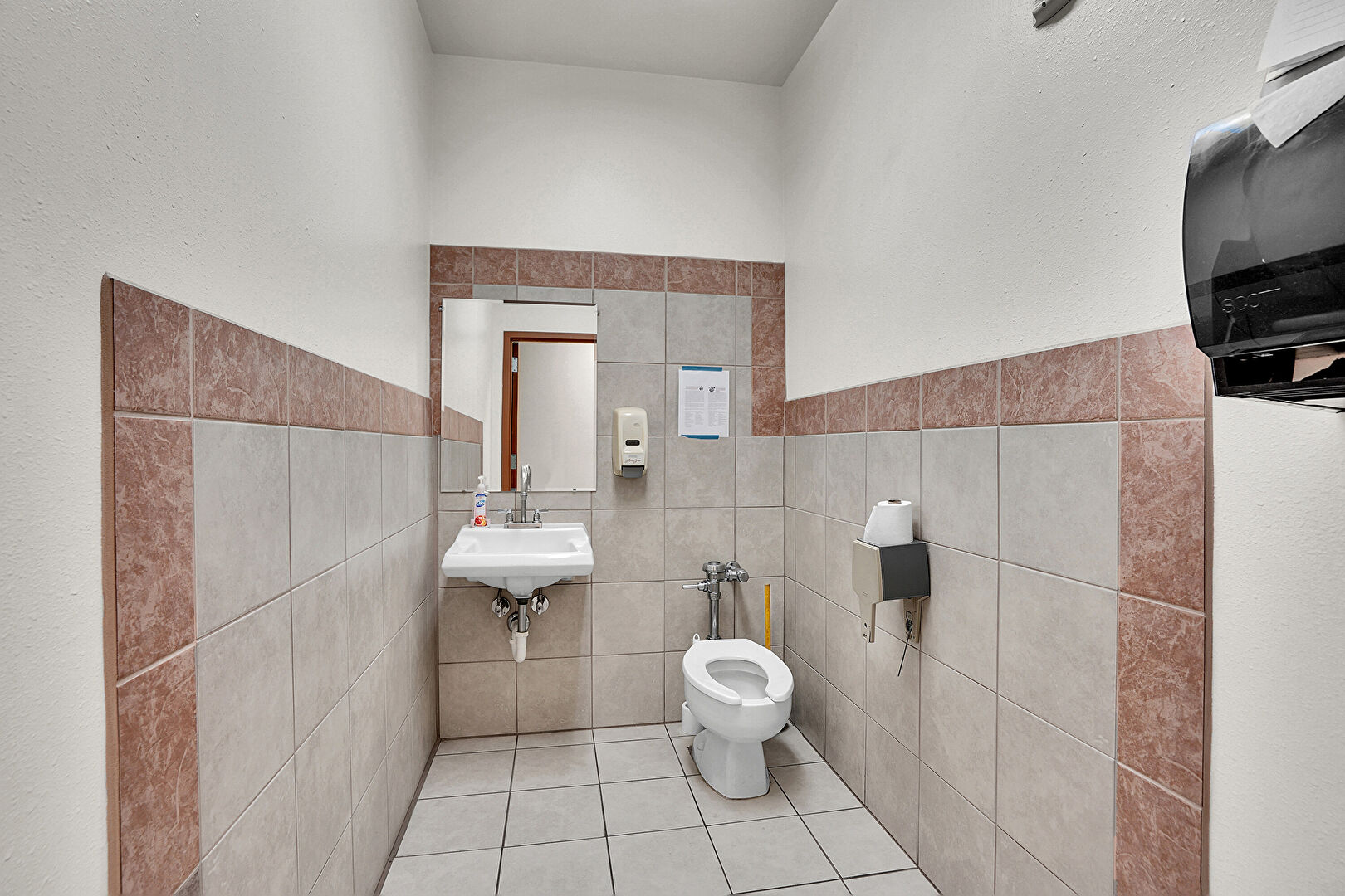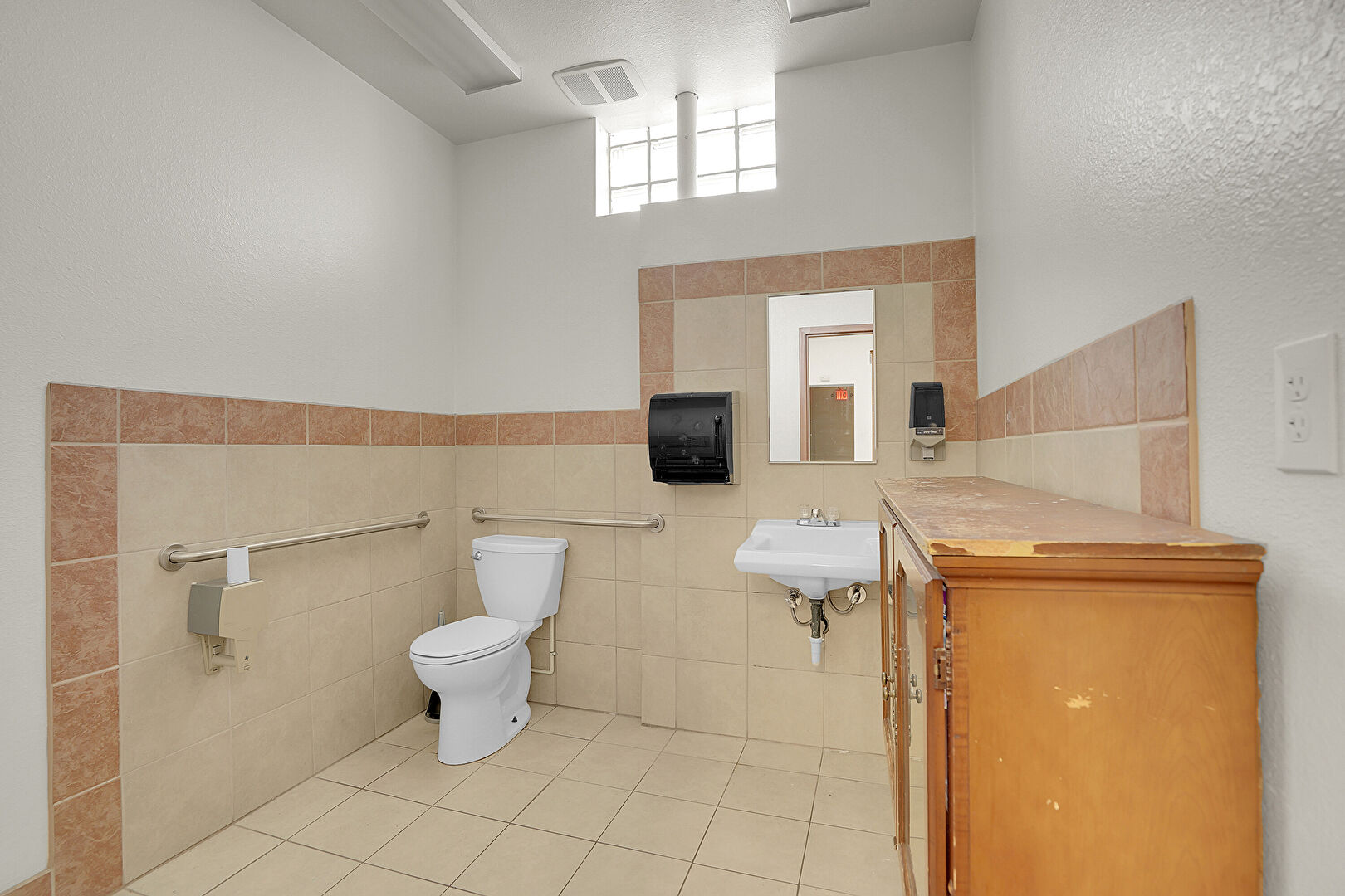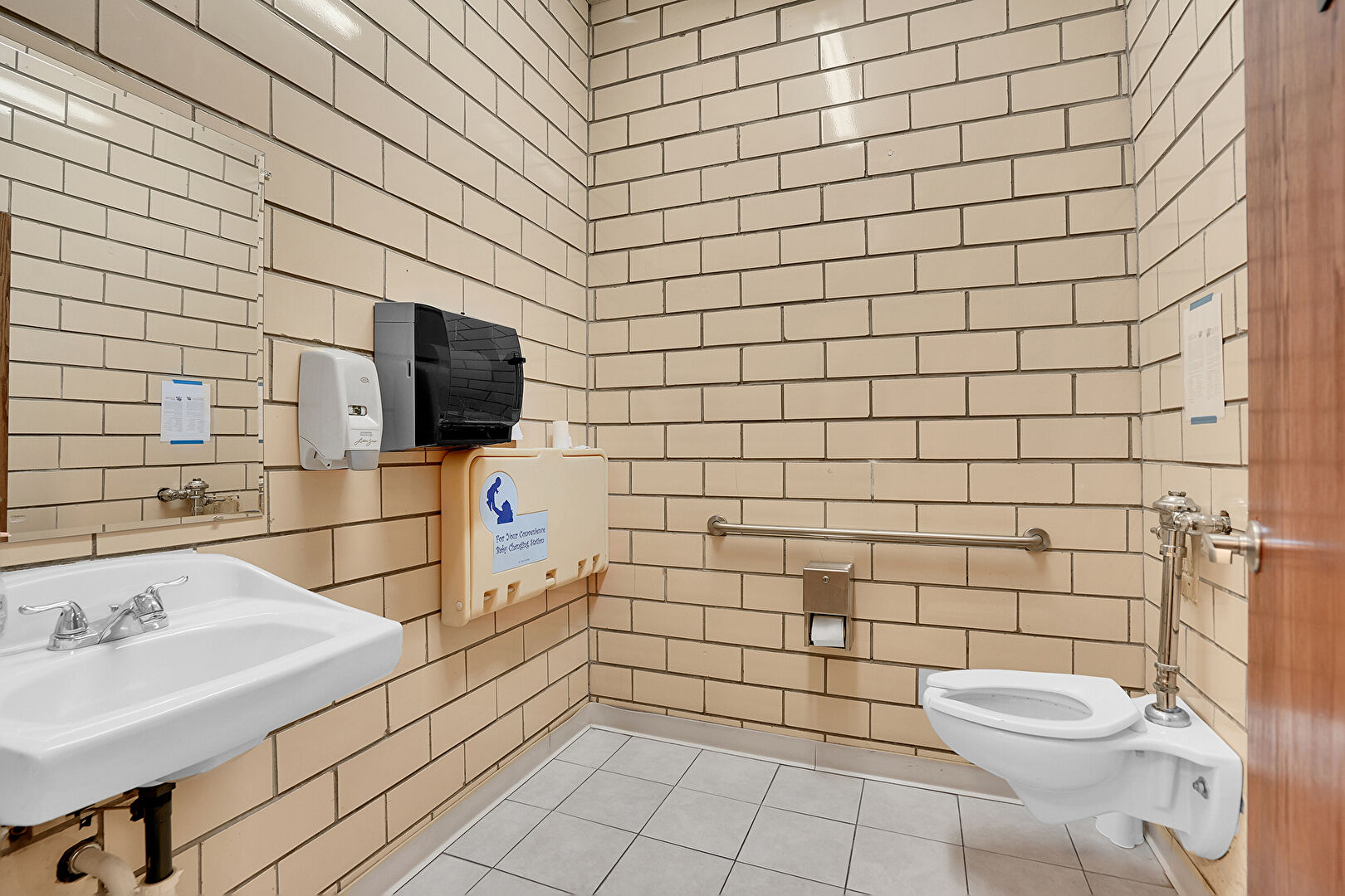 Baseboards Wall, Built In Desk, Carpet, Drywall, Fire Extinguisher, Full Bathroom, Natural Light, Office Area, Smoke Carbon Monoxide Detector, Textured Wall, Tile Floor, Tile Wall, Vent, Wainscot Wall, Baseboards Wall, Carpet, Drywall, Half Bathroom, Natural Light, Office Area, Tile Floor, Vent