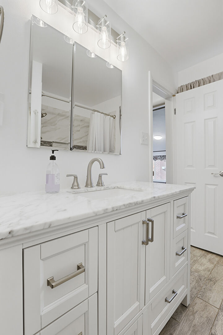 Baseboards Wall, Combined Bath Shower, Drywall, Full Bathroom, Tile Wall, Vanity, Wainscot Wall, Wood Finish Floor, Full Bathroom, Natural Light, Vanity, Wood Finish Floor