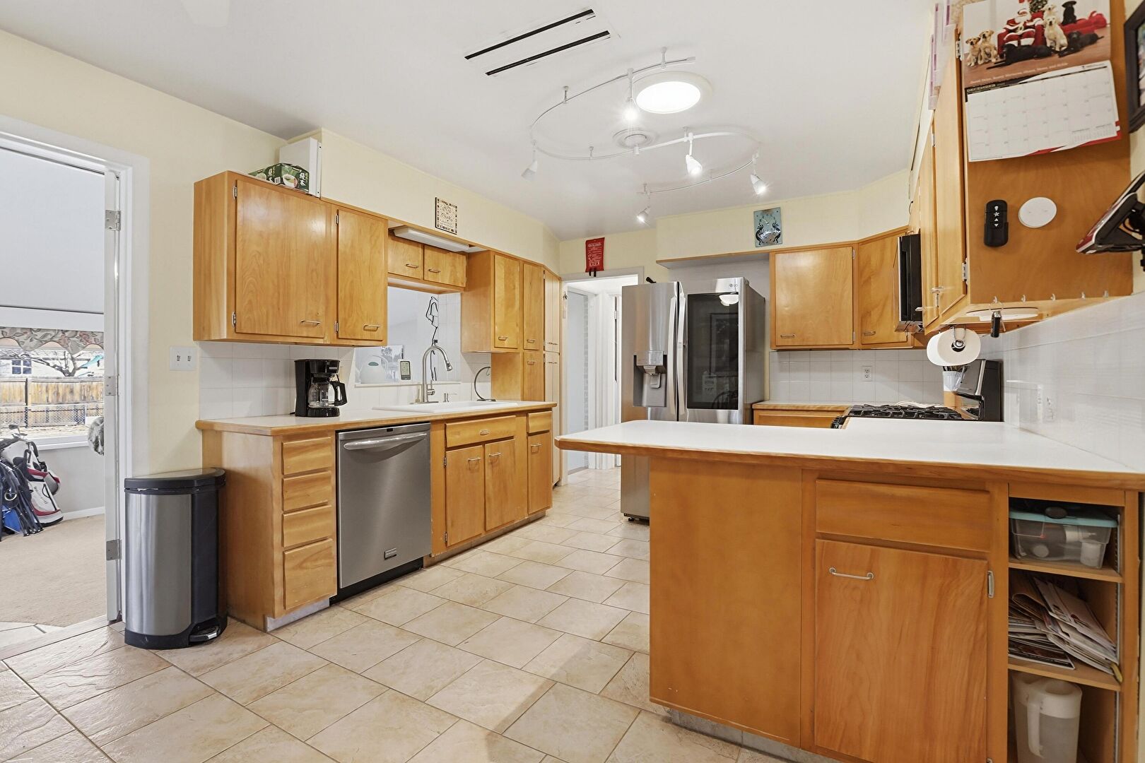 Baseboards Wall, Drywall, G Shaped Kitchen, Glass Insert Cabinets, Kitchen Bar, Kitchen Peninsula, Medium Brown Cabinets, Natural Light, Open Shelves, Pass Through Window, Recessed Lighting, Tile Floor, Vent, Vinyl Floor, Visible Hinge Cabinets, Wood Wall, Baseboards Wall, Kitchen Peninsula, Track Lighting, Visible Hinge Cabinets
