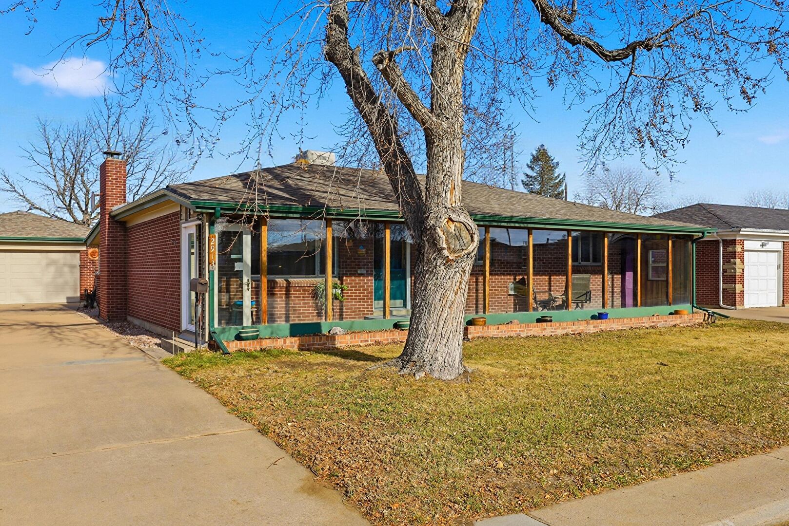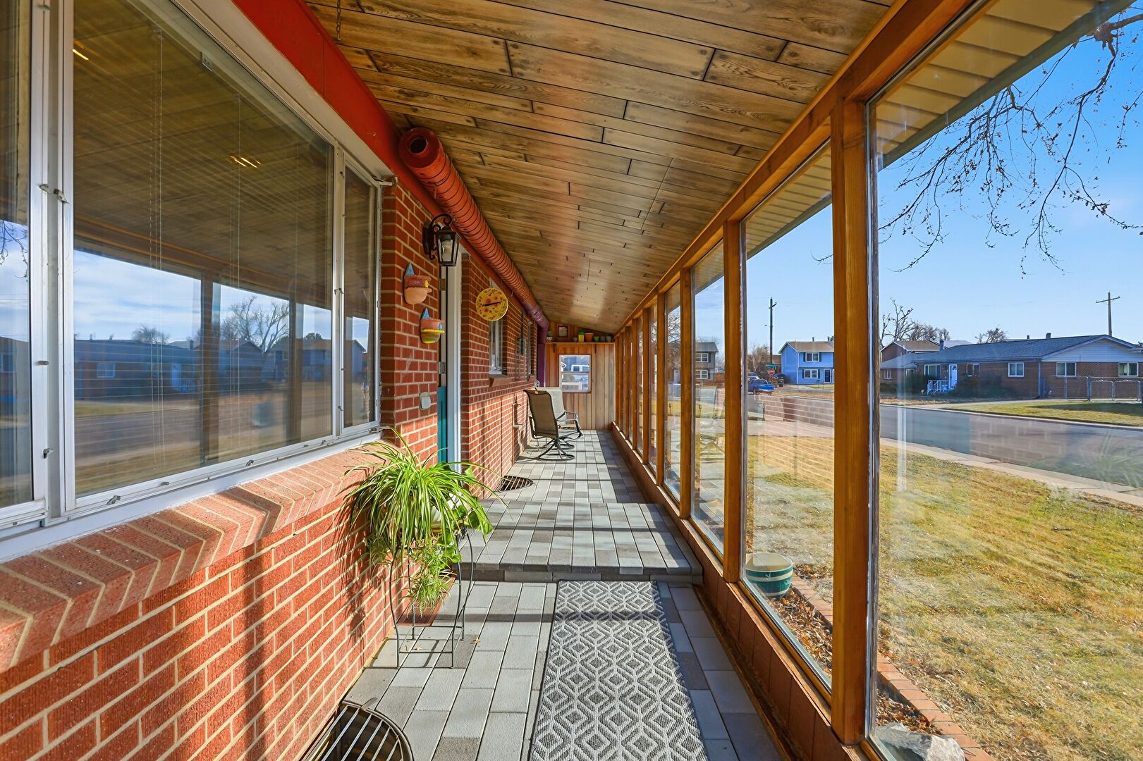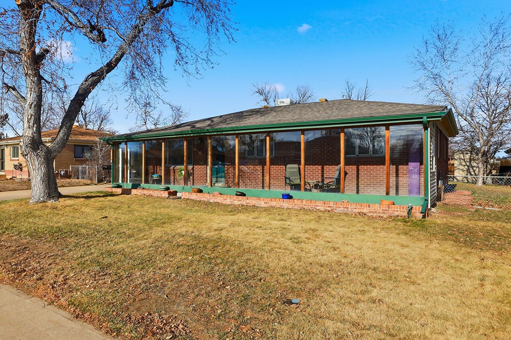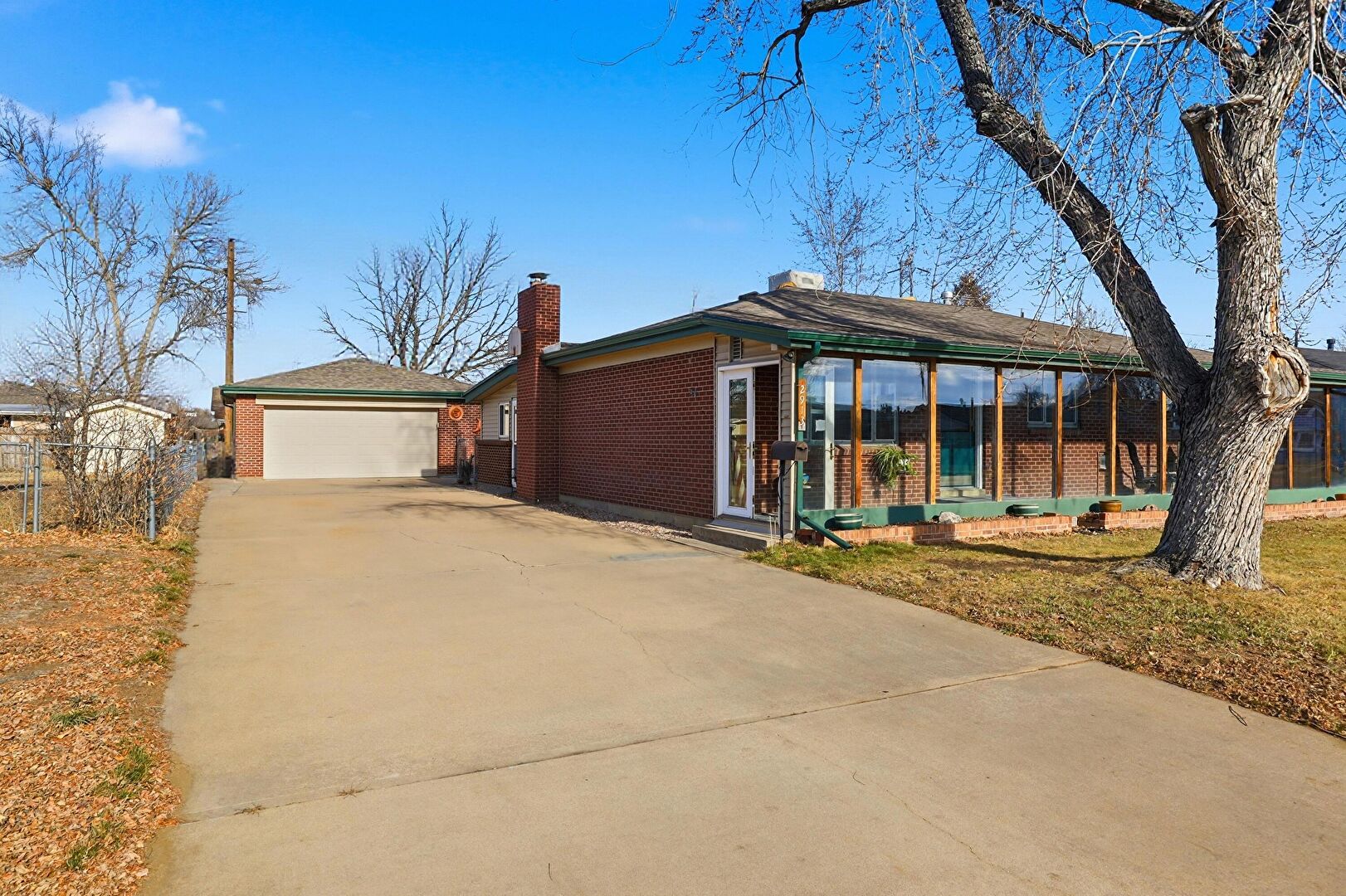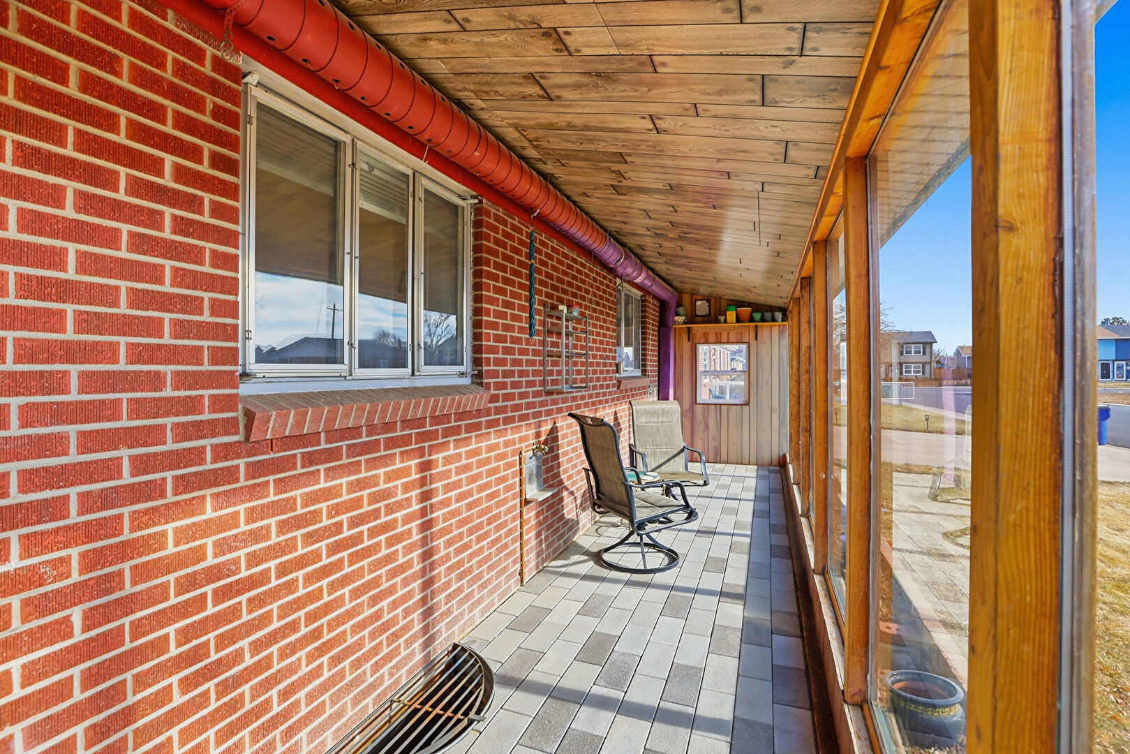 Brick Siding, Chimney, Concrete Foundation, Downspout, Driveway, Fence, Garage, Gutters, Lawn, Outdoor Structure, Porch, Shingle Roof, Sunroom, Downspout, Gutters, Horizontal Siding, Lawn