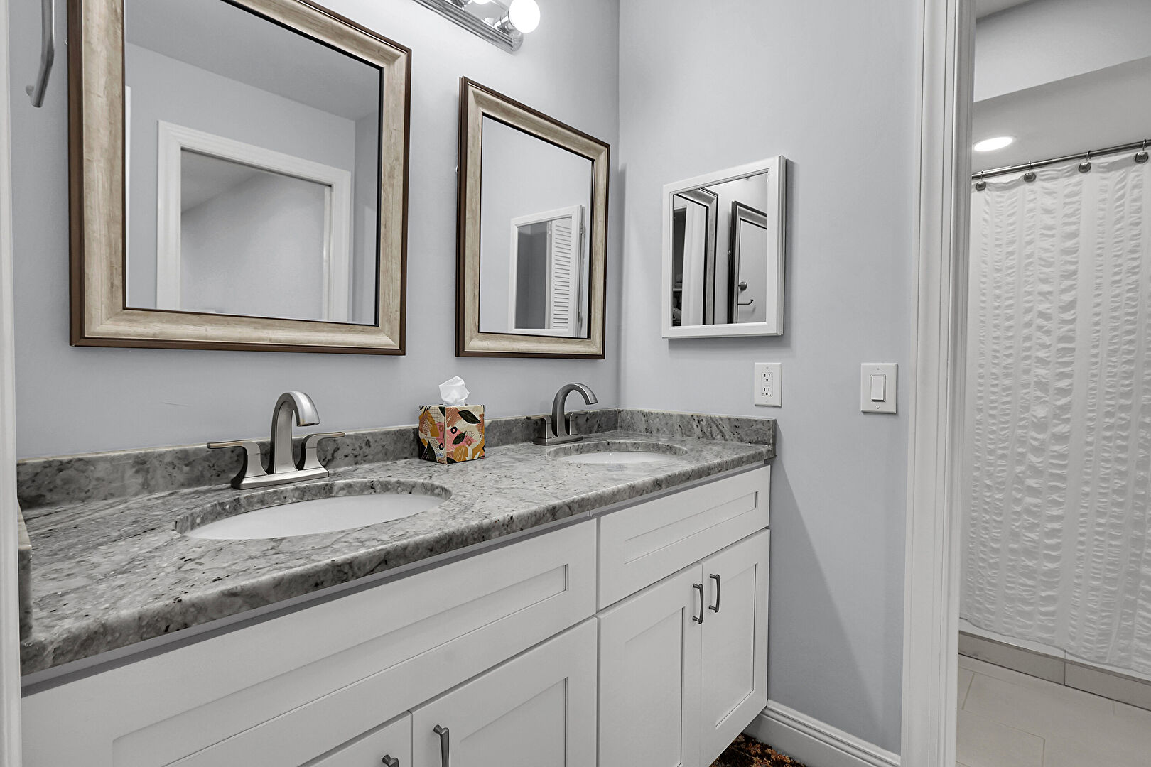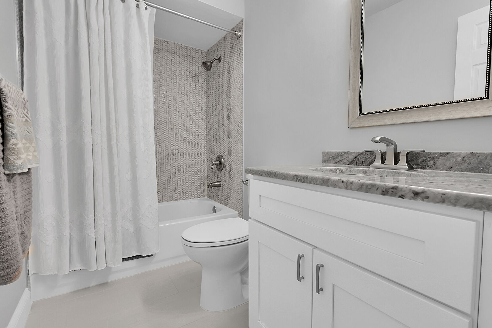 Baseboards Wall, Combined Bath Shower, Drywall, Full Bathroom, Natural Light, Tile Floor, Vanity, Combined Bath Shower, Tile Floor, Vanity