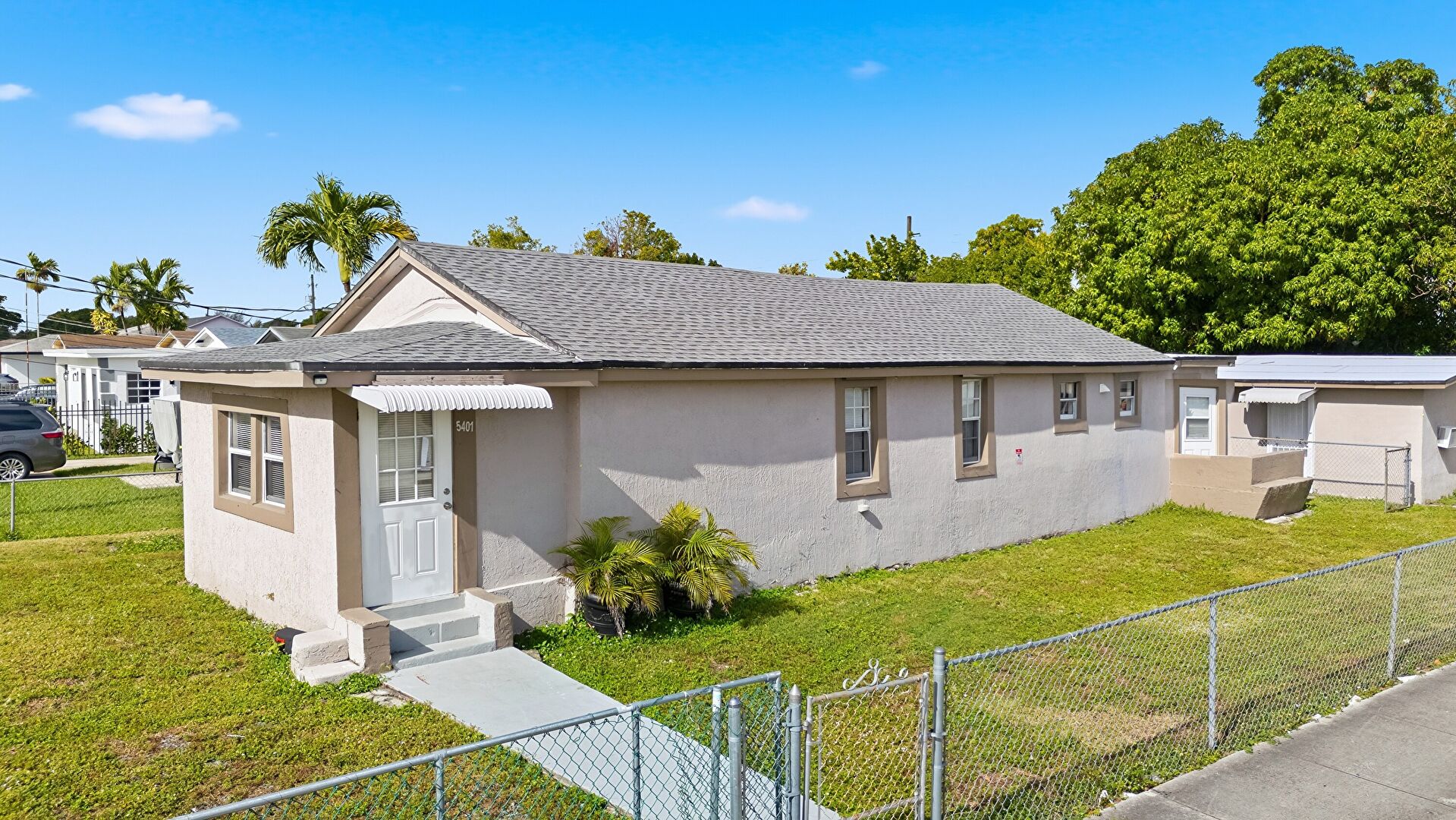 Awning, Fence, Gate, Lawn, Stoop, Stucco Siding, Shingle Roof