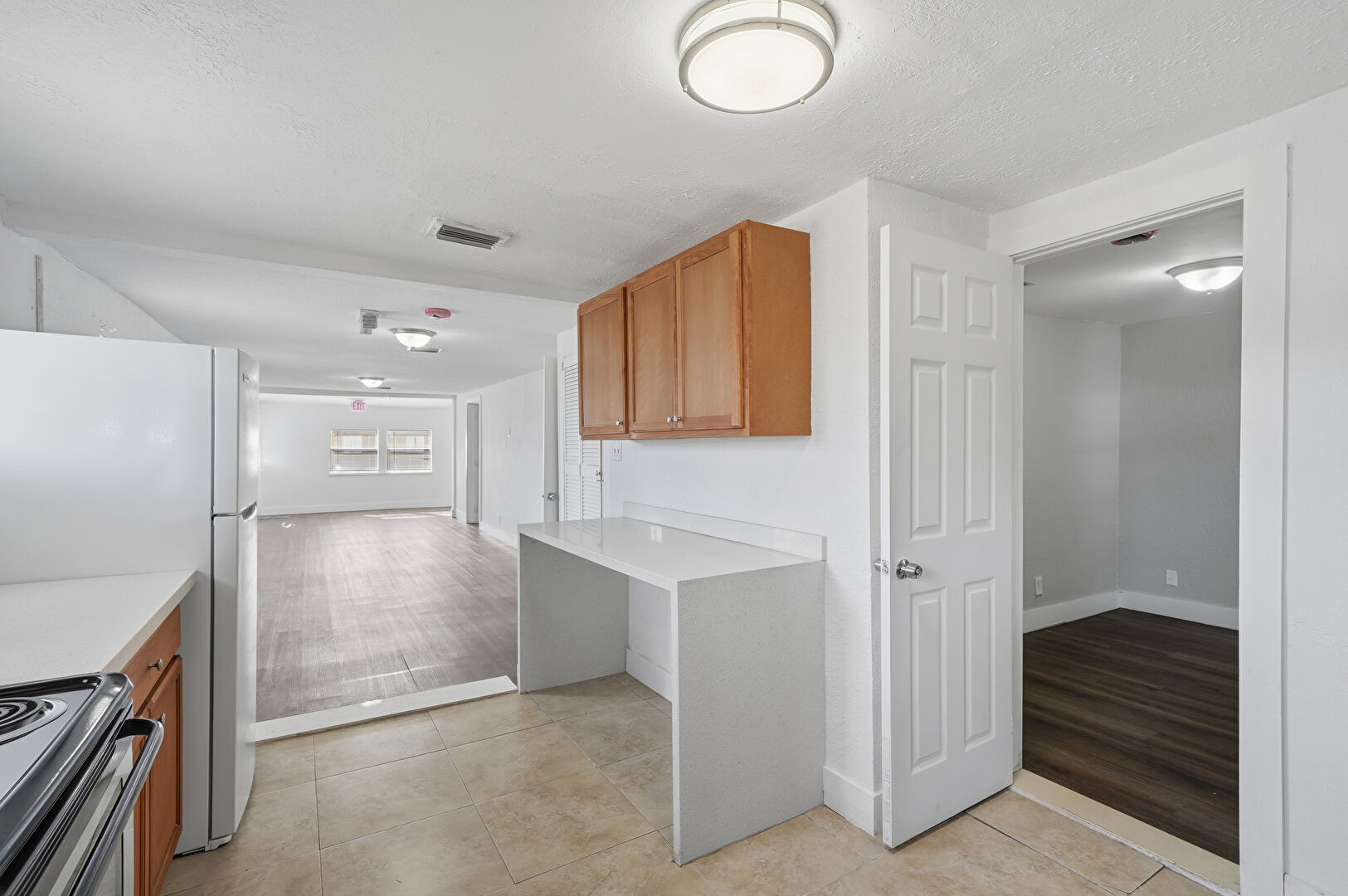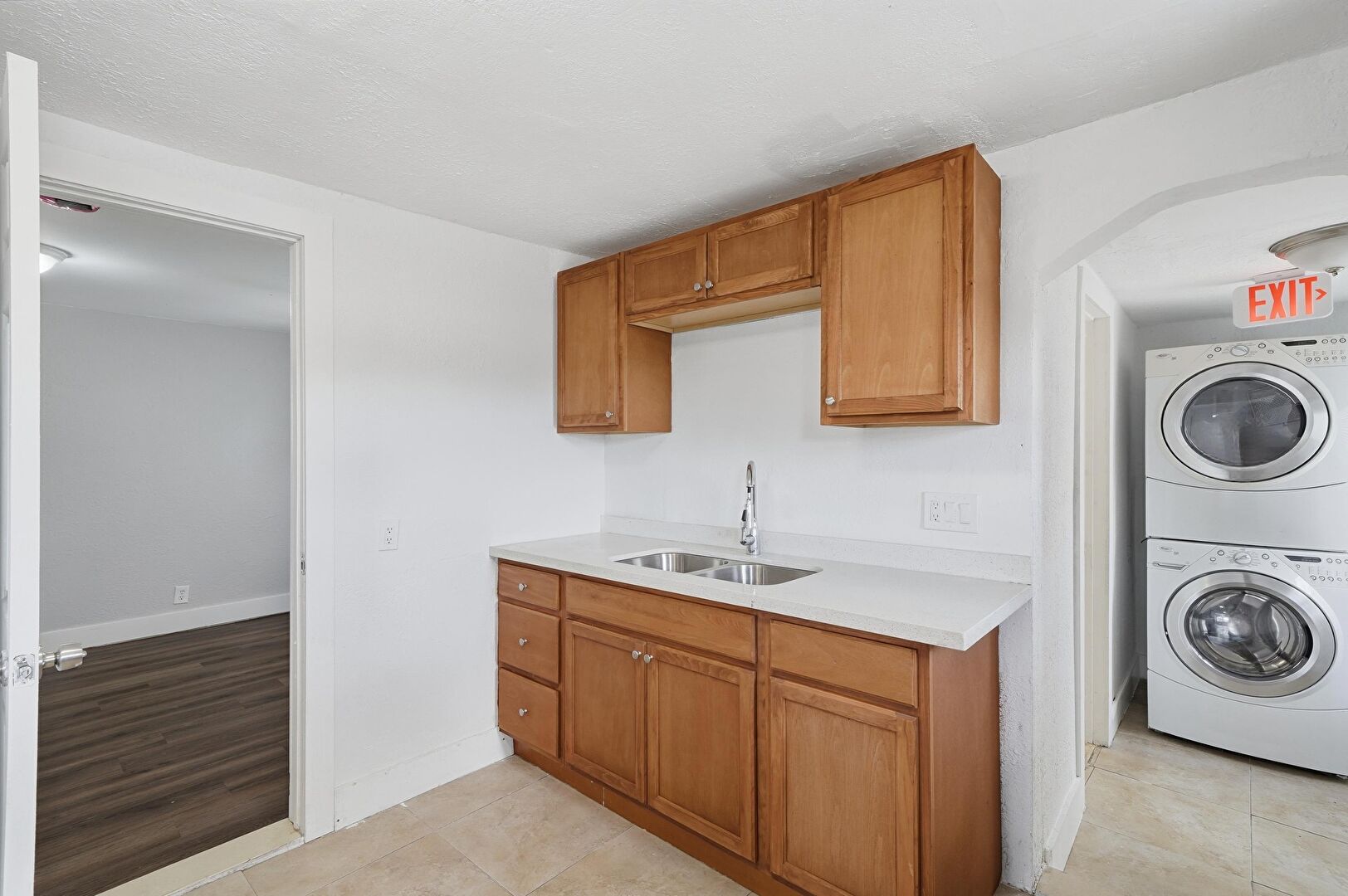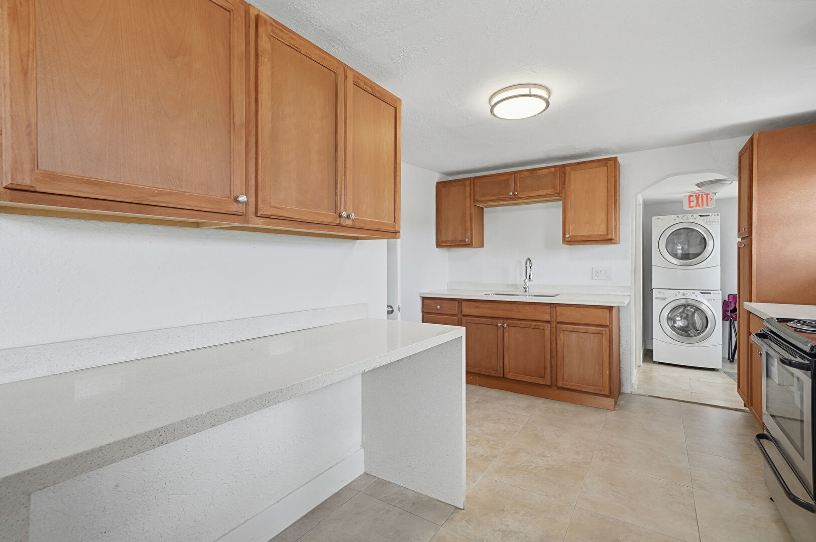 Arched Walkways, Baseboards Wall, Drywall, Electric Panel, Laundry, Medium Brown Cabinets, Natural Light, Opens To Living Area, Shaker Cabinets, Stone Countertops, Textured Ceiling, Textured Wall, Tile Floor, Vent, Wood Finish Floor, Arched Walkways, Laundry, Stone Countertops, Textured Wall, Tile Floor