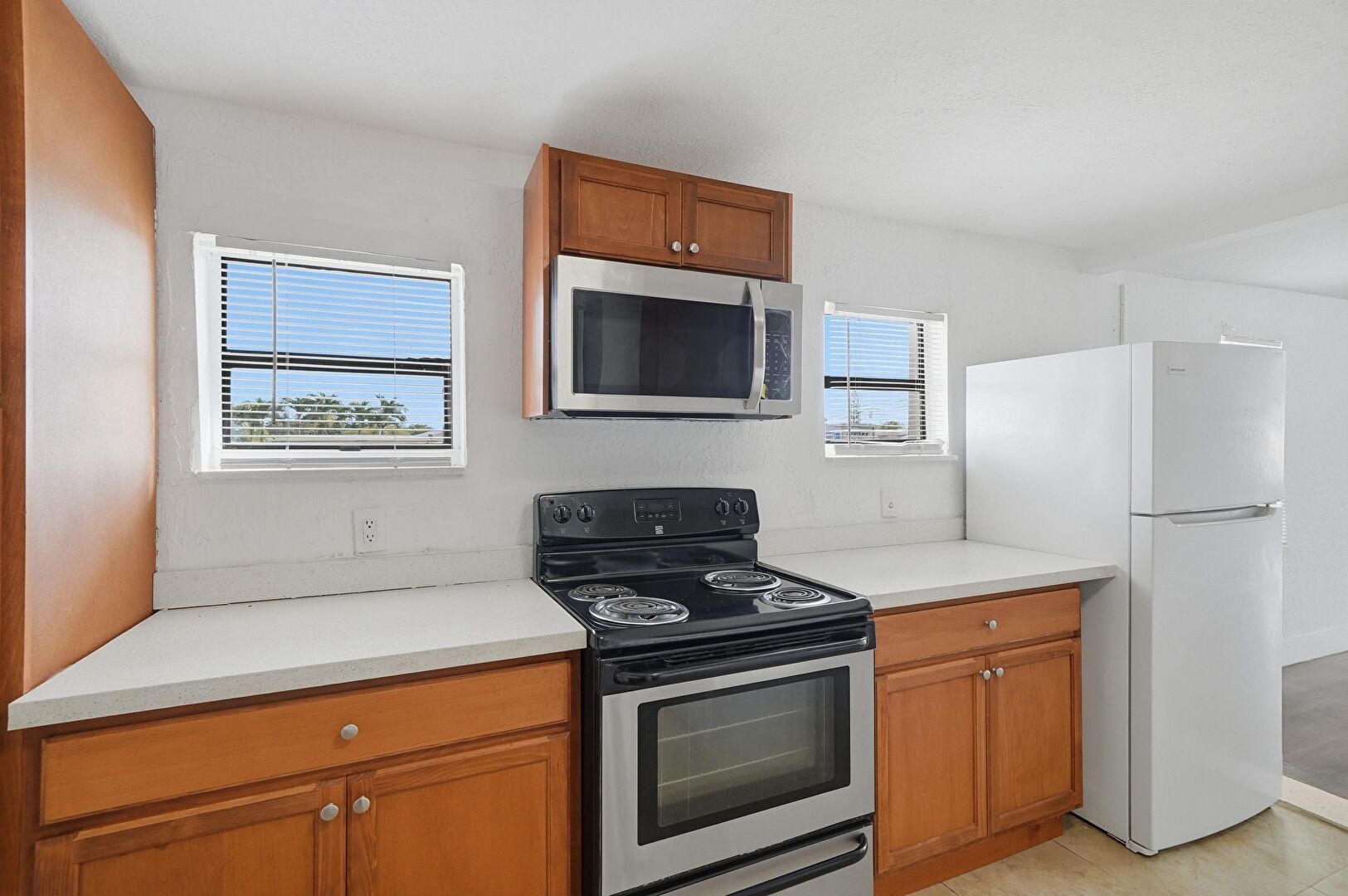 Baseboards Wall, Drywall, Fire Alarm, Laundry, Medium Brown Cabinets, Natural Light, Shaker Cabinets, Textured Ceiling, U Shaped Kitchen, Vent, Wood Finish Floor, Baseboards Wall, Textured Ceiling
