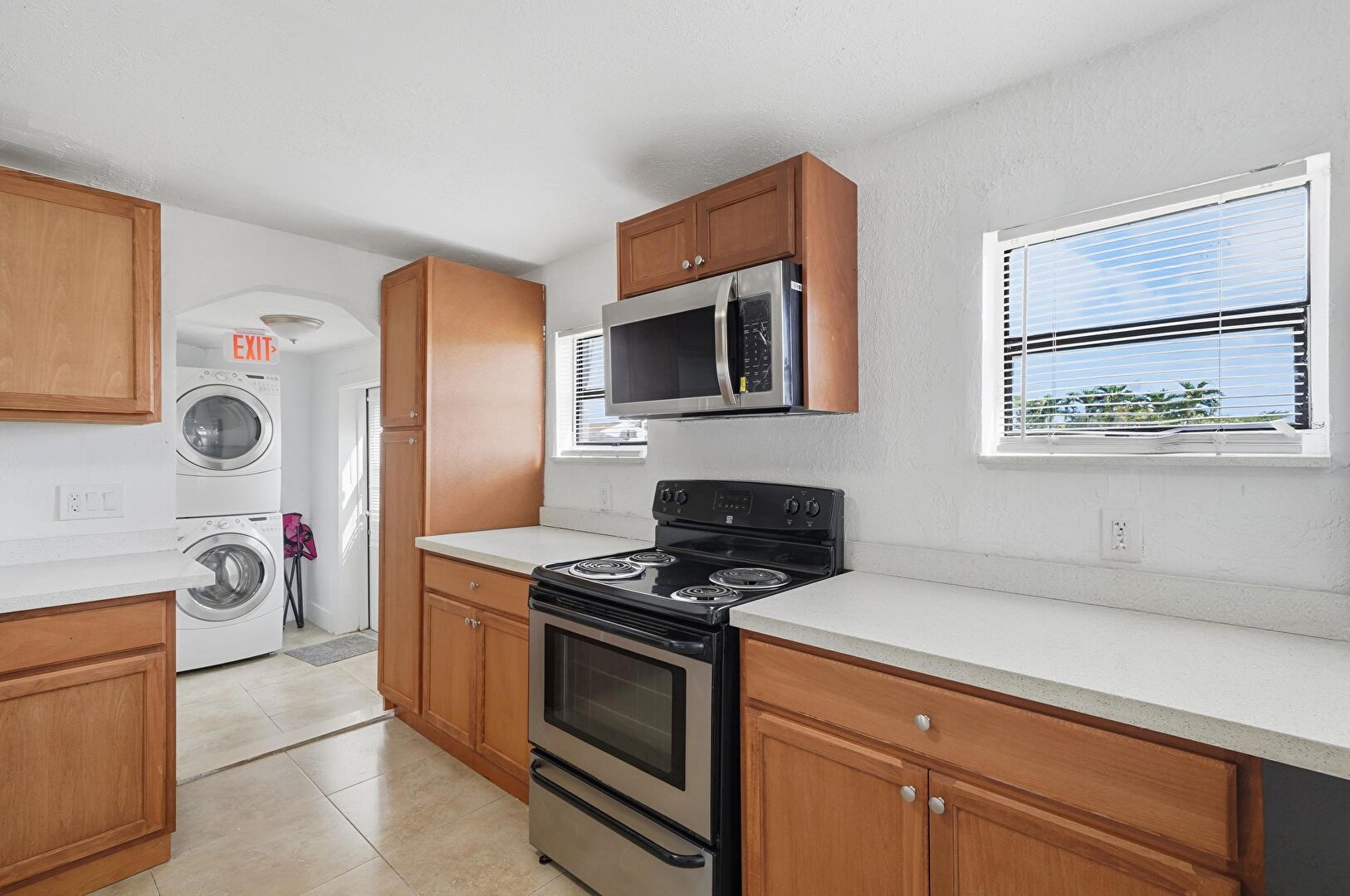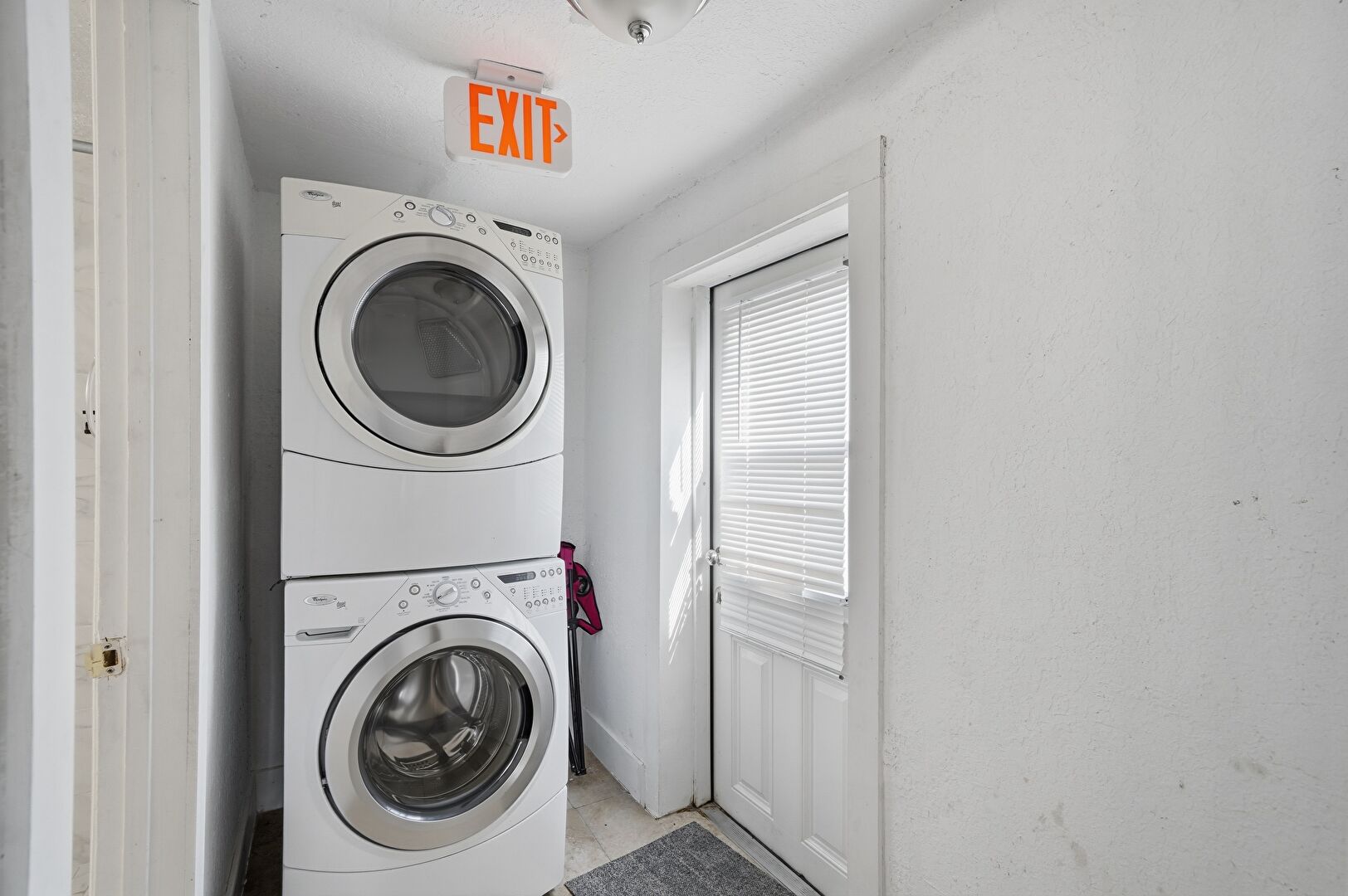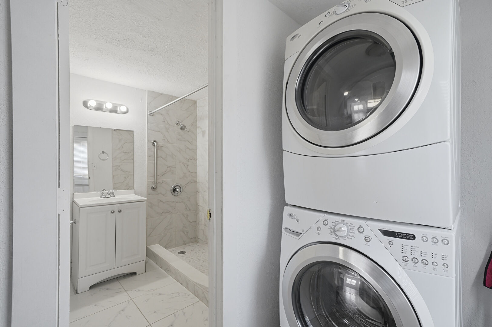 Baseboards Wall, Drywall, Laundry, Marble Finish Floor, Natural Light, Textured Ceiling, Tile Floor, Arched Walkways, Laundry
