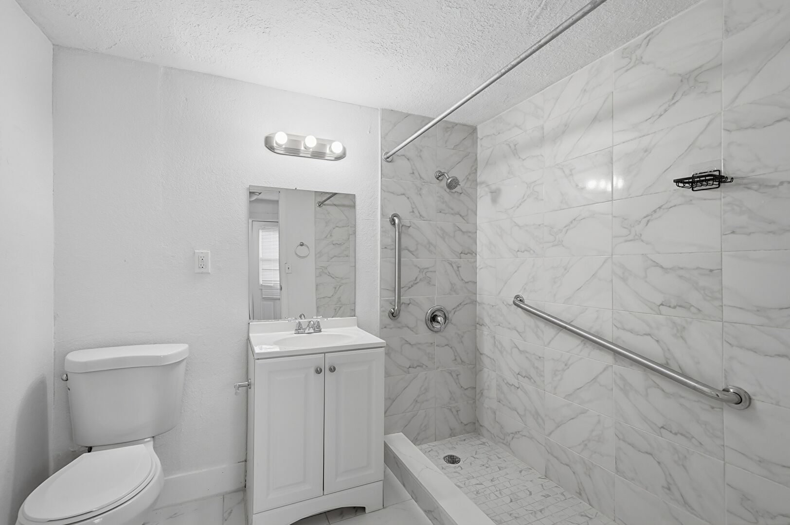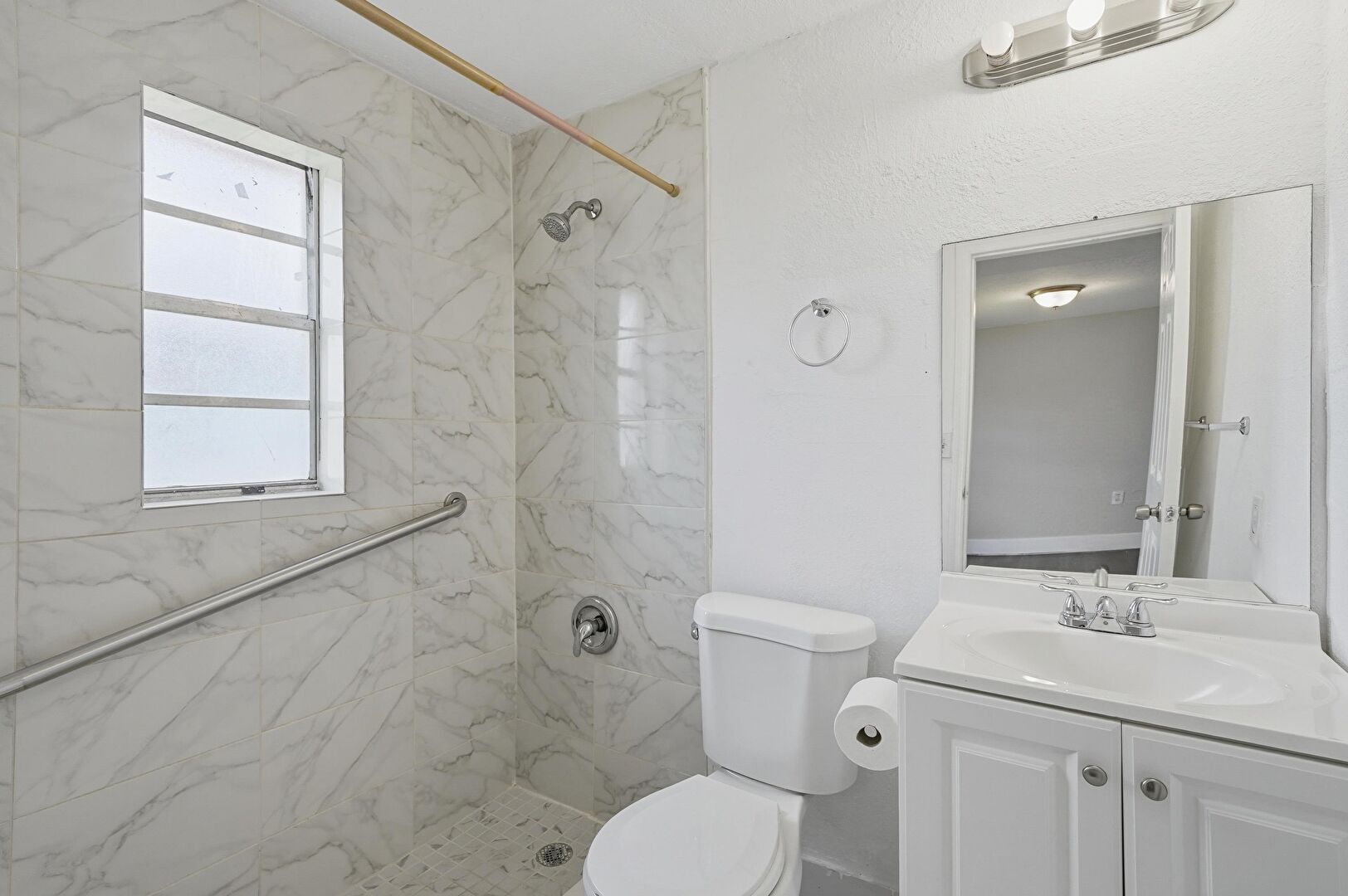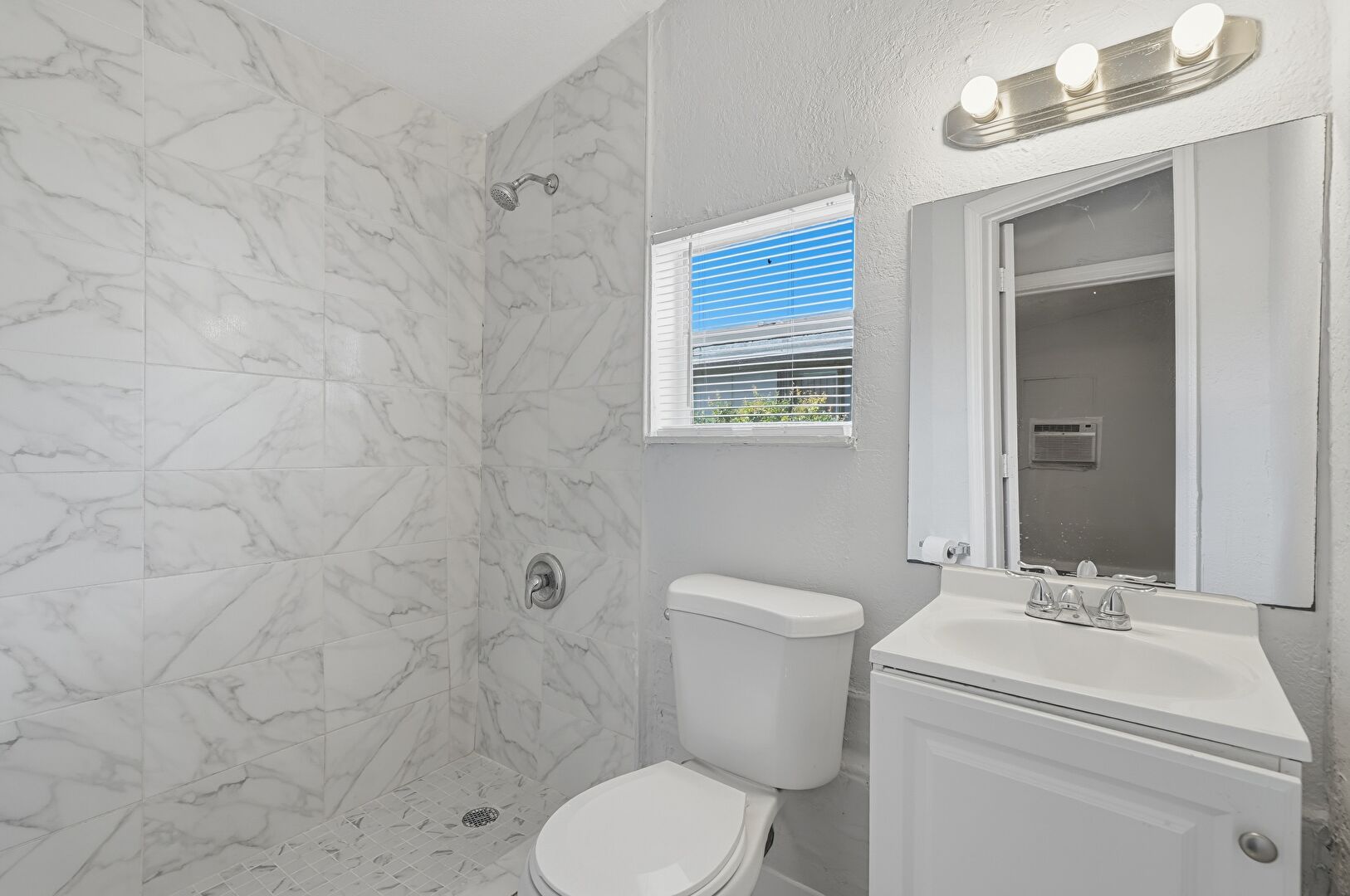 Baseboards Wall, Drywall, Marble Finish Floor, Natural Light, Textured Ceiling, Textured Wall, Vanity, Wall Mounted Ac, Full Bathroom