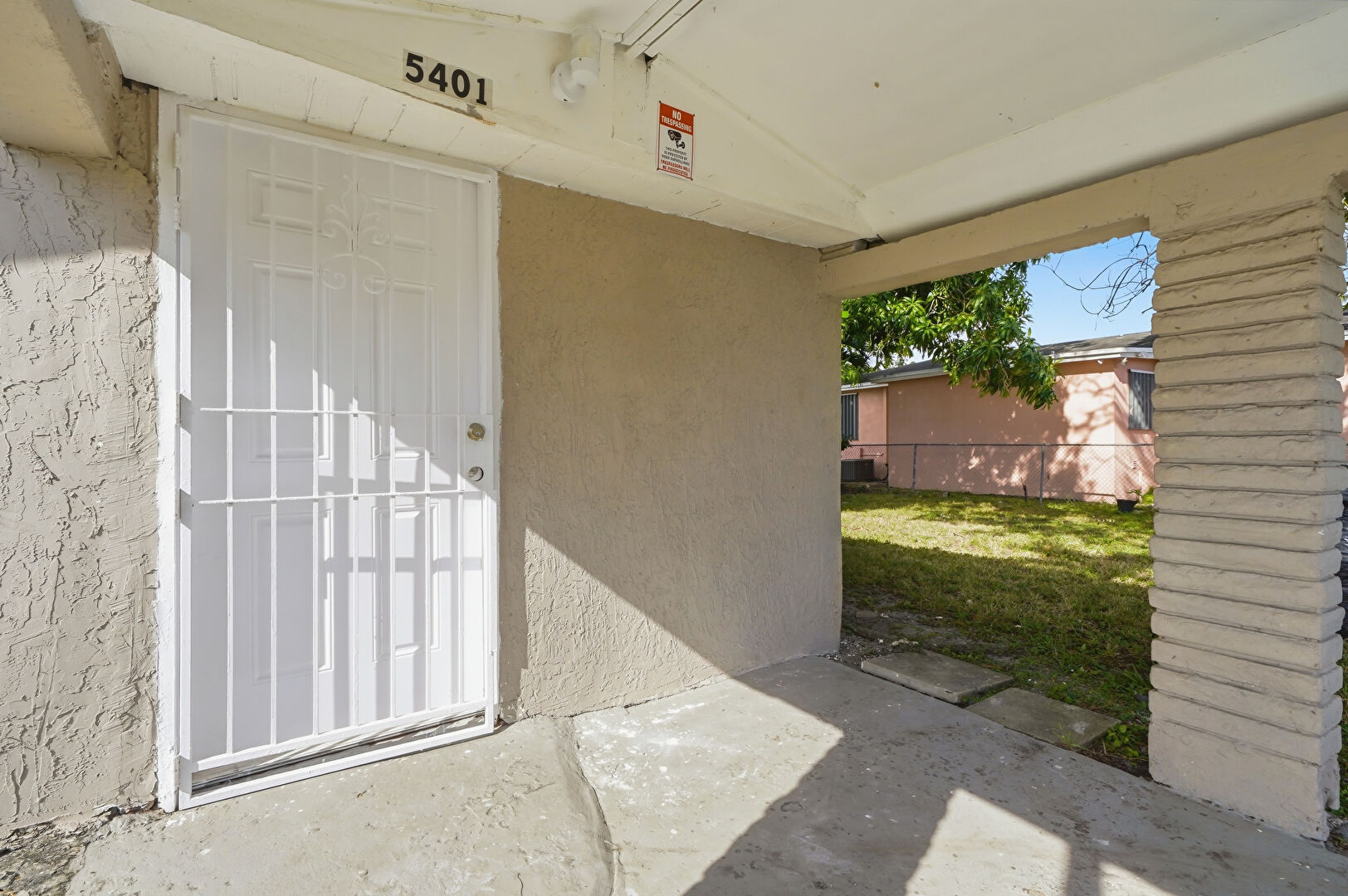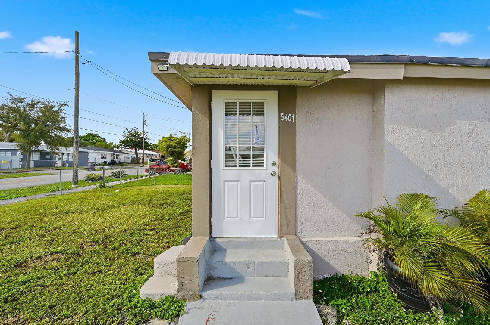 Awning, Fence, Lawn, Residential View, Stucco Siding, Patio, Stoop
