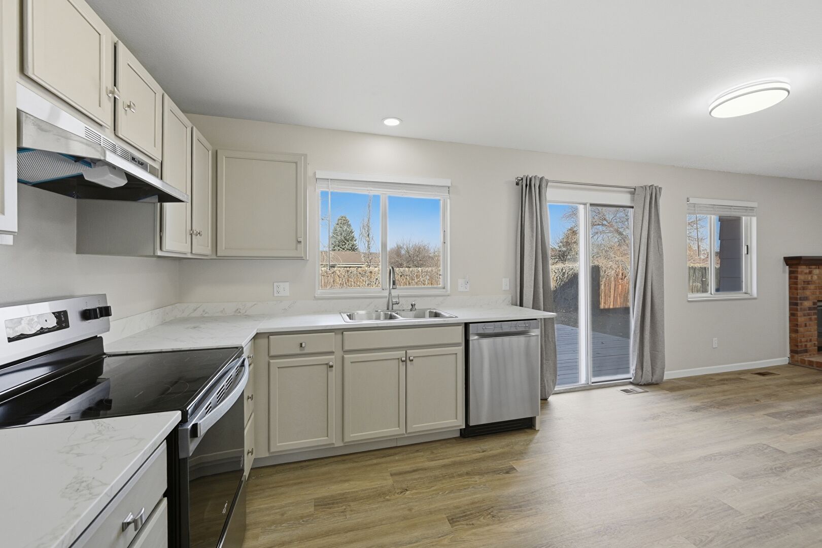 Baseboards Wall, Drywall, Gray Cabinets, L Shaped Kitchen, Natural Light, Recessed Lighting, Shaker Cabinets, Stone Countertops, Upstairs Landing, Wood Finish Floor, Natural Light, Shaker Cabinets