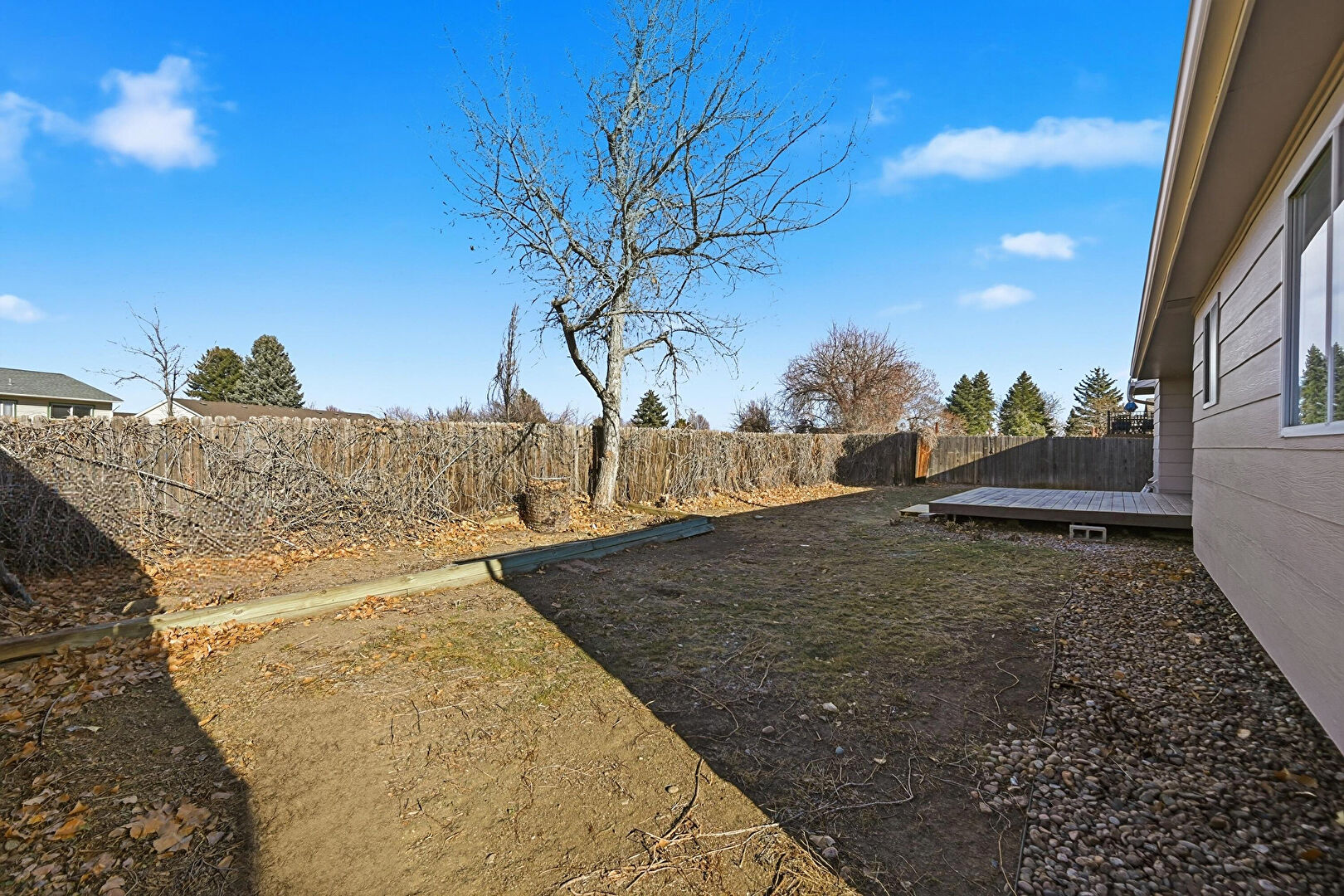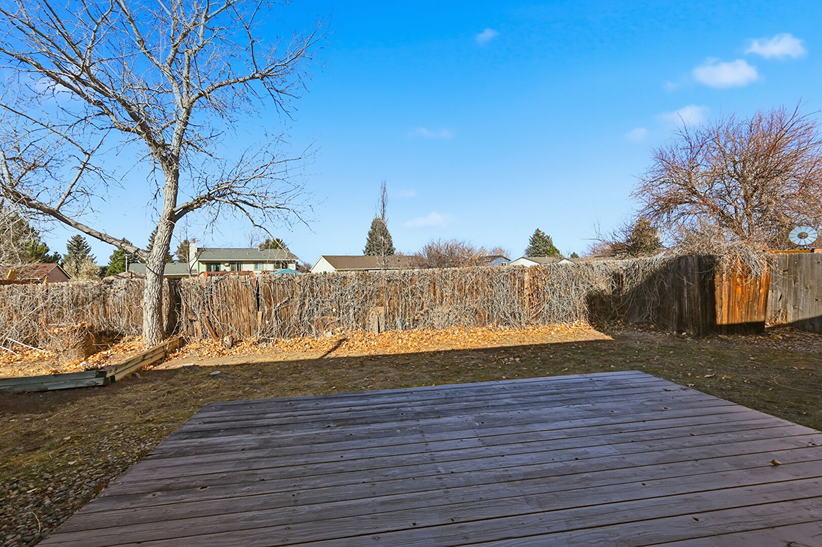 Chimney, Concrete Foundation, Deck, Downspout, Fence, Gutters, Horizontal Siding, Lawn, Shingle Roof