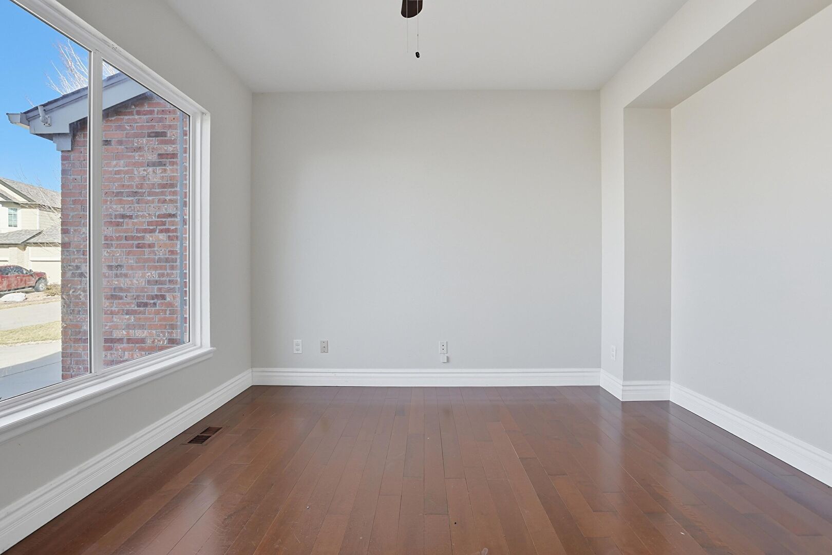 Baseboards Wall, Ceiling Fan, Drywall, Vent, Wood Finish Floor, Natural Light