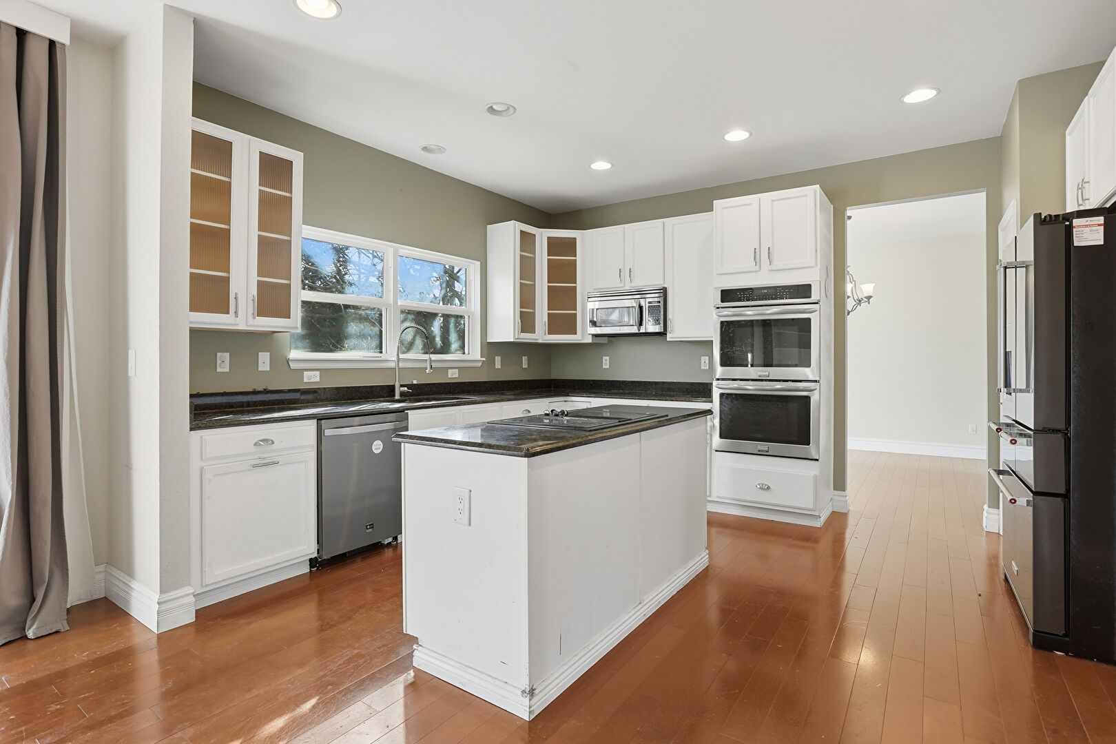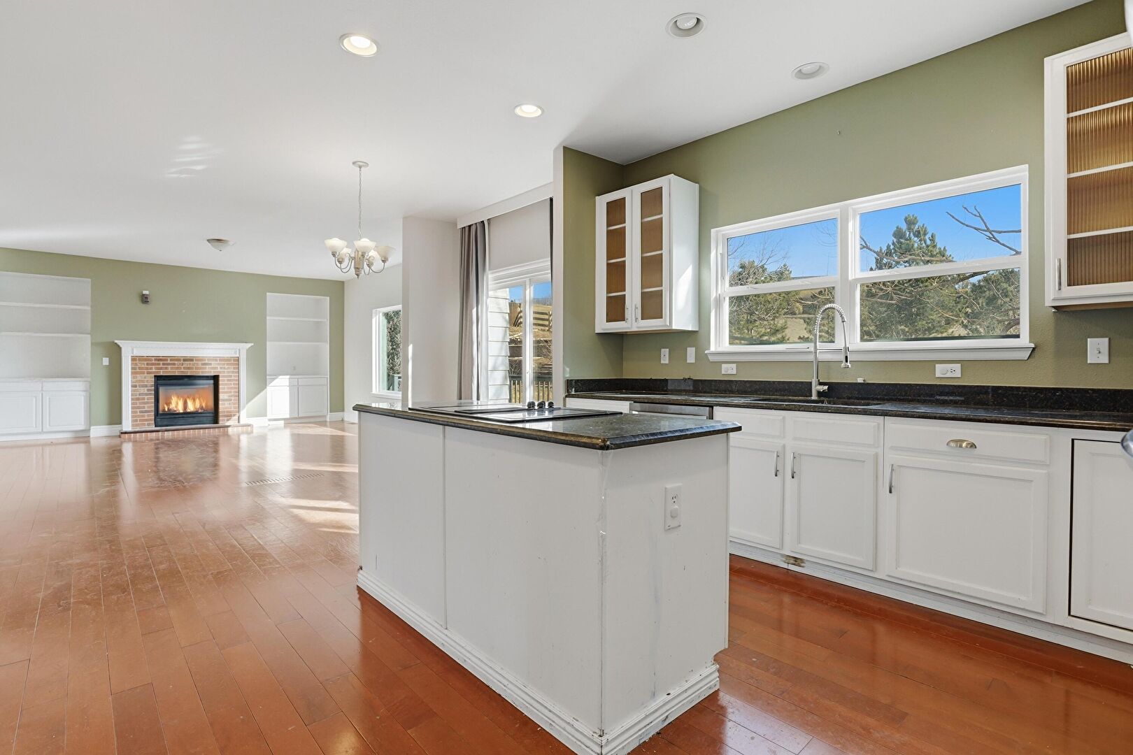 Baseboards Wall, Built In Shelves, Double Oven, Drywall, Glass Insert Cabinets, Kitchen Island, Natural Light, Notable Chandelier, Opens To Living Area, Pendant Lighting, Recessed Lighting, Shaker Cabinets, Stone Countertops, U Shaped Kitchen, Wood Finish Floor, Fireplace, Shaker Cabinets