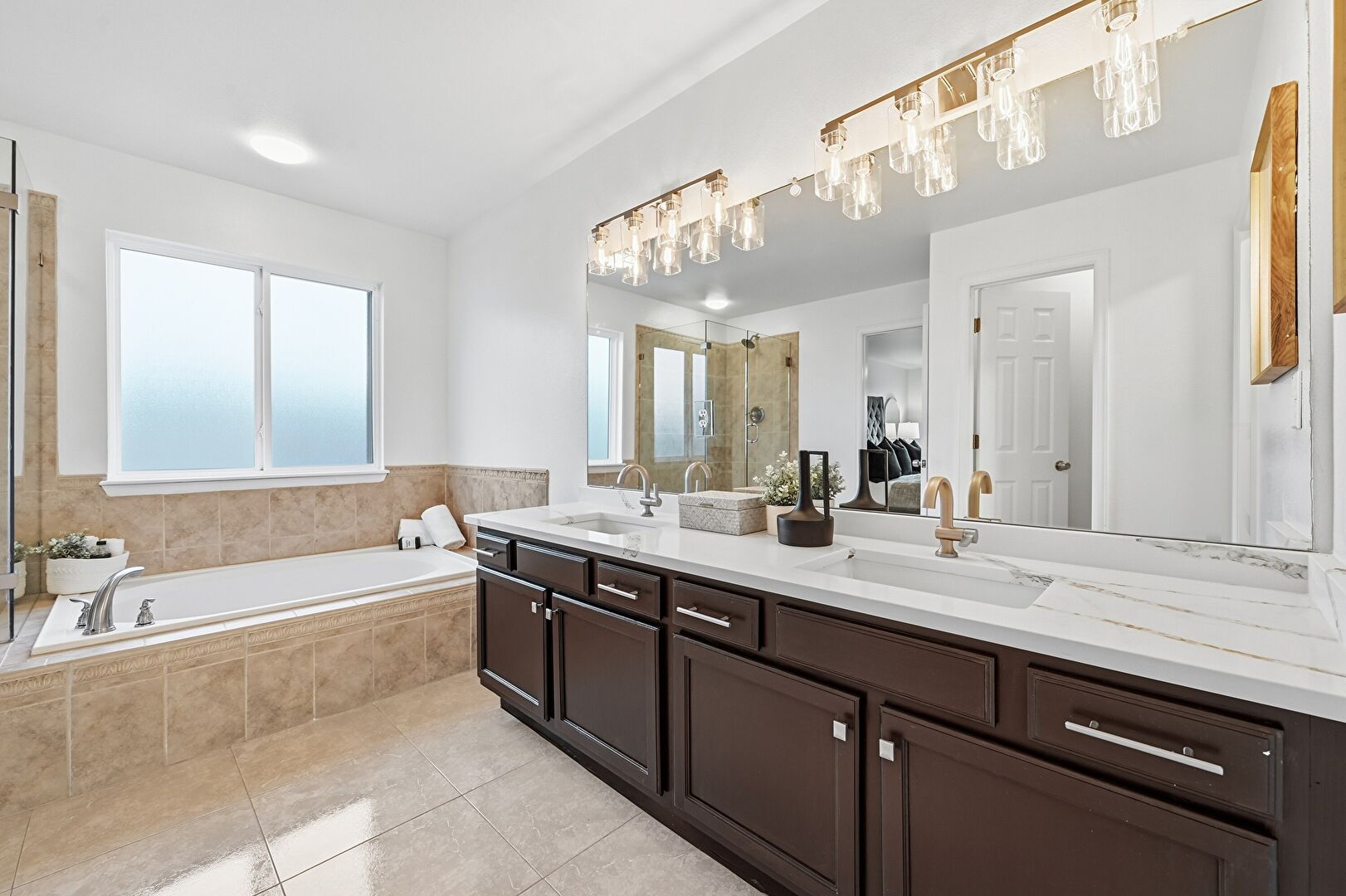 Double Vanity, Drywall, Full Bathroom, Natural Light, Tile Floor, Vanity, Drywall, Natural Light