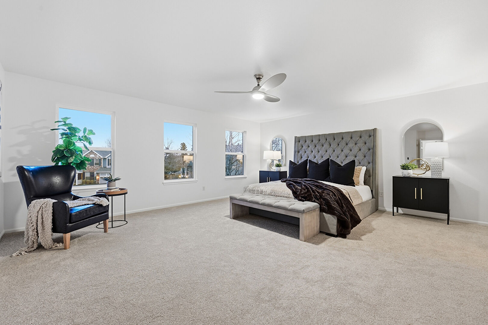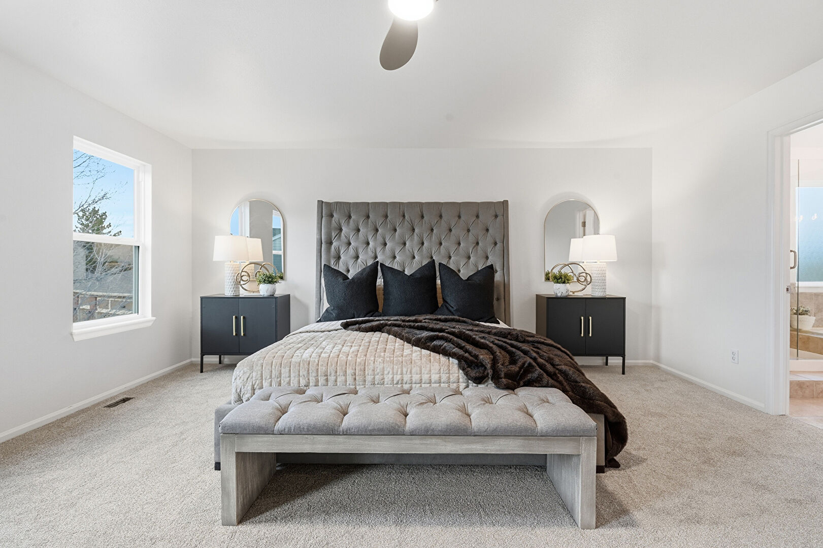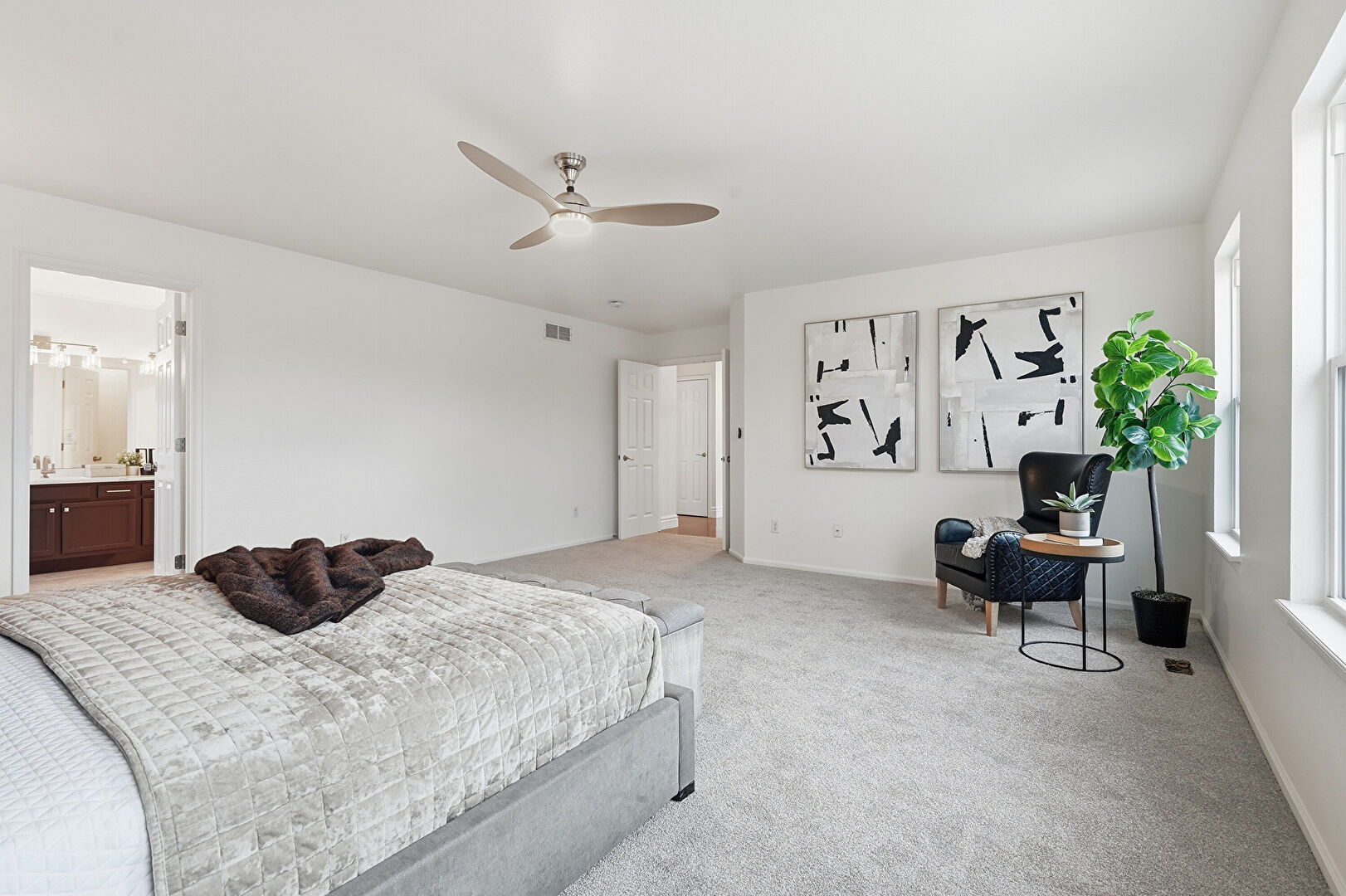Baseboards Wall, Carpet, Ceiling Fan, Drywall, Ensuite Bathroom, Full Bathroom, Natural Light, Tile Floor, Vent, Walk In Closet, Baseboards Wall, Ceiling Fan, Double Vanity, Drywall, Natural Light