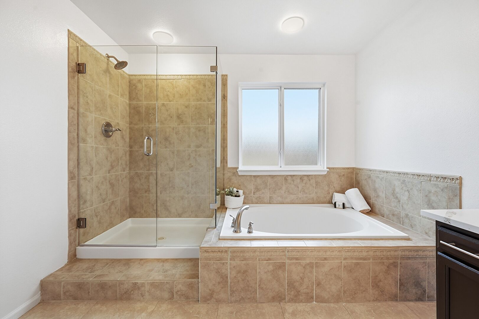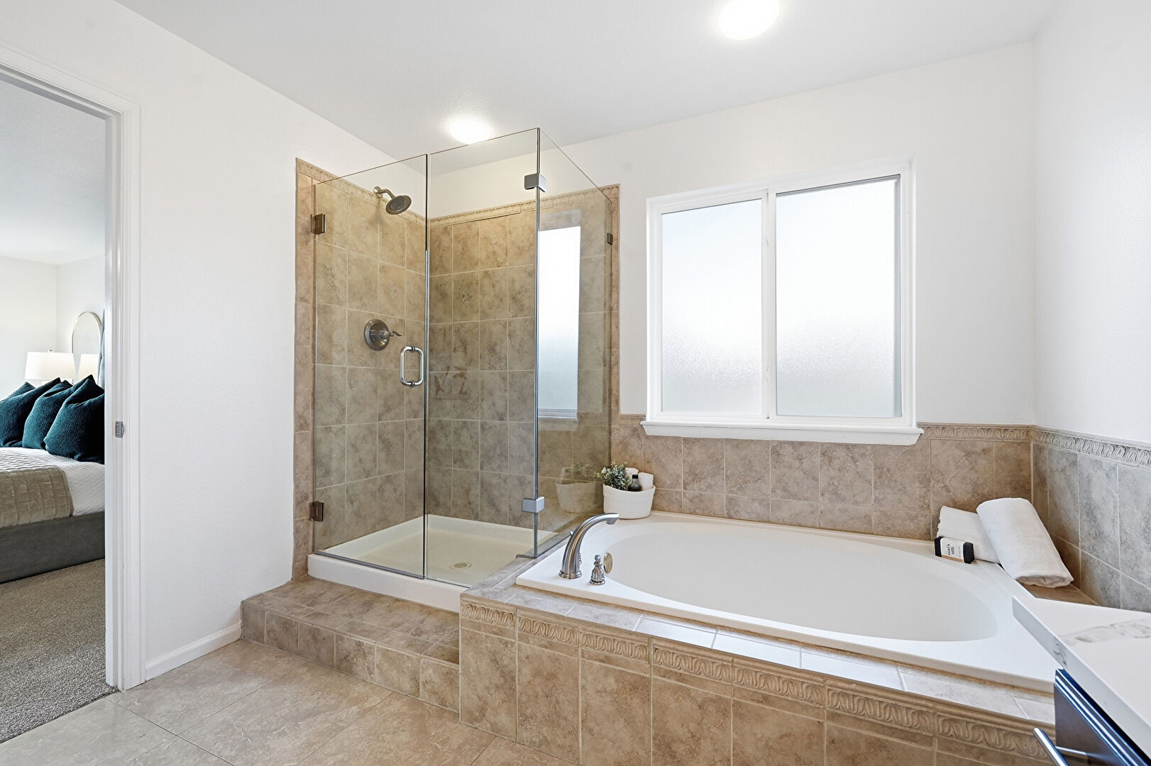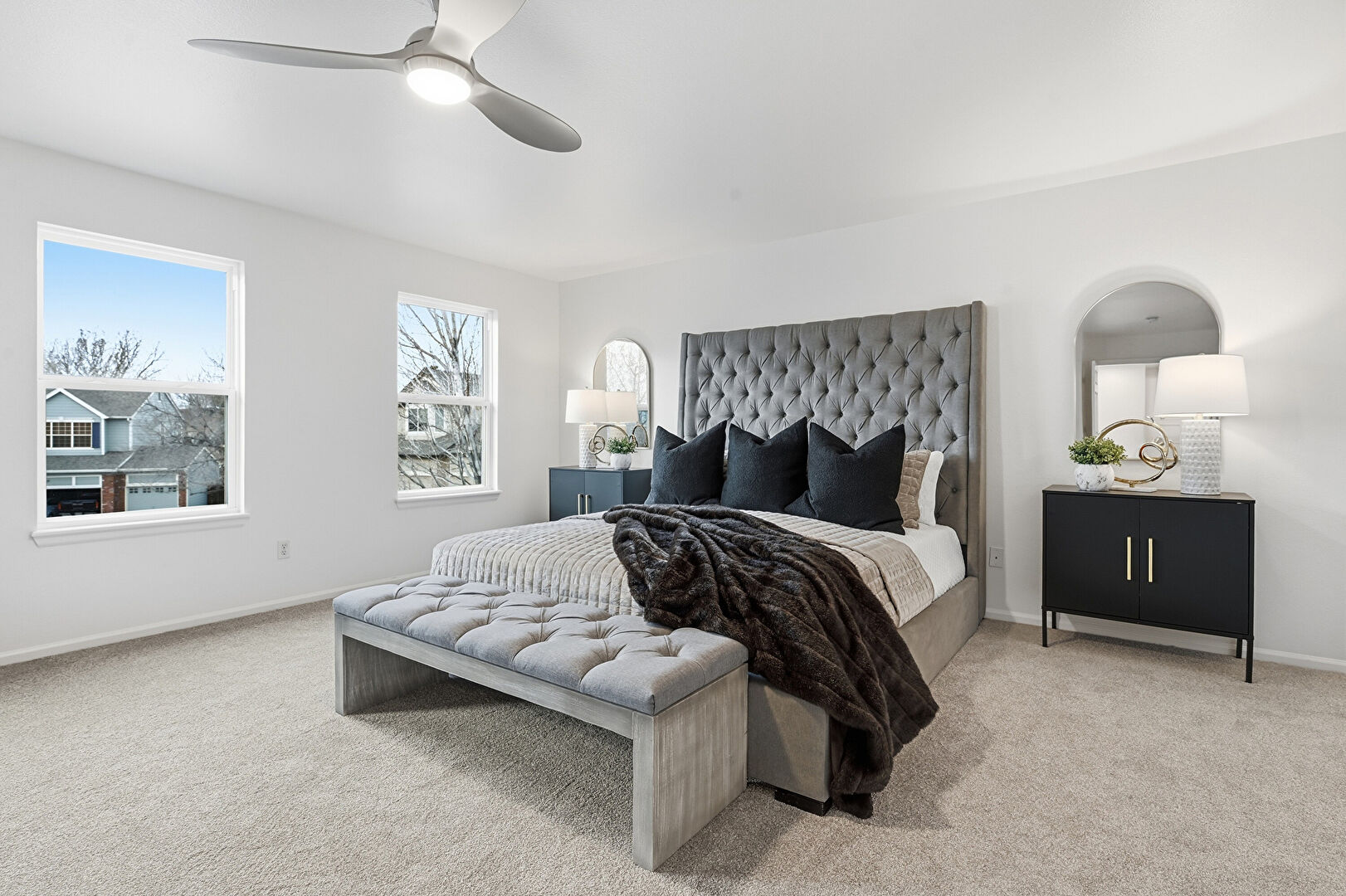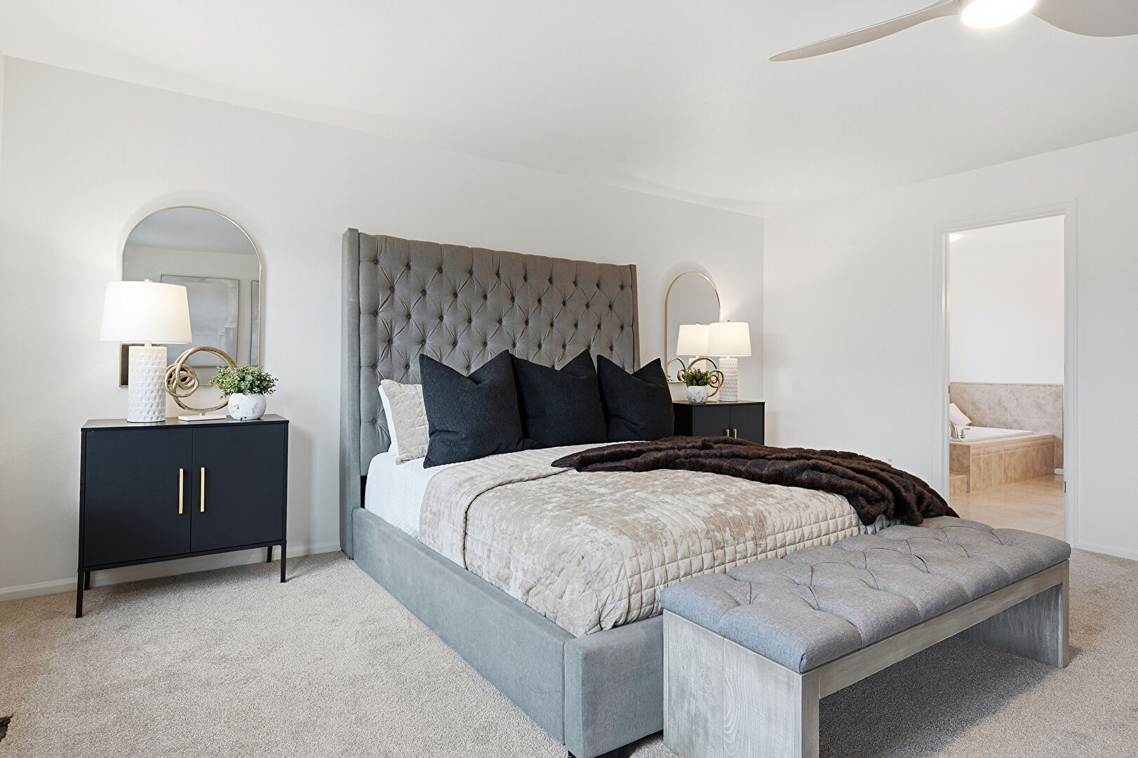 Baseboards Wall, Carpet, Ceiling Fan, Drywall, Ensuite Bathroom, Full Bathroom, Natural Light, Tile Floor, Vent, Walk In Closet, Baseboards Wall, Ceiling Fan, Double Vanity, Drywall, Natural Light