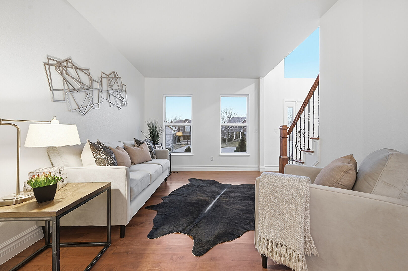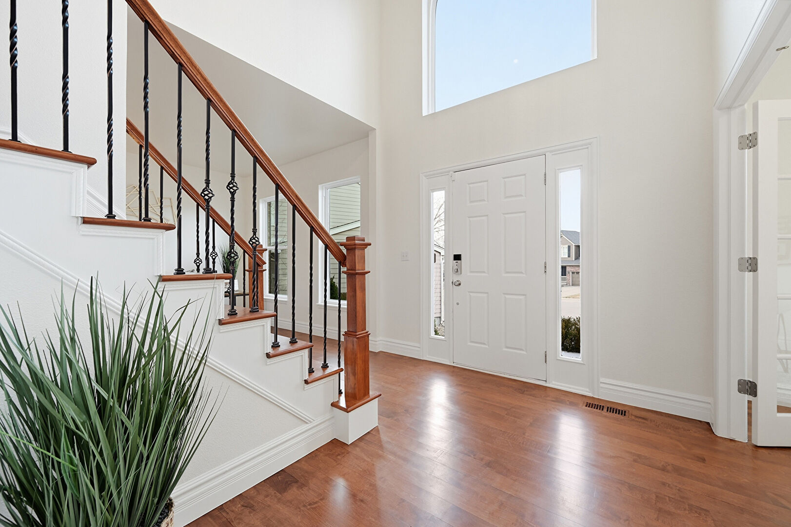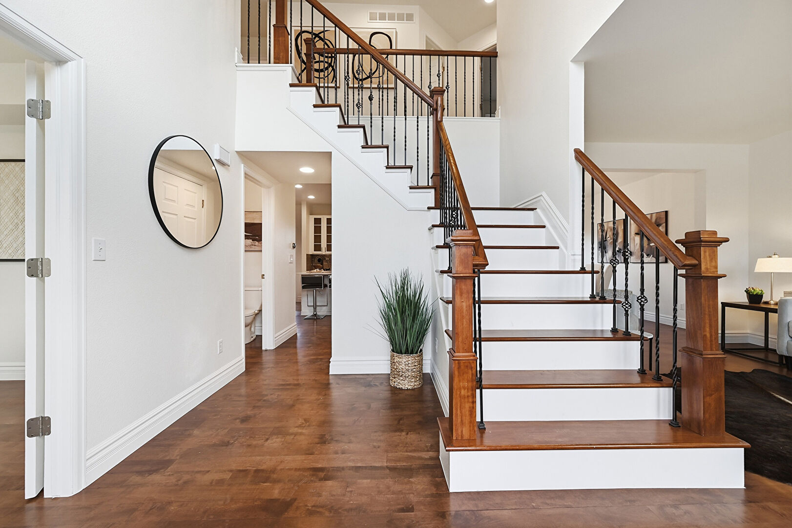 Baseboards Wall, Drywall, High Ceiling, Natural Light, Recessed Lighting, Stairs, Vent, Wood Finish Floor, Baseboards Wall, Stairs