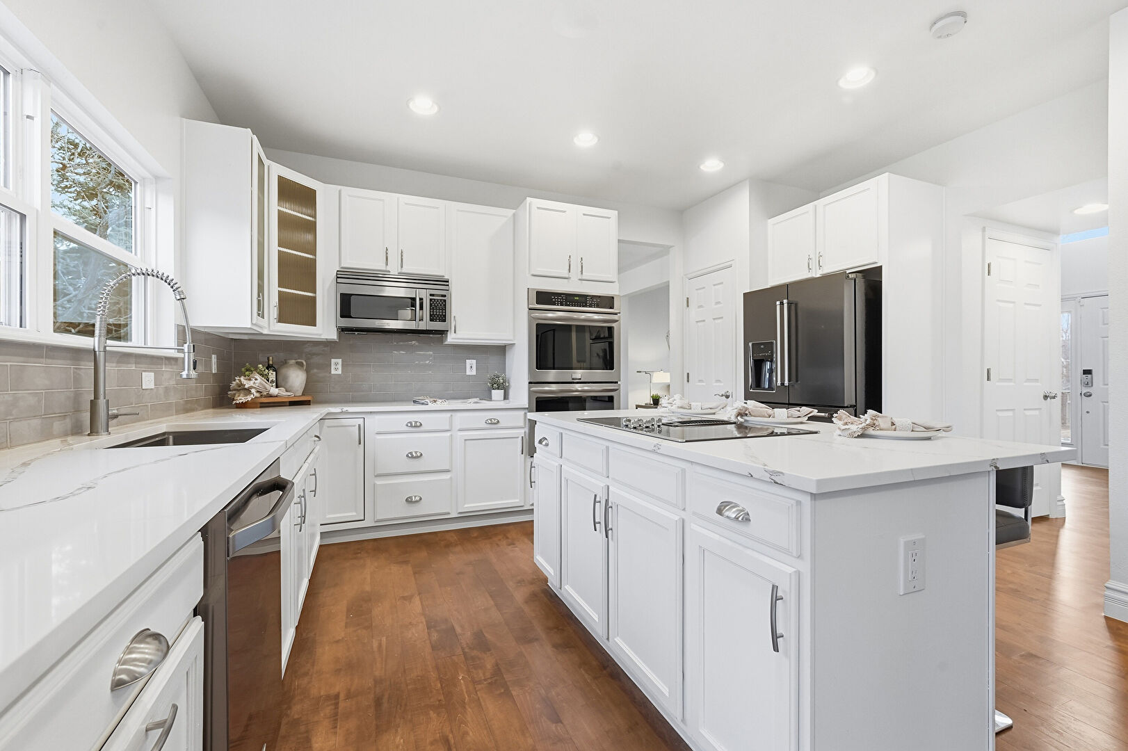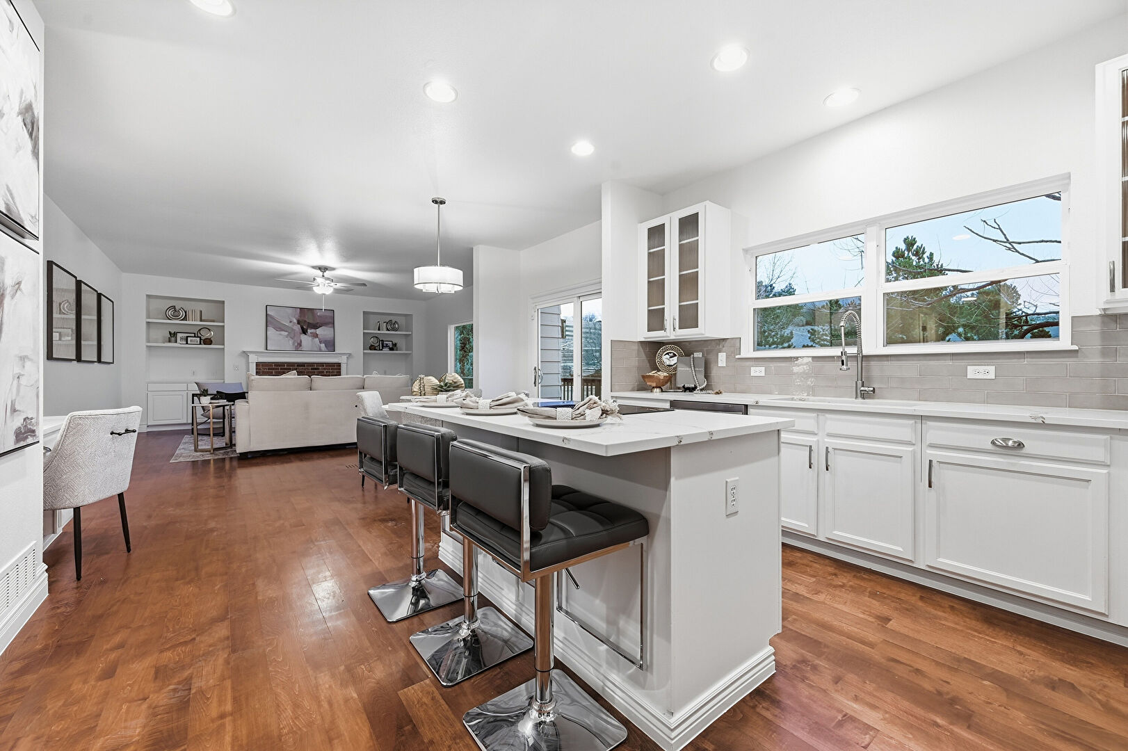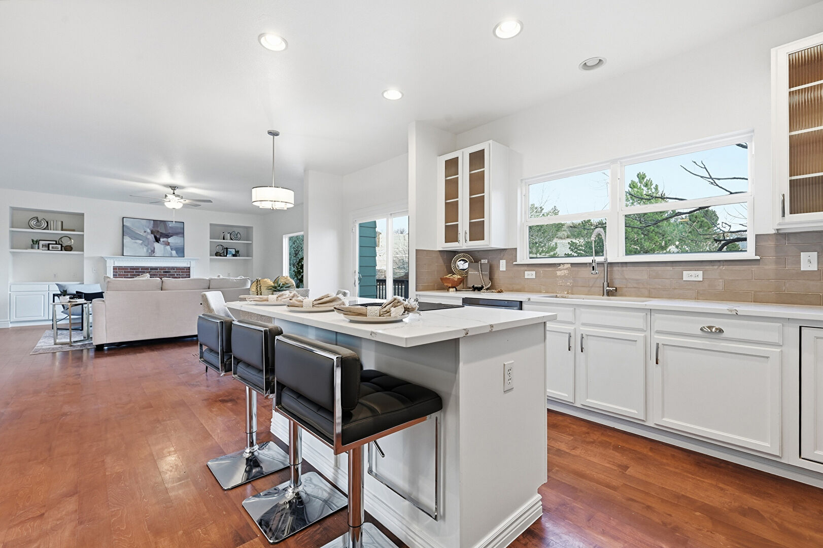 Baseboards Wall, Built In Shelves, Ceiling Fan, Double Oven, Drywall, Glass Insert Cabinets, Kitchen Bar, Kitchen Island, Natural Light, Opens To Living Area, Pendant Lighting, Recessed Lighting, Shaker Cabinets, Smoke Carbon Monoxide Detector, Stone Countertops, U Shaped Kitchen, Vent, Wood Finish Floor, Baseboards Wall, Glass Insert Cabinets, Natural Light, Recessed Lighting, Shaker Cabinets