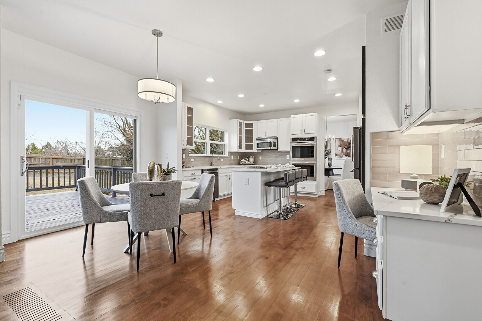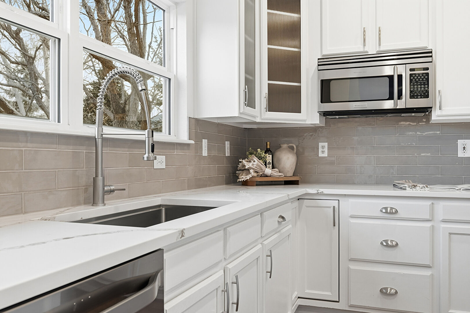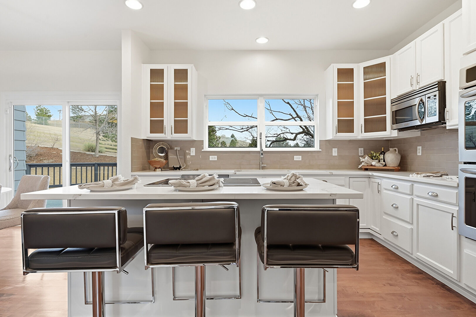 Baseboards Wall, Built In Shelves, Ceiling Fan, Double Oven, Drywall, Glass Insert Cabinets, Kitchen Bar, Kitchen Island, Natural Light, Opens To Living Area, Pendant Lighting, Recessed Lighting, Shaker Cabinets, Smoke Carbon Monoxide Detector, Stone Countertops, U Shaped Kitchen, Vent, Wood Finish Floor, Baseboards Wall, Glass Insert Cabinets, Natural Light, Recessed Lighting, Shaker Cabinets