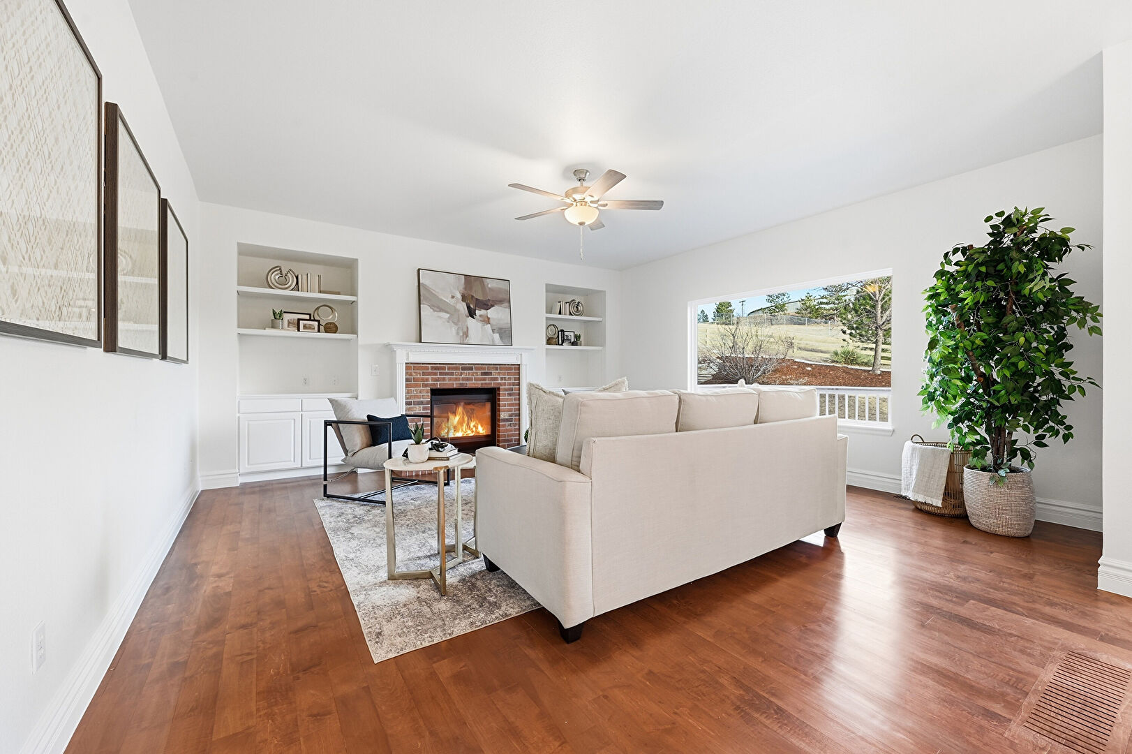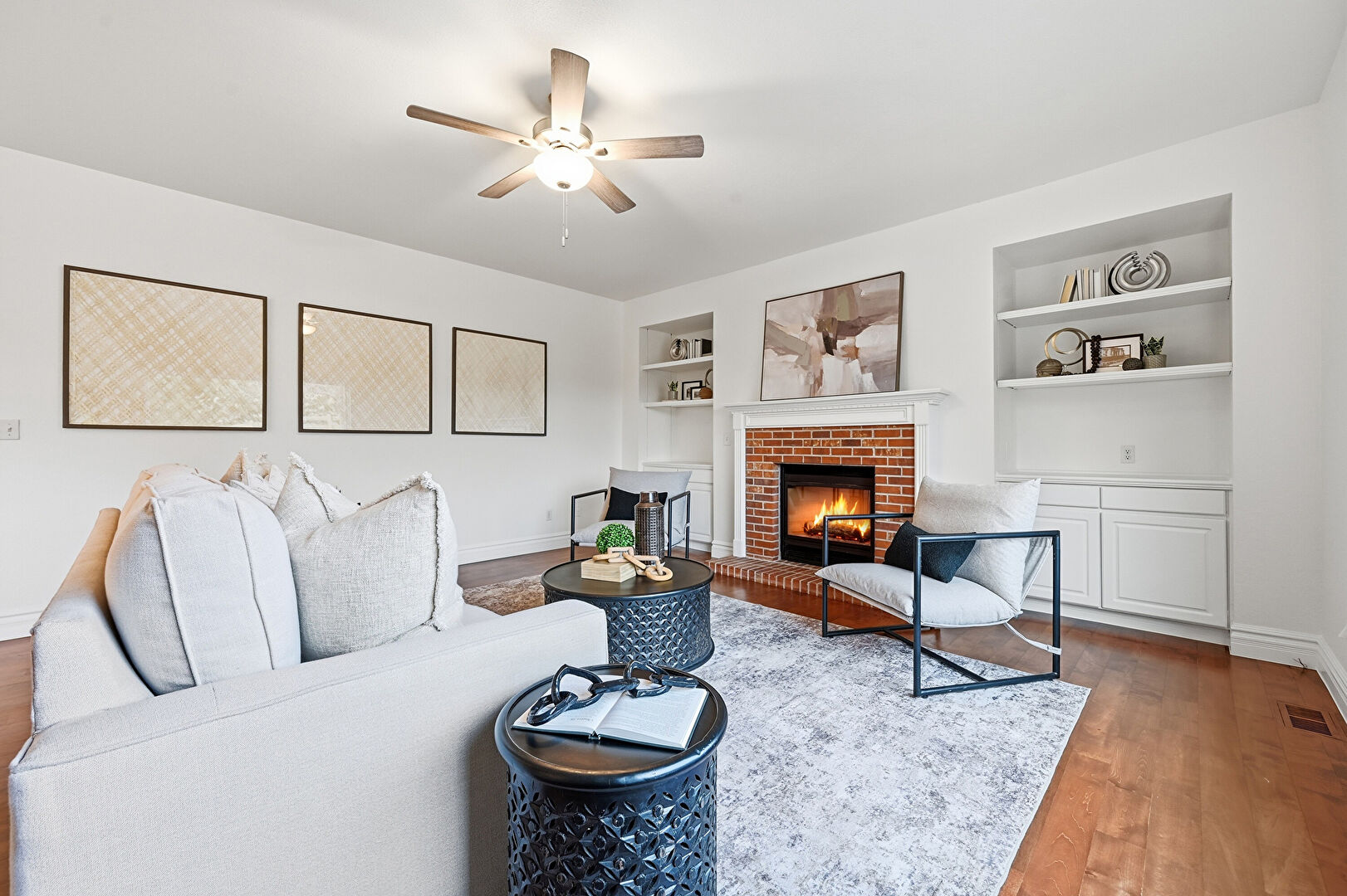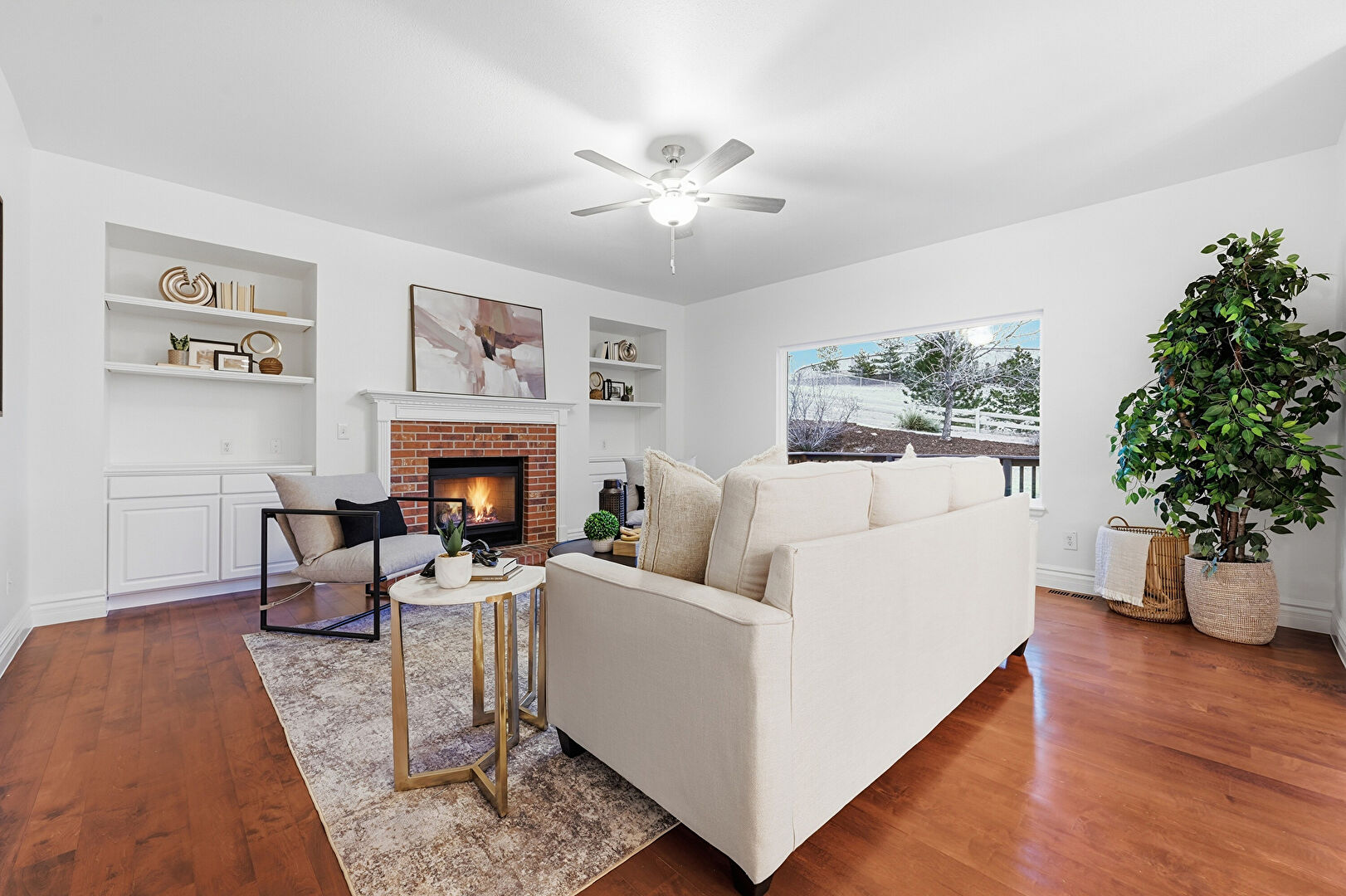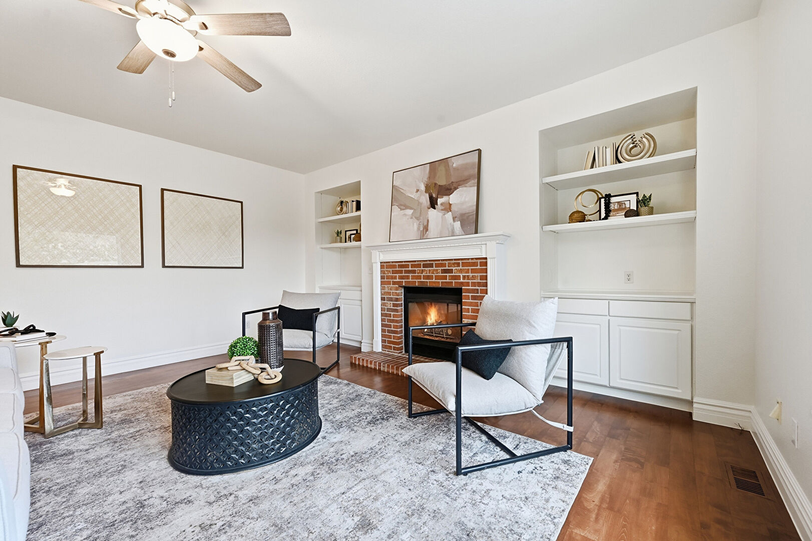 Baseboards Wall, Built In Shelves, Ceiling Fan, Fireplace, Natural Light, Vent, Wood Finish Floor, Drywall