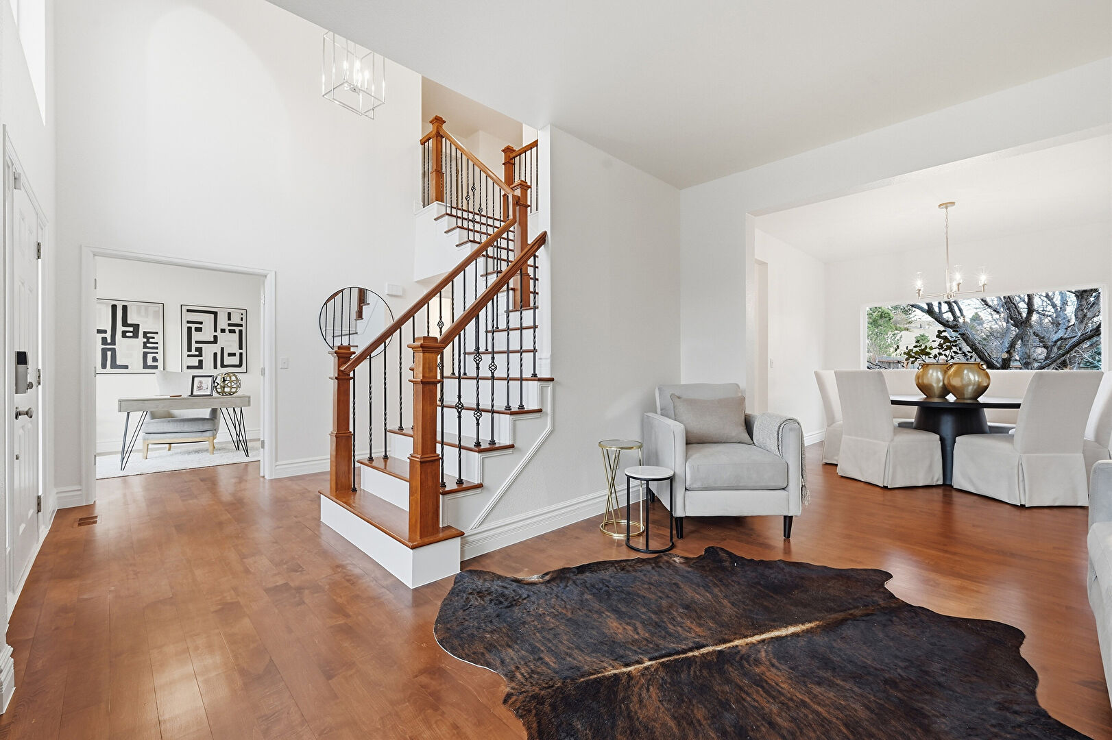 Baseboards Wall, Drywall, High Ceiling, Natural Light, Stairs, Vent, Wood Finish Floor, Notable Chandelier, Recessed Lighting, Stairs