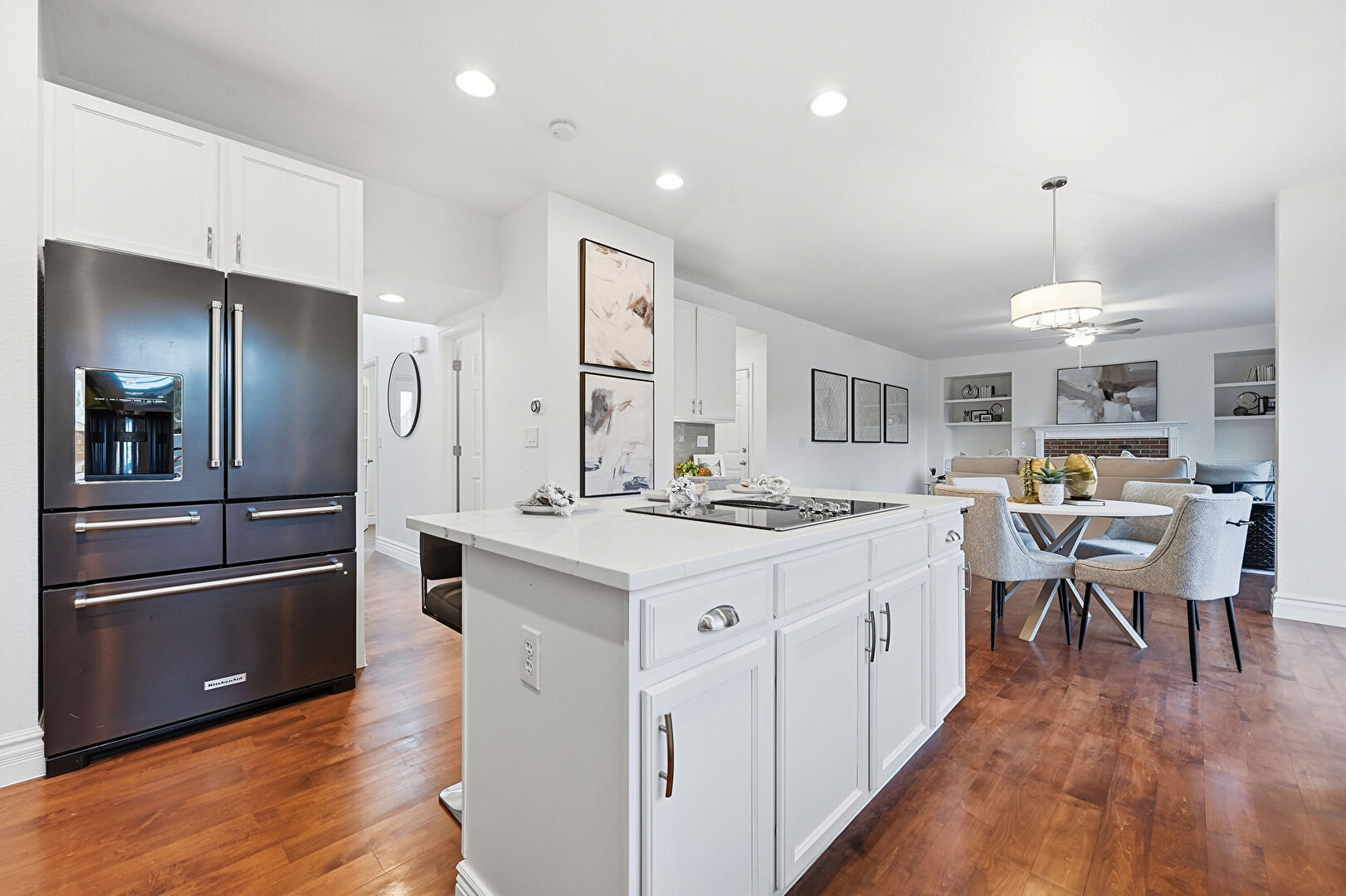 Baseboards Wall, Built In Shelves, Ceiling Fan, Drywall, Fireplace, Natural Light, Notable Chandelier, Recessed Lighting, U Shaped Kitchen, Vent, Wood Finish Floor, Ceiling Fan, Double Oven, Drywall, Notable Chandelier, Recessed Lighting, Wood Finish Floor