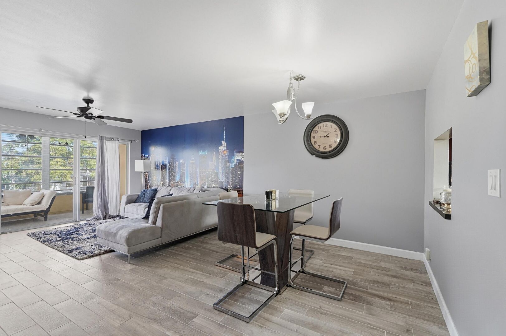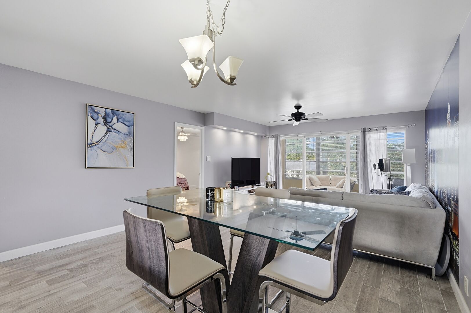 Baseboards Wall, Ceiling Fan, City View, Drywall, Natural Light, Notable Chandelier, Wood Finish Floor, Ceiling Fan, Drywall, Vent