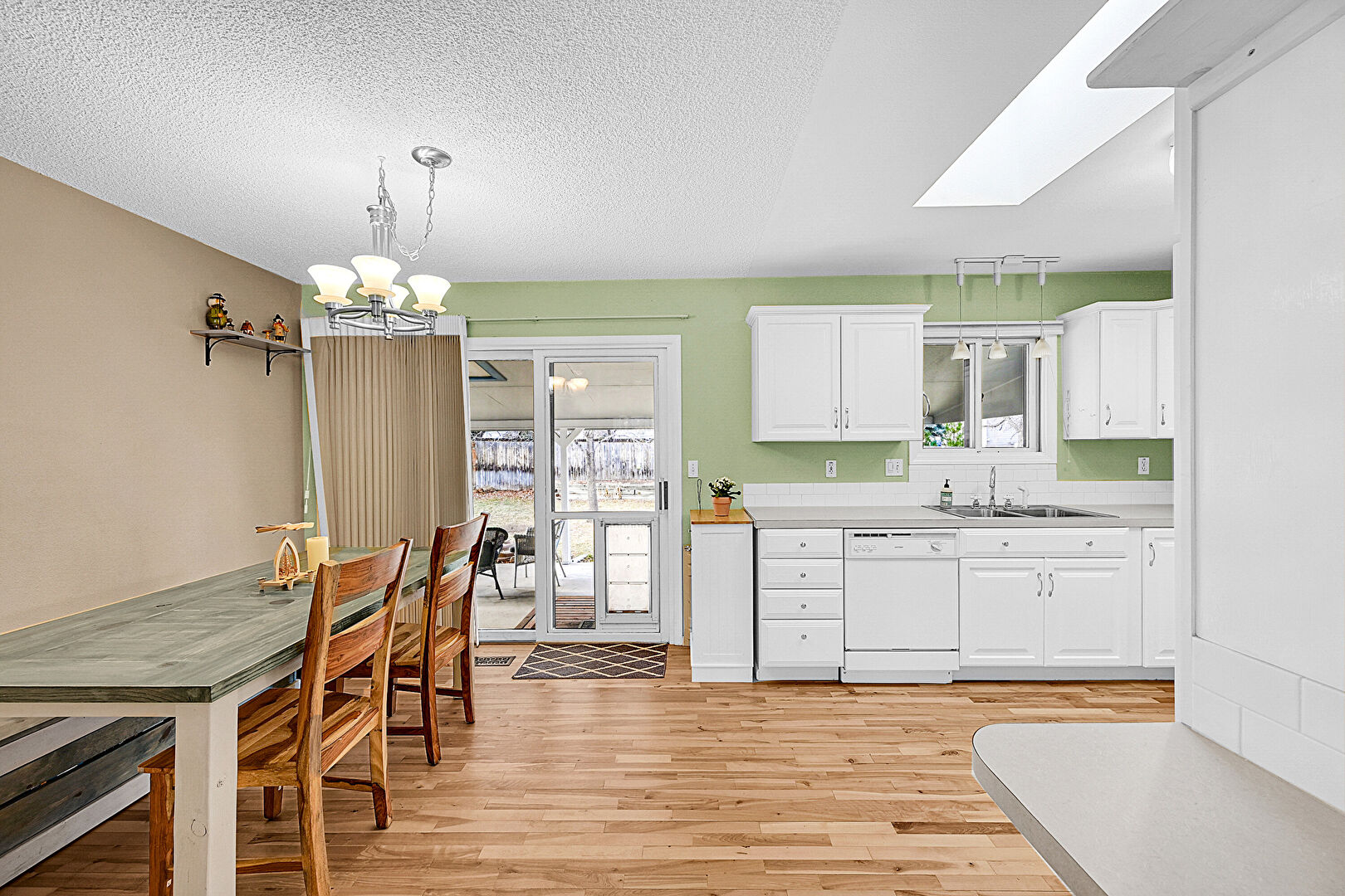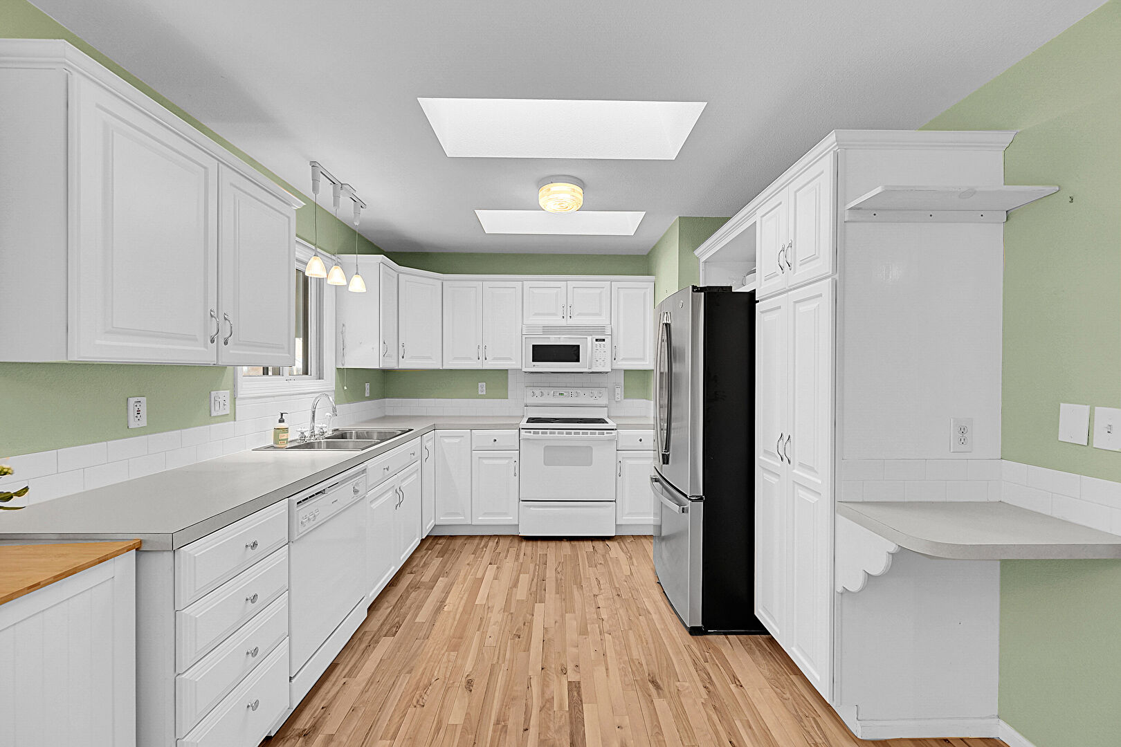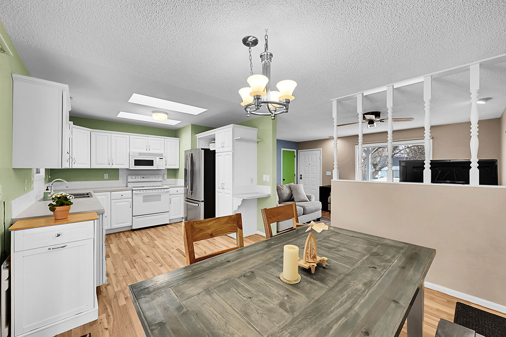 Baseboards Wall, Ceiling Fan, Drywall, Natural Light, Notable Chandelier, Skylight, Textured Ceiling, U Shaped Kitchen, Vent, Wood Finish Floor, Baseboards Wall, Notable Chandelier