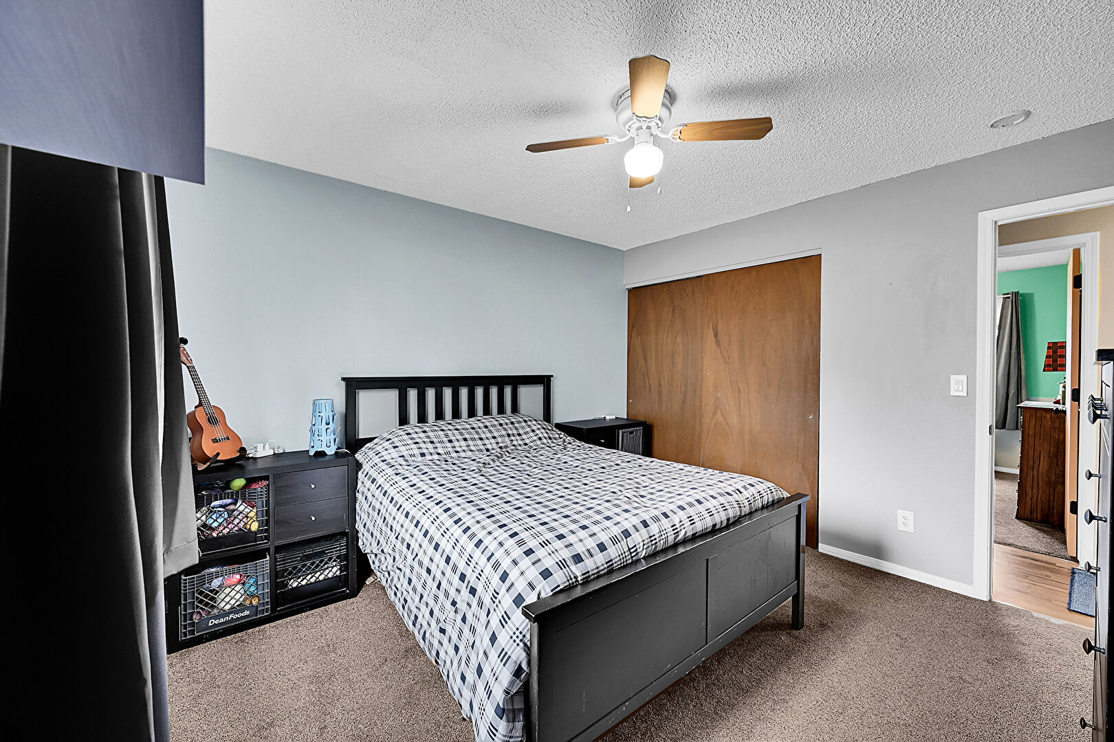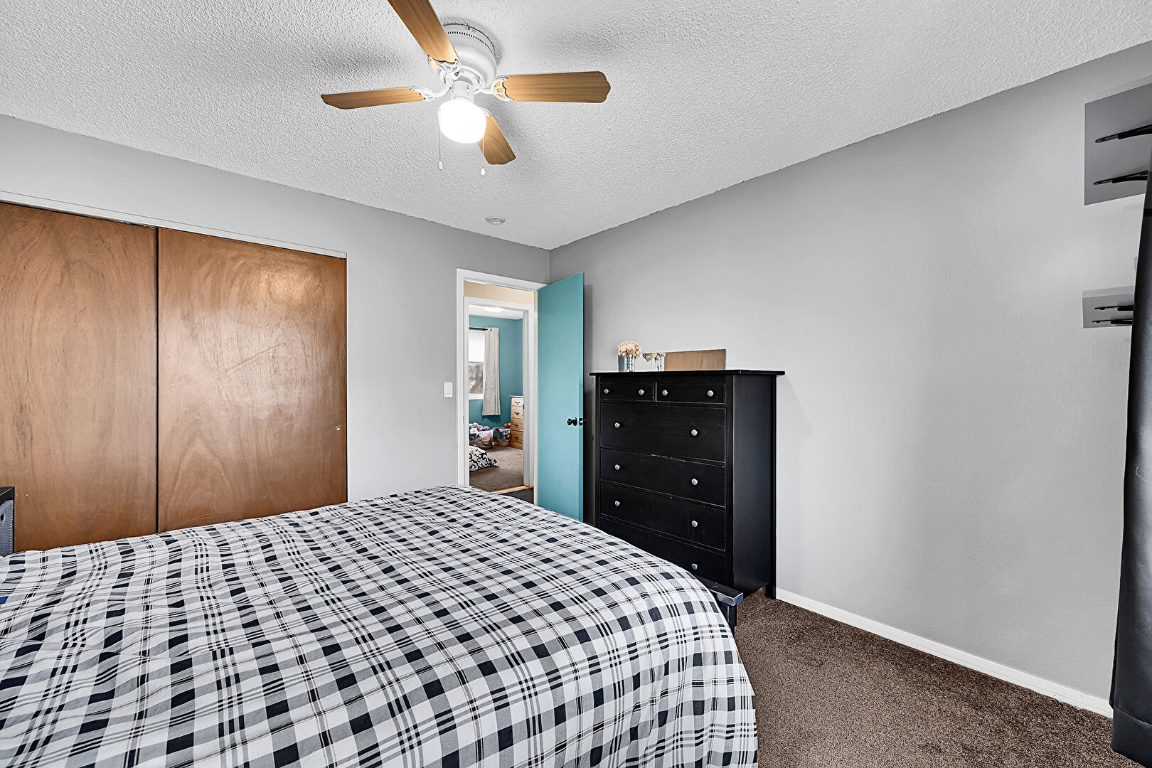 Baseboards Wall, Carpet, Ceiling Fan, Closet, Drywall, Natural Light, Textured Ceiling, Carpet, Drywall