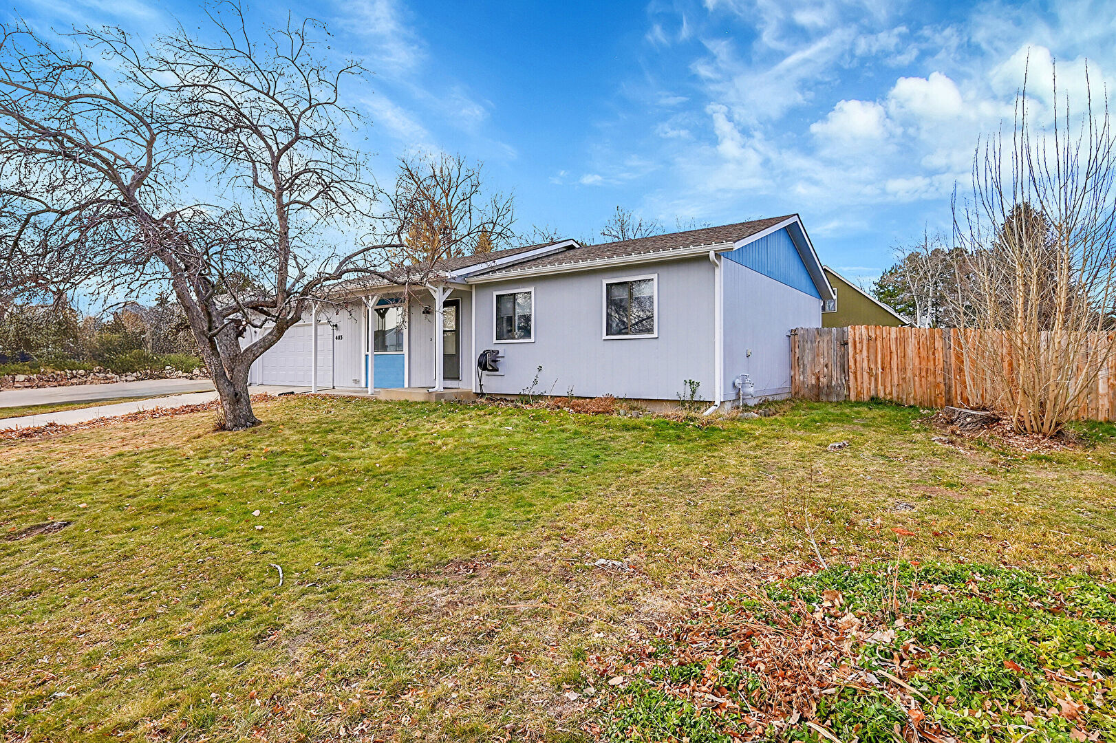 Concrete Foundation, Downspout, Driveway, Fence, Gutters, Lawn, Vertical Siding, Lawn, Vertical Siding