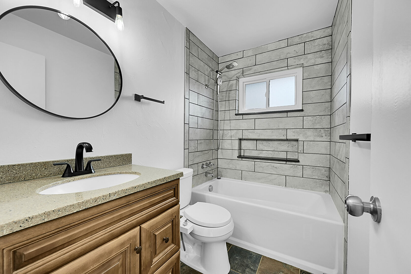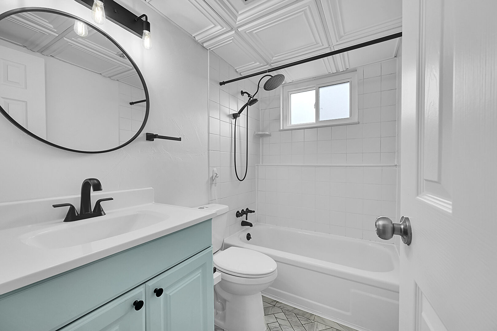 Combined Bath Shower, Drywall, Full Bathroom, Natural Light, Vanity