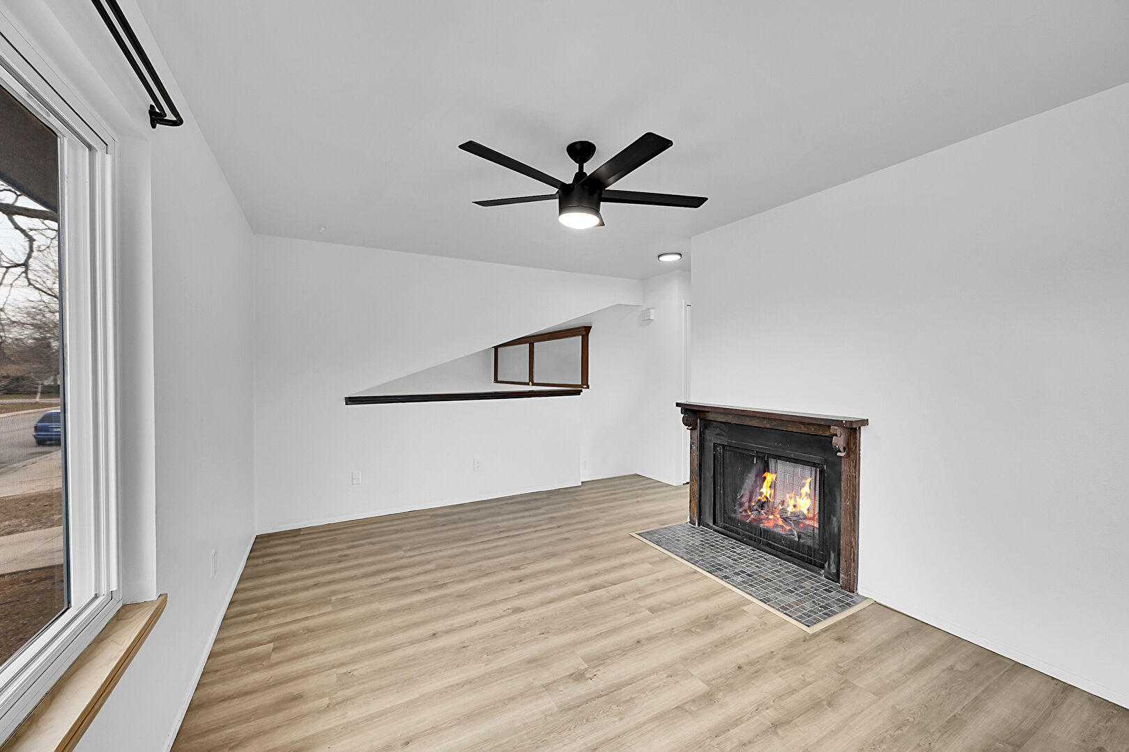 Baseboards Wall, Built In Shelves, Ceiling Fan, Drywall, Fireplace, Natural Light, Vent, Wood Finish Floor, Drywall, Fireplace, Natural Light