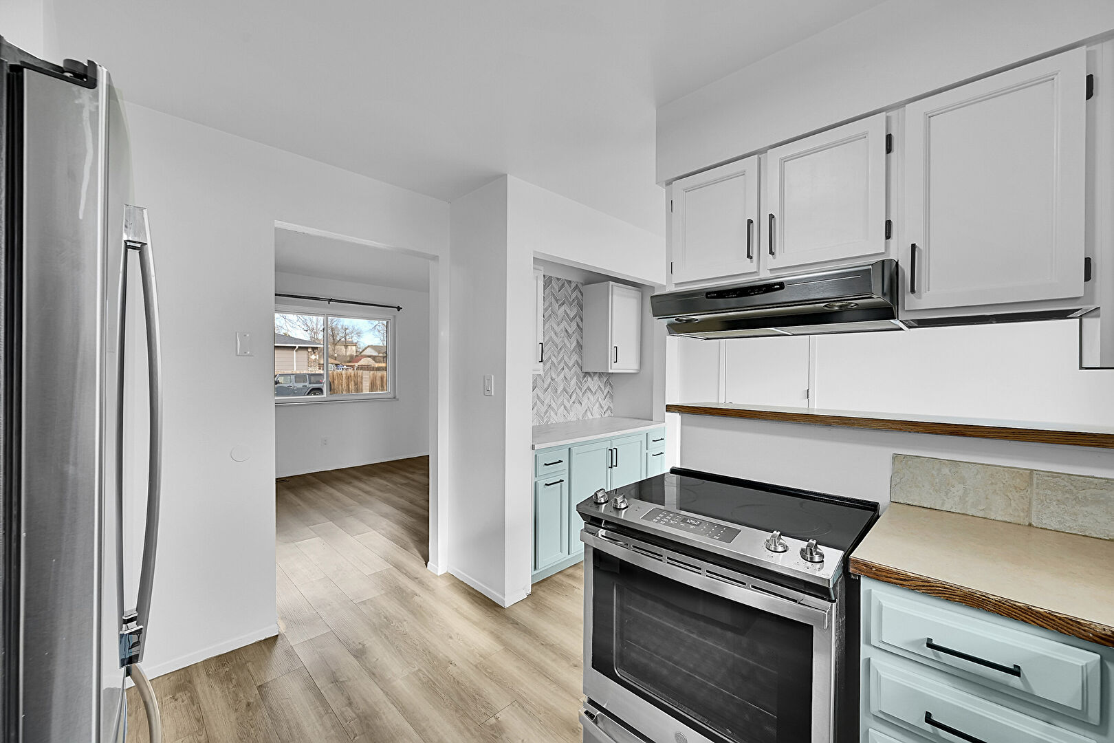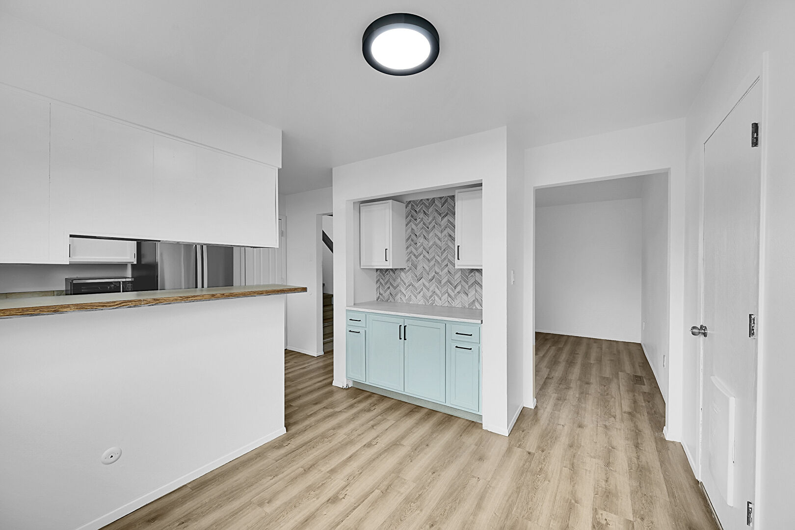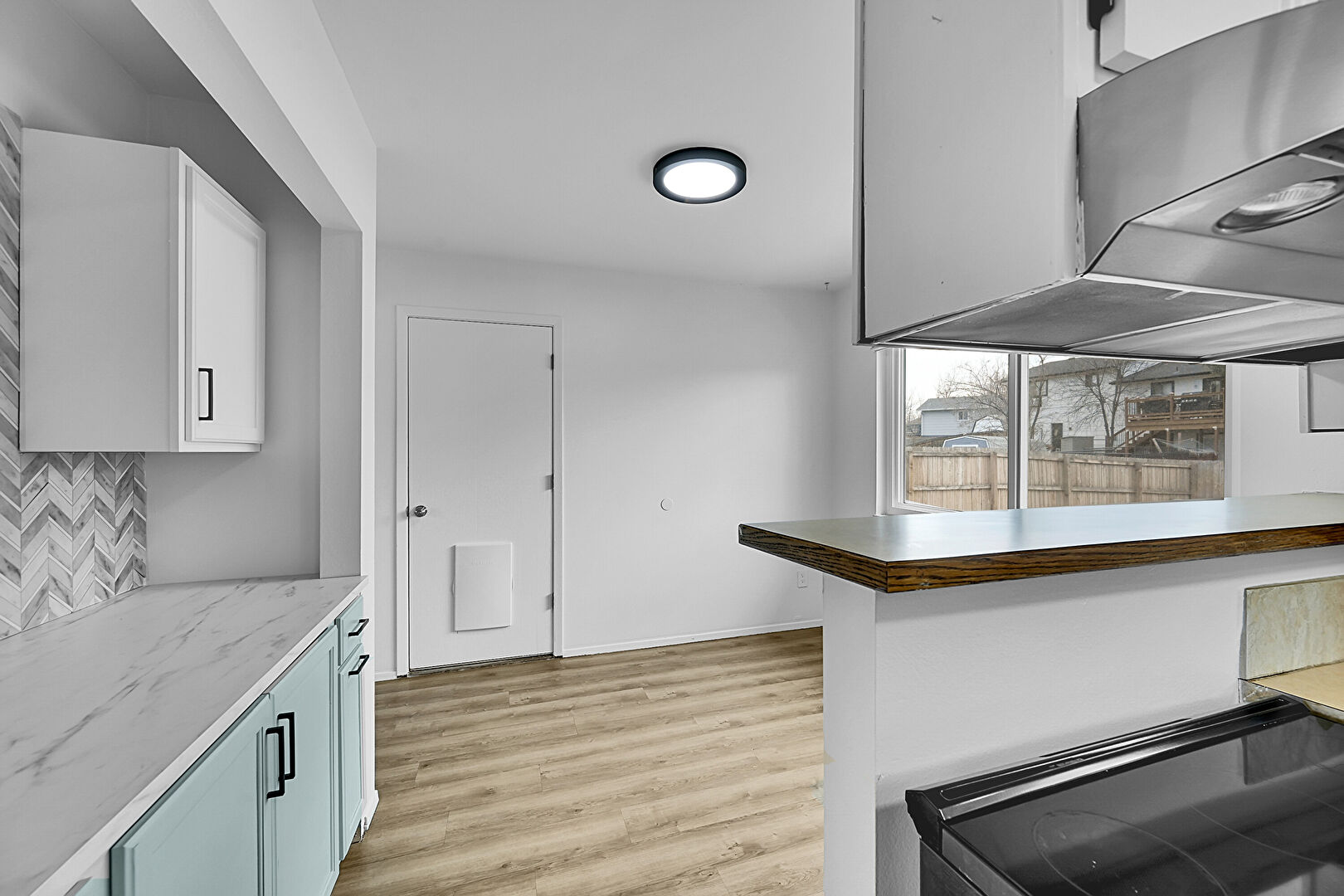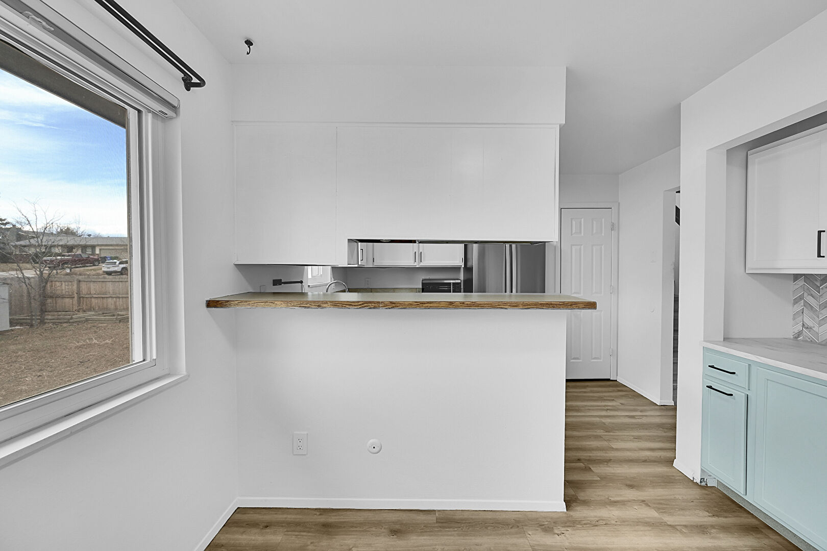 Baseboards Wall, Butcher Block Countertops, Drywall, Kitchen Peninsula, Natural Light, Shaker Cabinets, Stone Countertops, Wood Finish Floor, Baseboards Wall, Natural Light, Shaker Cabinets, Wood Finish Floor
