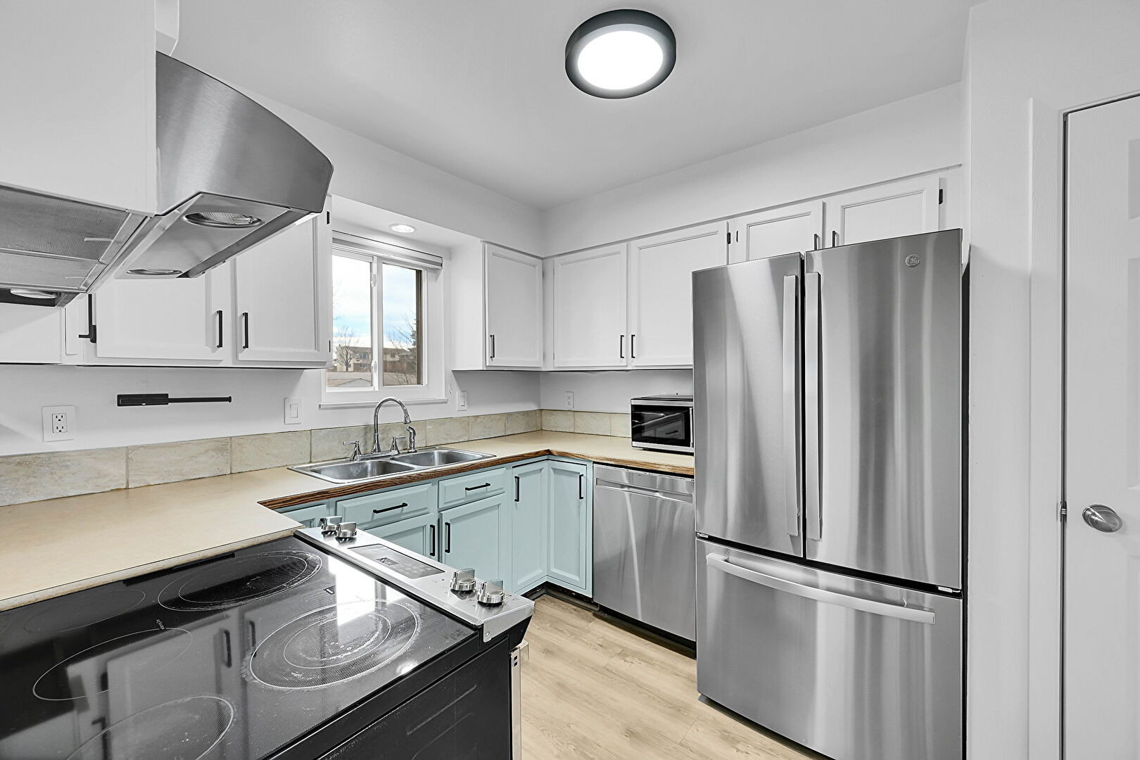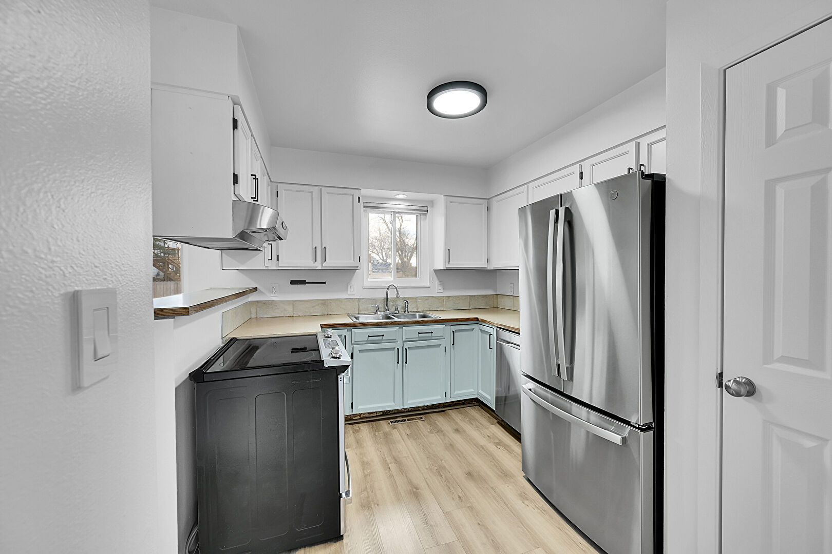 Baseboards Wall, Butcher Block Countertops, Drywall, Laundry, Natural Light, Shaker Cabinets, Textured Wall, U Shaped Kitchen, Visible Hinge Cabinets, Wood Finish Floor, Blue Cabinets, Shaker Cabinets, Washer Dryer