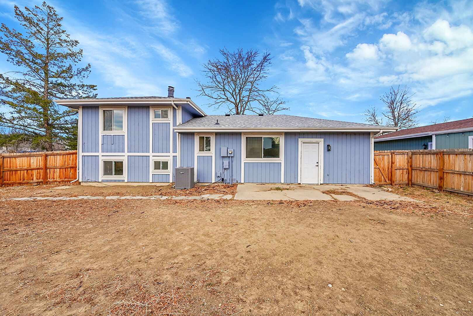 Concrete Foundation, Downspout, Driveway, Fence, Gutters, Lawn, Shingle Roof, Vertical Siding, Fence, Vertical Siding