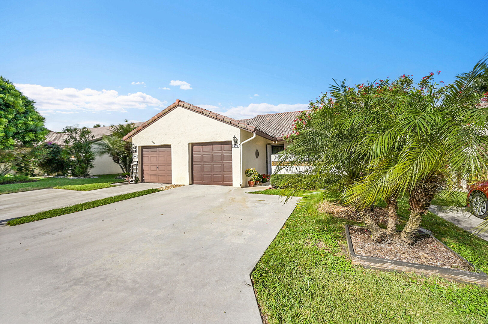 Downspout, Driveway, Fence, Garage, Gutters, Lawn, Parking Pad, Stucco Siding, Tile Roof, Driveway, Gutters, Lawn
