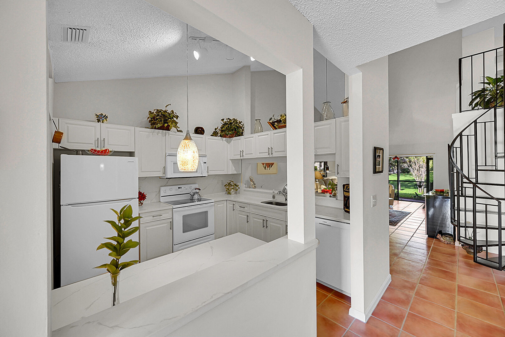 Baseboards Wall, Drywall, High Ceiling, L Shaped Kitchen, Natural Light, Pass Through Window, Raised Cabinets, Stairs, Stone Countertops, Textured Ceiling, Tile Floor, Vaulted Ceiling, Vent, Drywall, Pendant Lighting