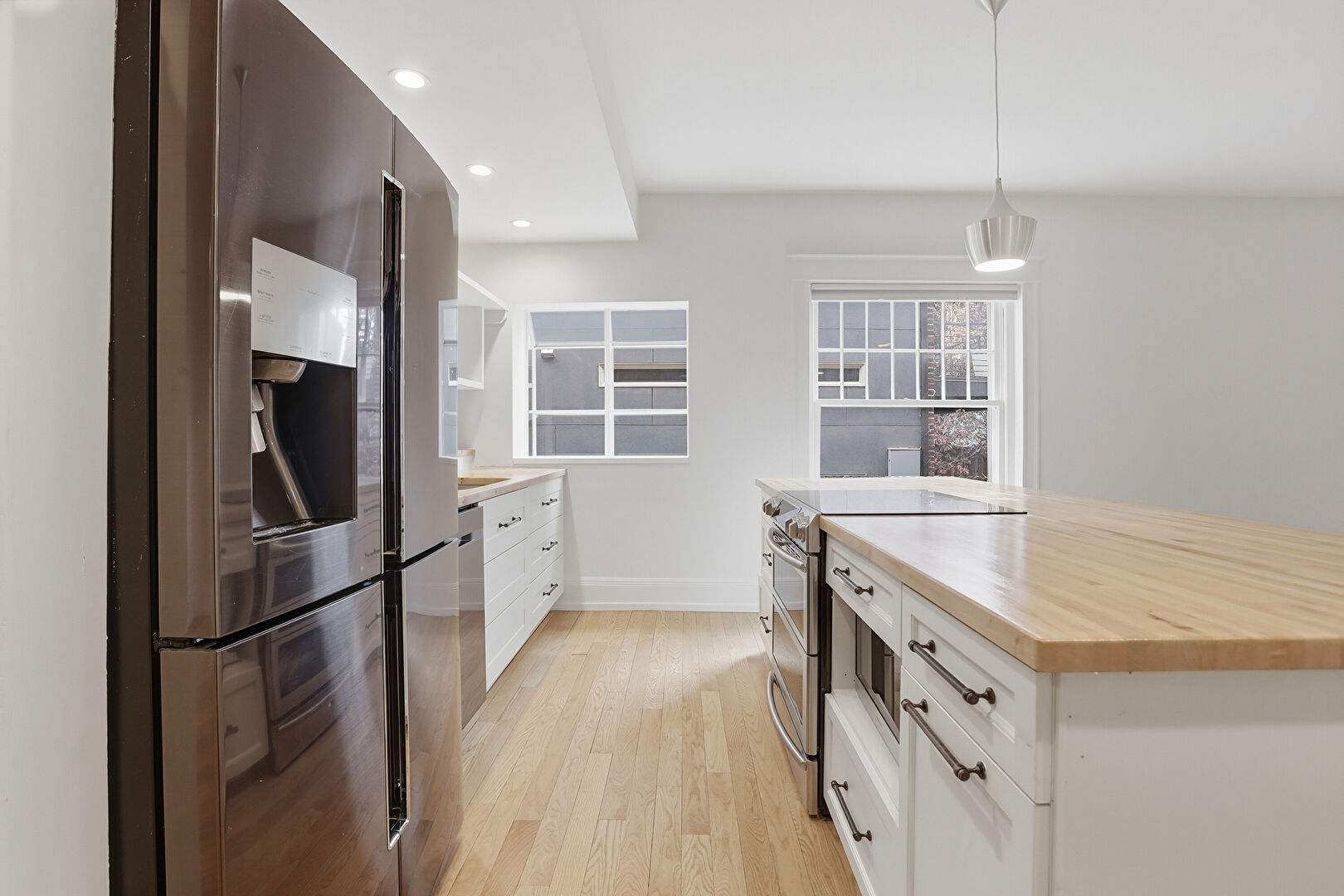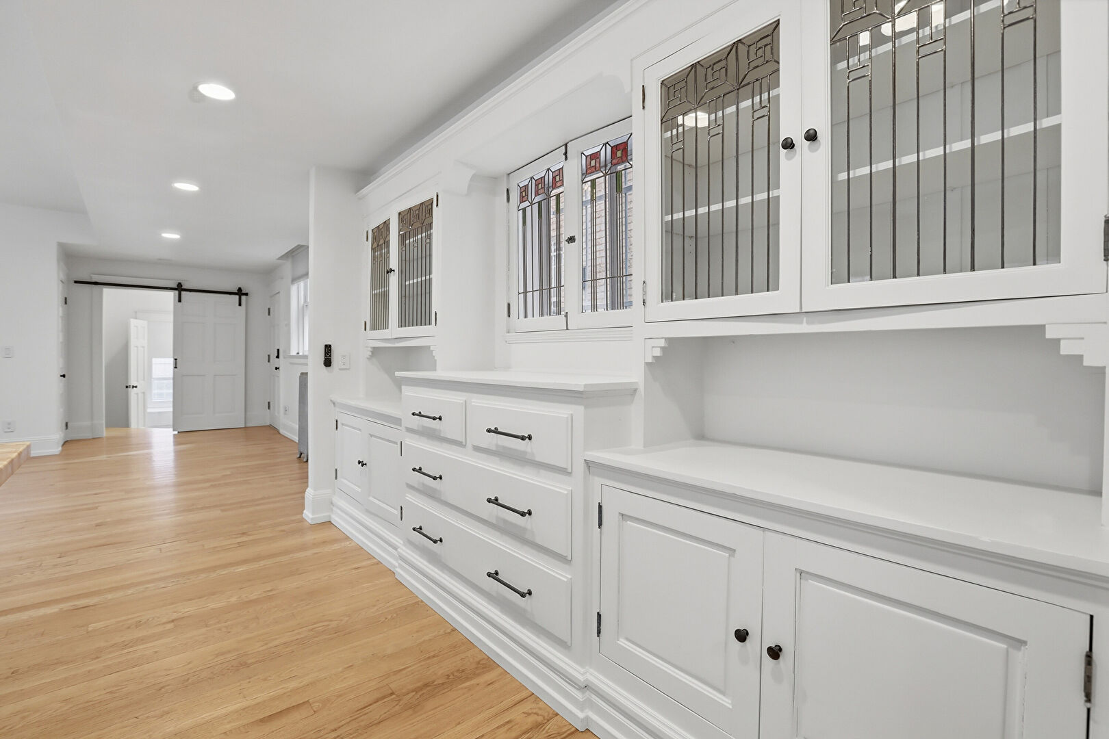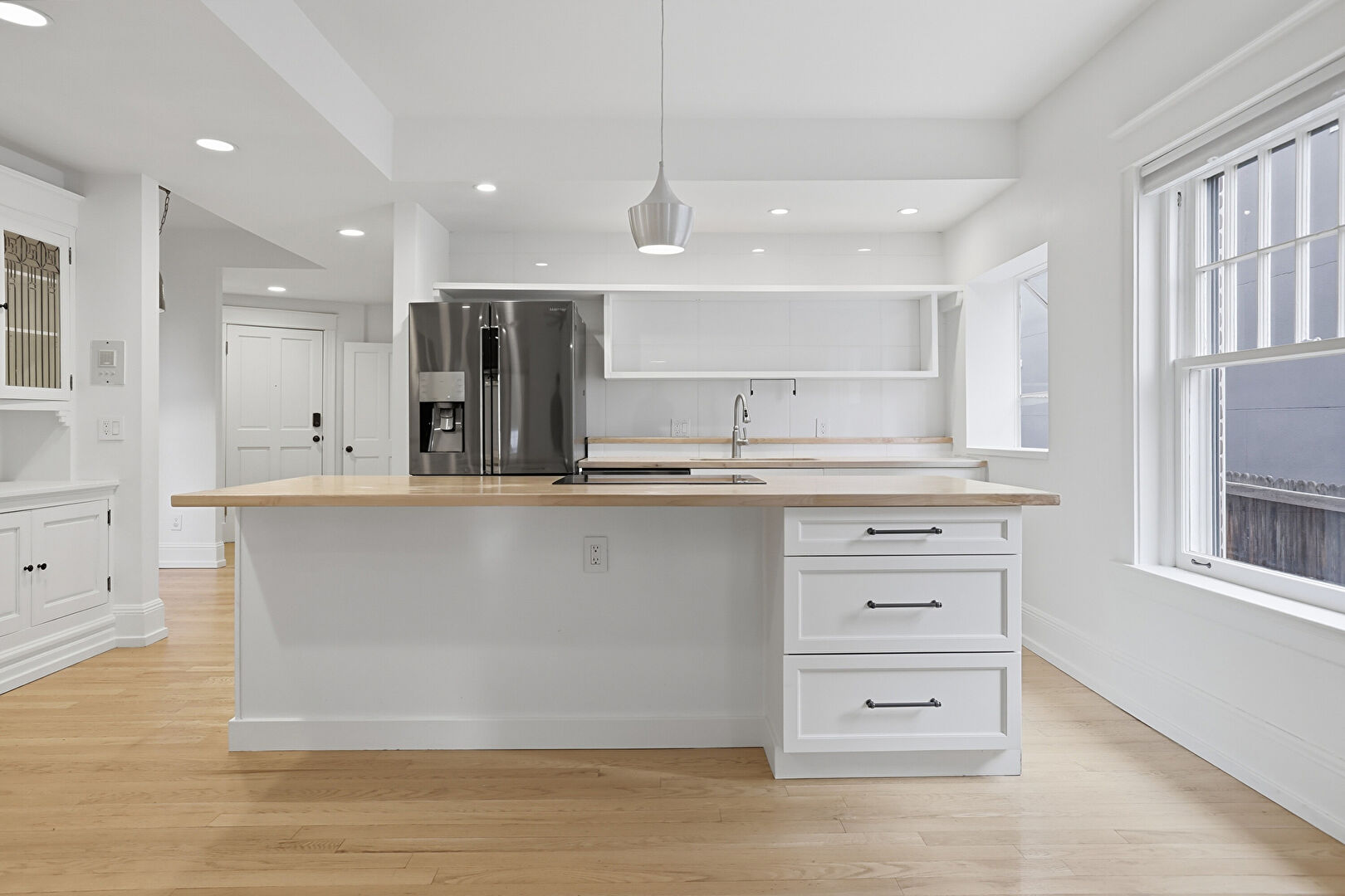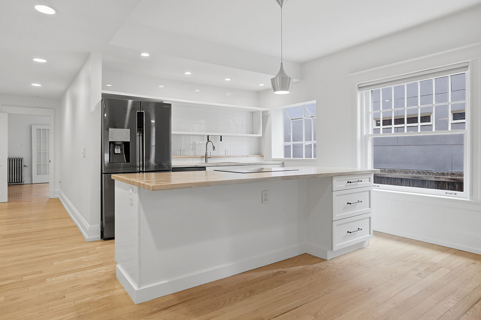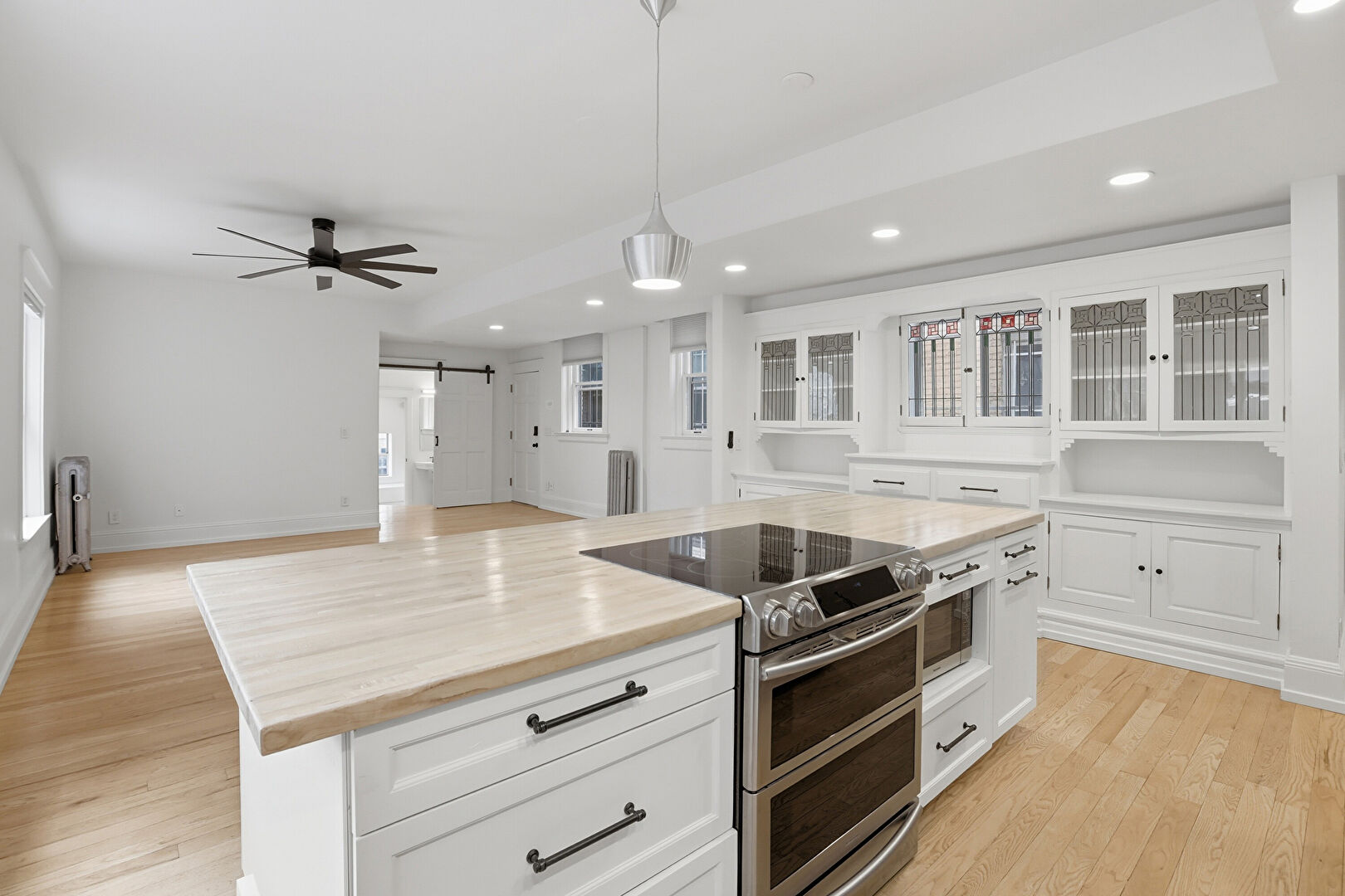 Barn Door, Baseboards Wall, Butcher Block Countertops, Ceiling Fan, Drywall, Flat Panel Cabinets, Glass Insert Cabinets, Kitchen Island, Natural Light, Open Shelves, Opens To Living Area, Pendant Lighting, Radiator, Raised Cabinets, Recessed Lighting, Shaker Cabinets, Stone Countertops, Visible Hinge Cabinets, Wood Finish Floor, Baseboards Wall, Natural Light, Open Shelves, Opens To Living Area, Shaker Cabinets, Wood Finish Floor
