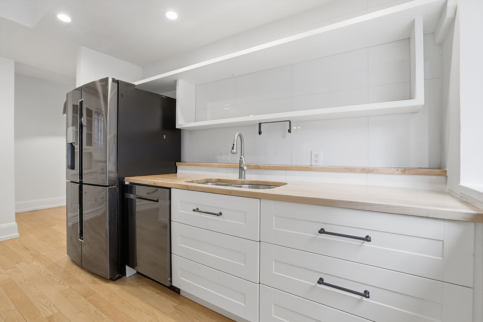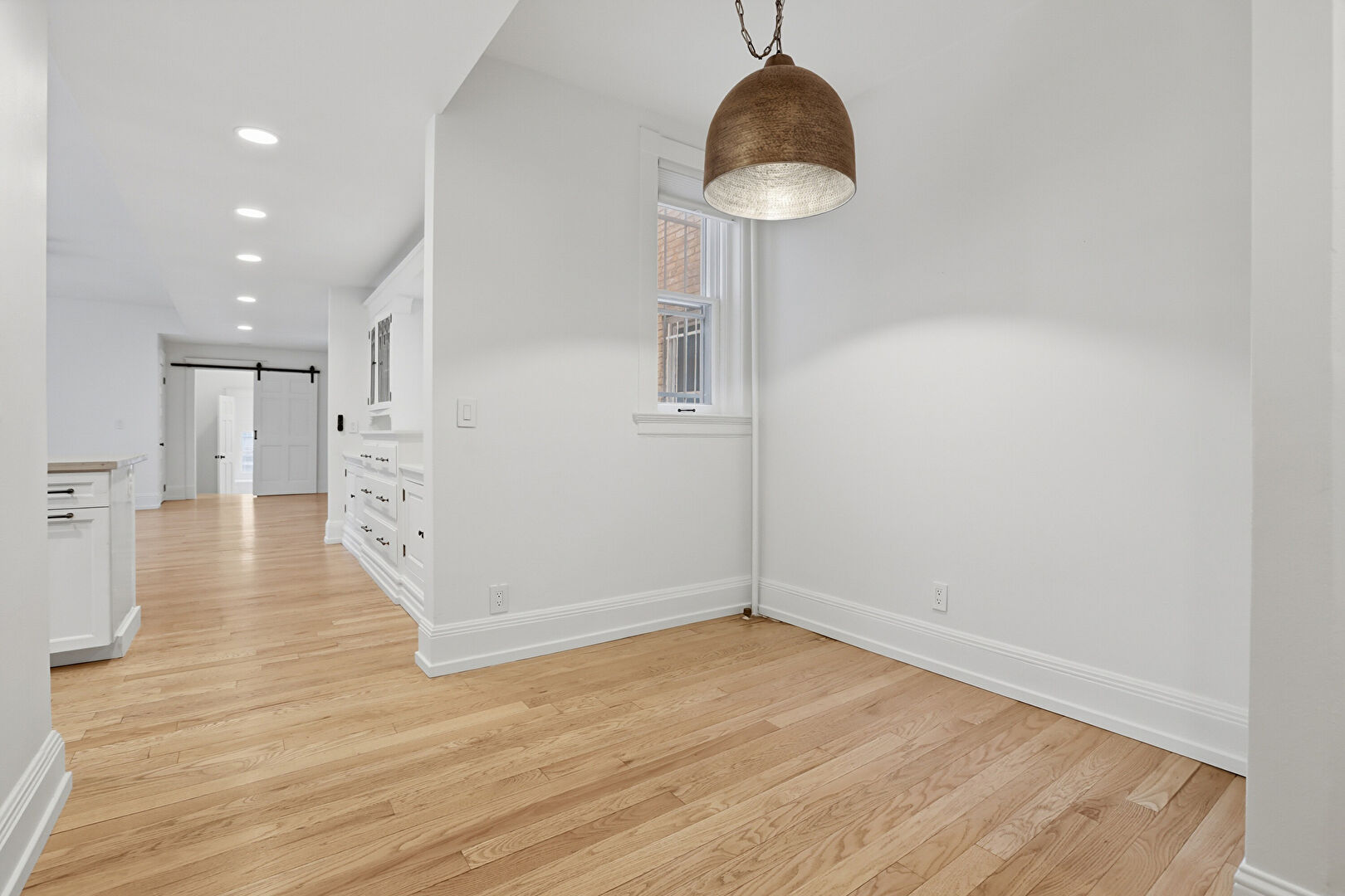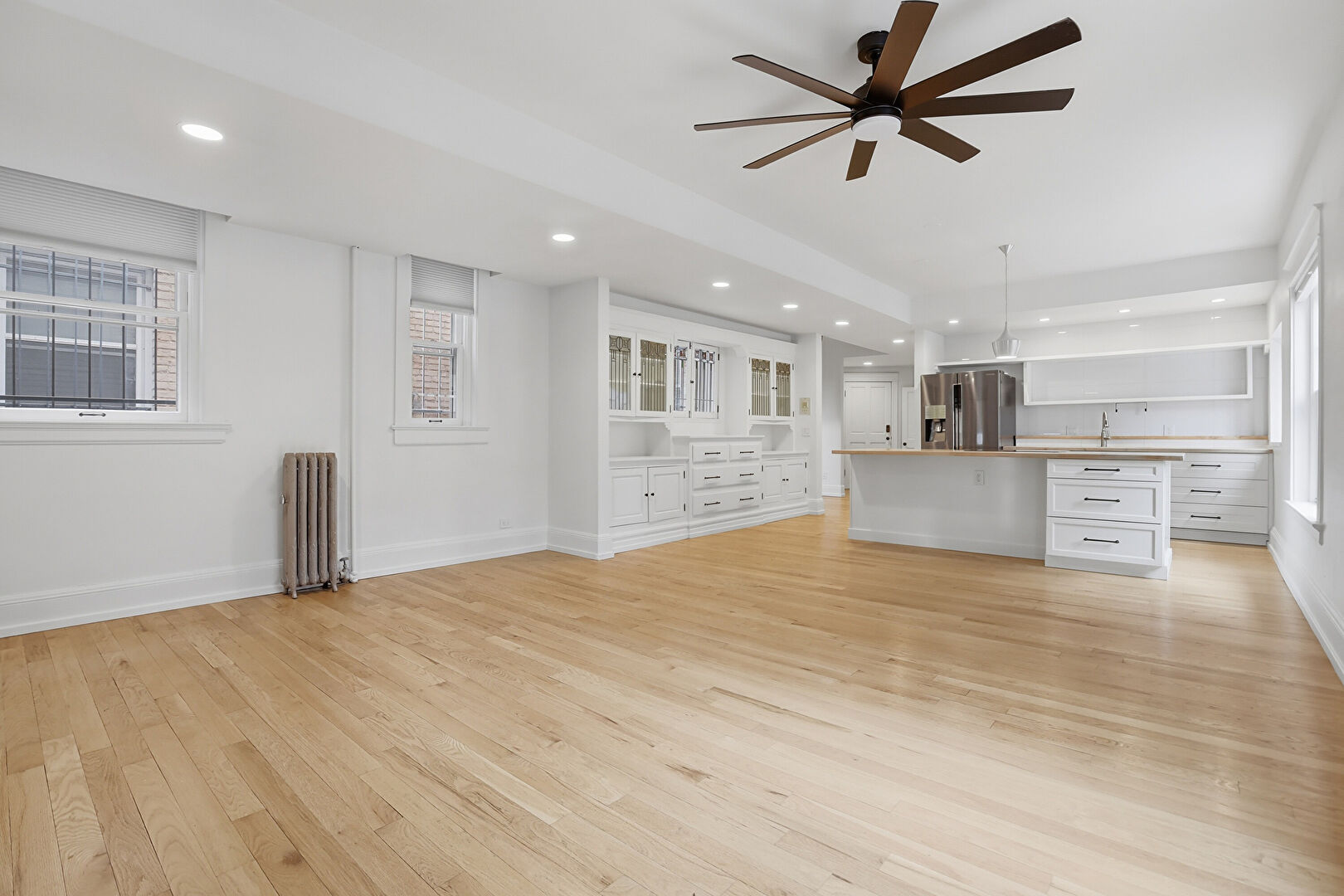 Barn Door, Baseboards Wall, Ceiling Fan, Drywall, L Shaped Kitchen, Natural Light, Radiator, Recessed Lighting, Wood Finish Floor, Baseboards Wall, Ceiling Fan, Wood Finish Floor