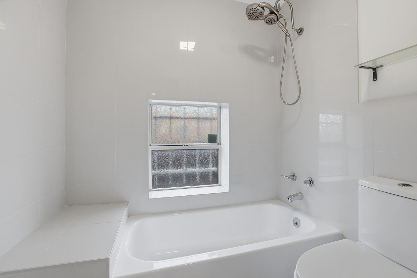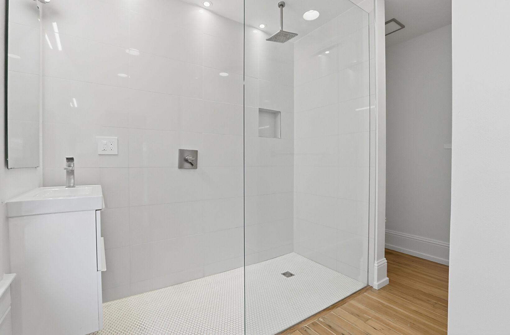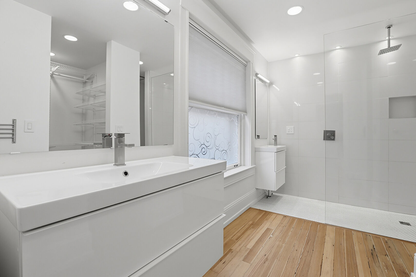 Baseboards Wall, Combined Bath Shower, Drywall, Full Bathroom, Natural Light, Recessed Lighting, Two Single Vanities, Vanity, Wood Finish Floor, Combined Bath Shower, Drywall, Recessed Lighting, Tile Floor, Wood Finish Floor