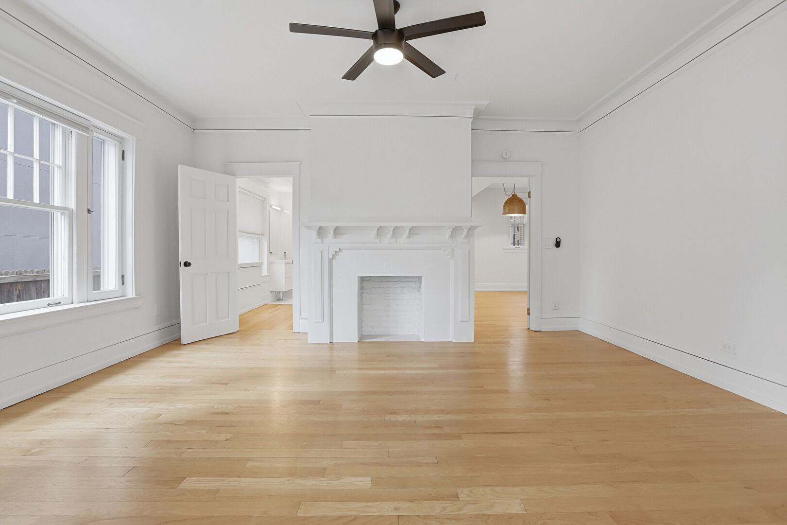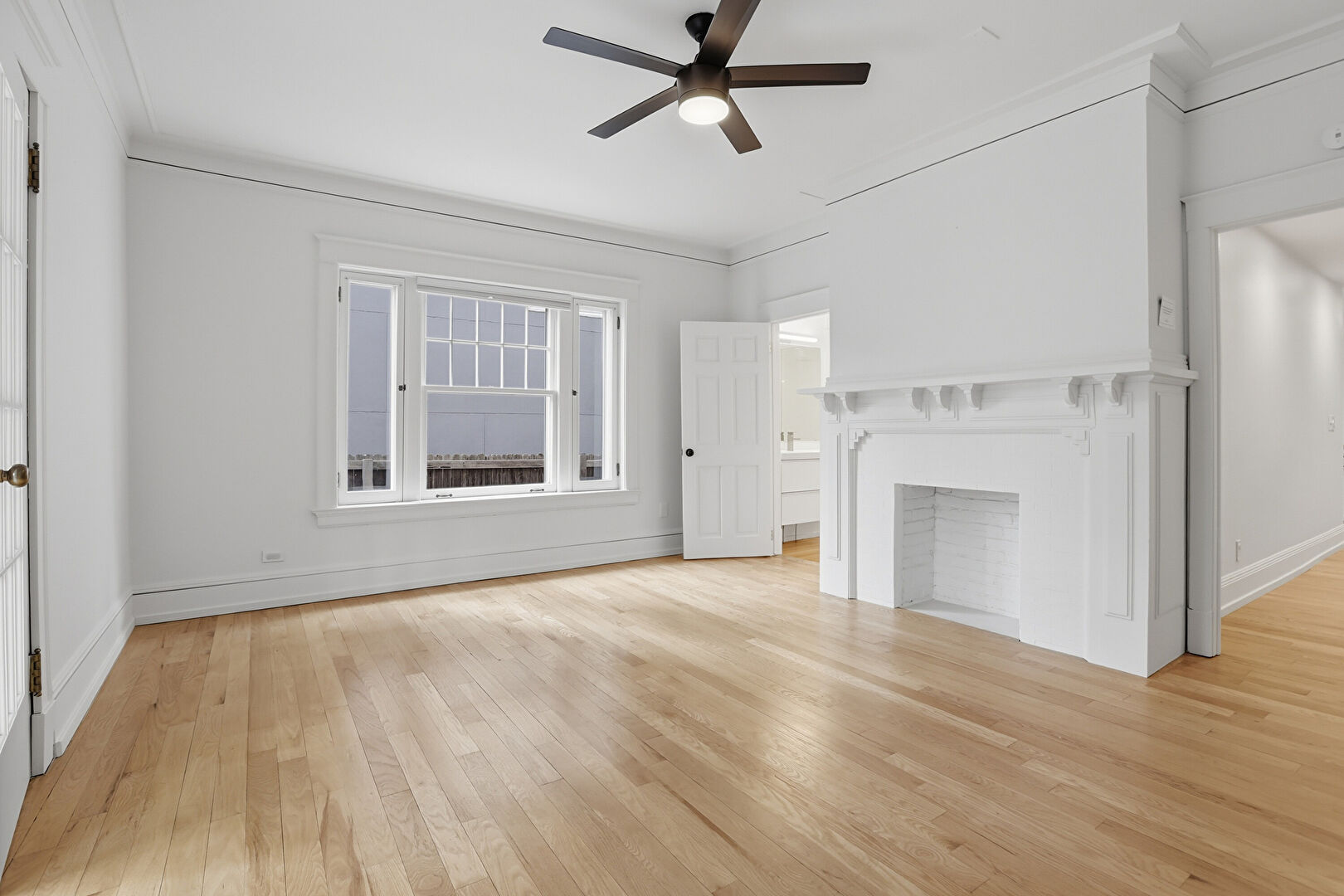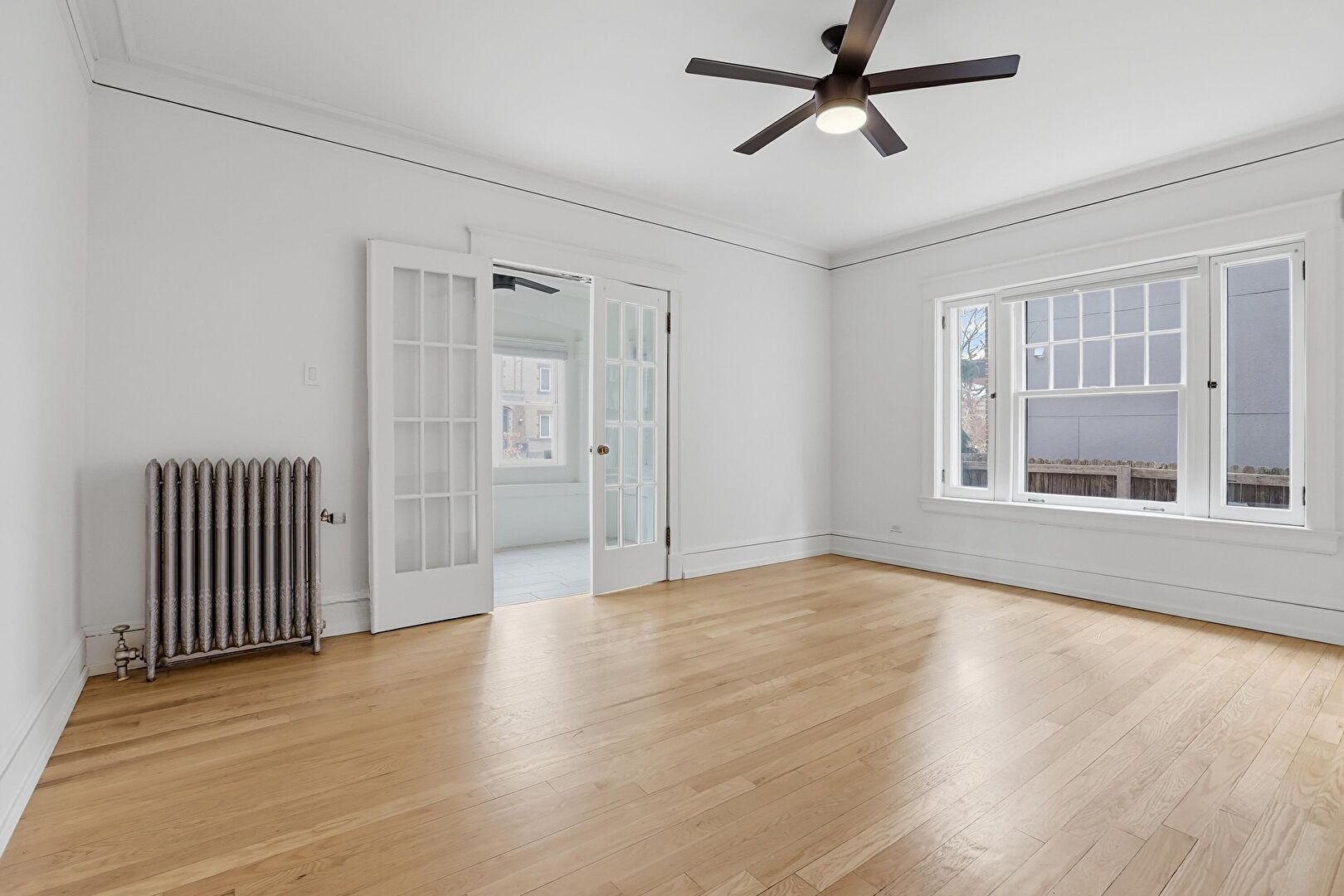 Baseboards Wall, Ceiling Fan, Crown Molding, Drywall, Fireplace, French Doors, Natural Light, Radiator, Wood Finish Floor, Ceiling Fan, Crown Molding