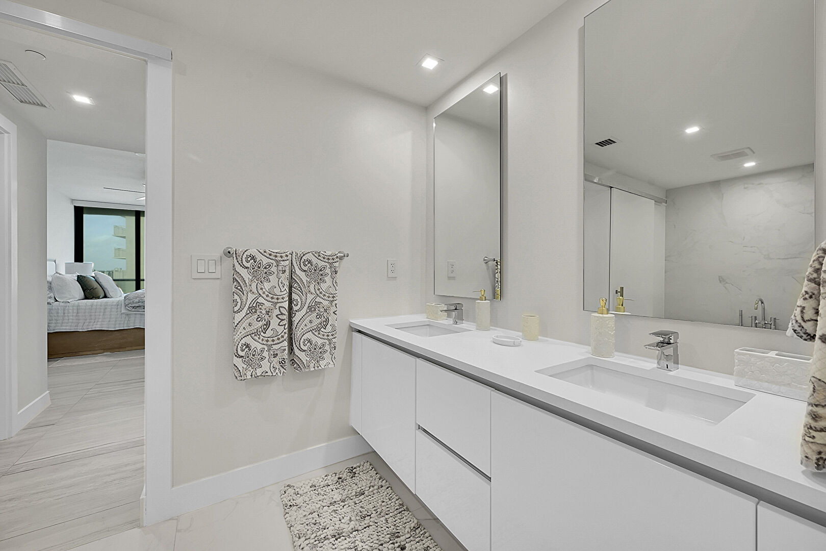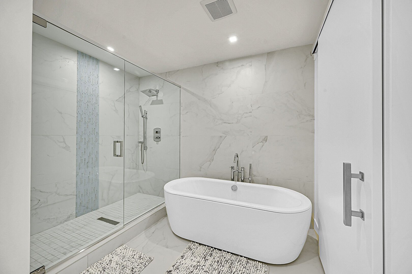Baseboards Wall, Double Vanity, Drywall, Full Bathroom, Marble Finish Floor, Marble Wall, Recessed Lighting, Tile Floor, Tile Wall, Vent, Water Closet, Ensuite Bathroom, Full Bathroom