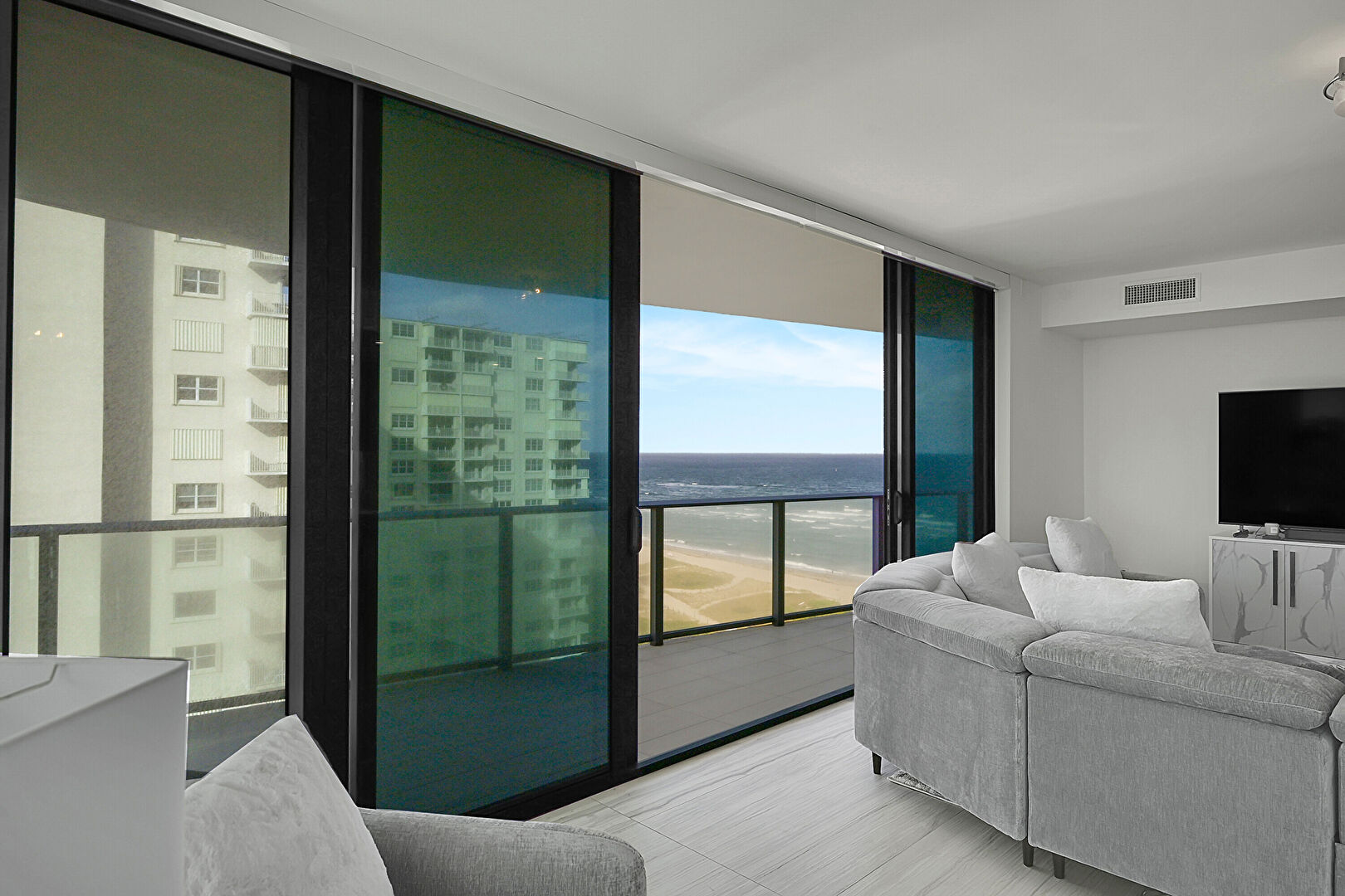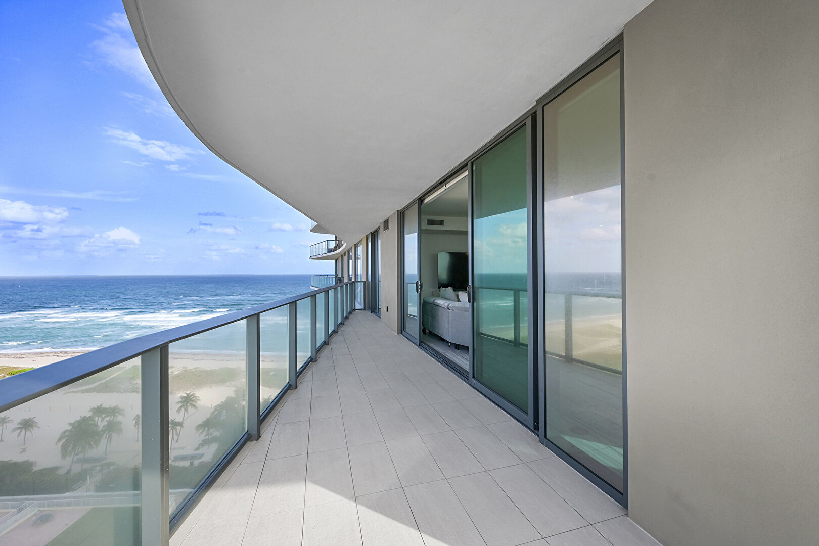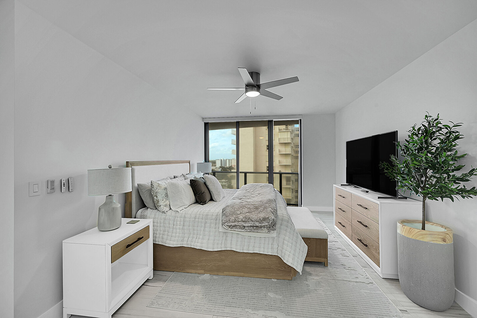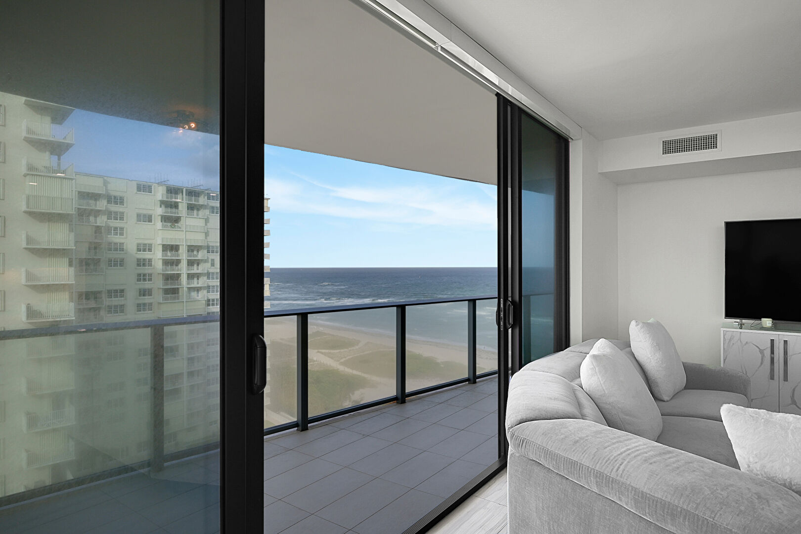 Apartment Complex View, Balcony, Baseboards Wall, Beach View, Ceiling Fan, Drywall, Floor Ceiling Windows, Natural Light, Vent, Wood Finish Floor, Baseboards Wall, Drywall, Floor Ceiling Windows, Natural Light, Outdoor Living Space, Water View, Wood Finish Floor