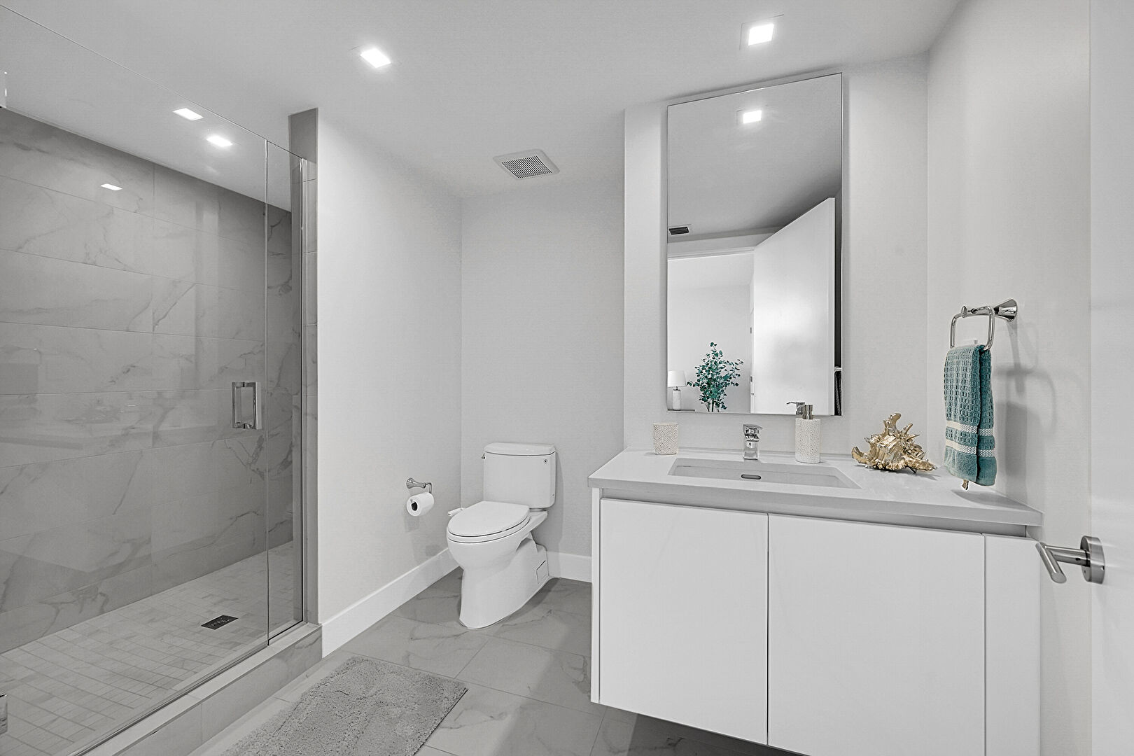 Baseboards Wall, Drywall, Full Bathroom, Recessed Lighting, Vanity, Vent, Marble Finish Floor