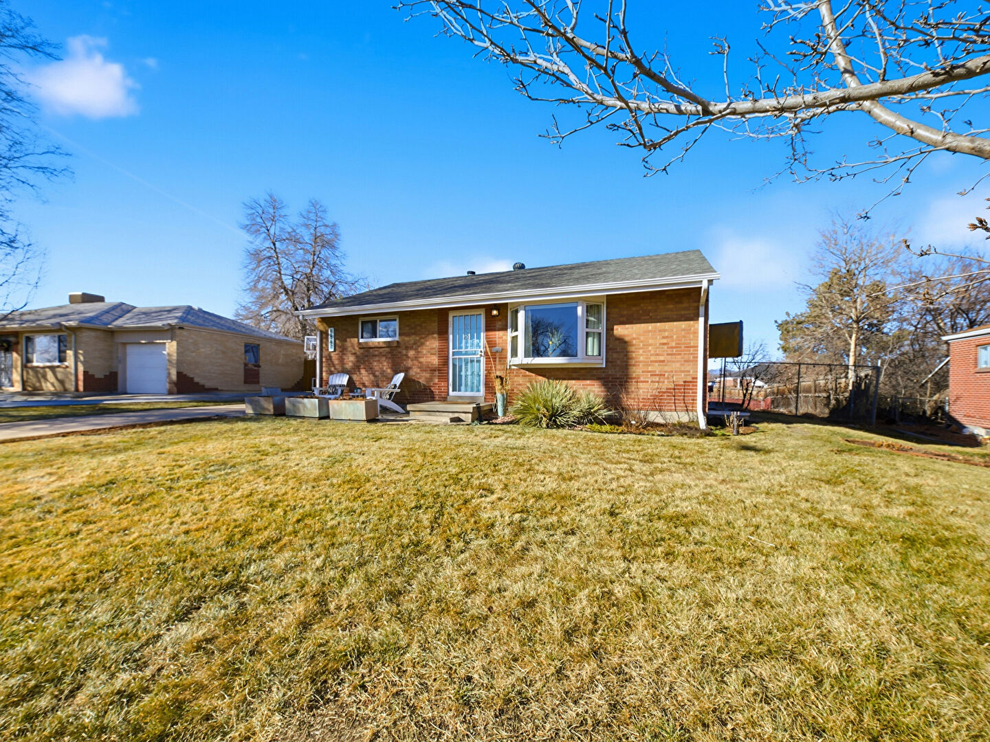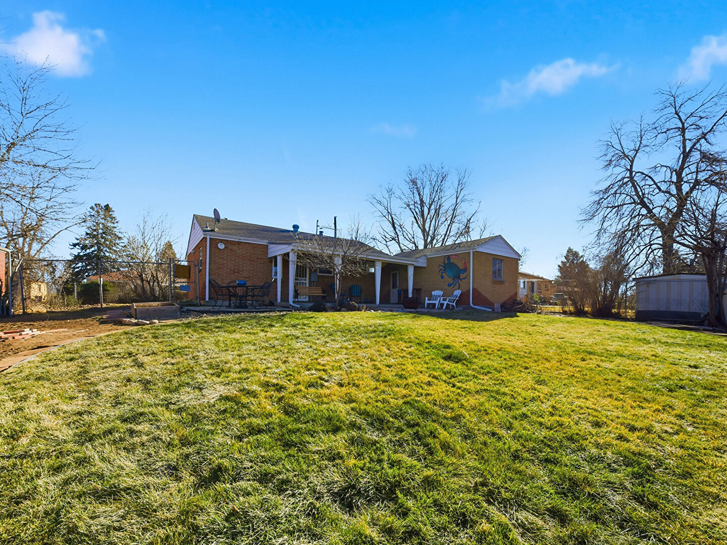Concrete Foundation, Downspout, Fence, Fire Pit, Garden, Gate, Gutters, Horizontal Siding, Lawn, Patio, Satellite Dish, Brick Siding