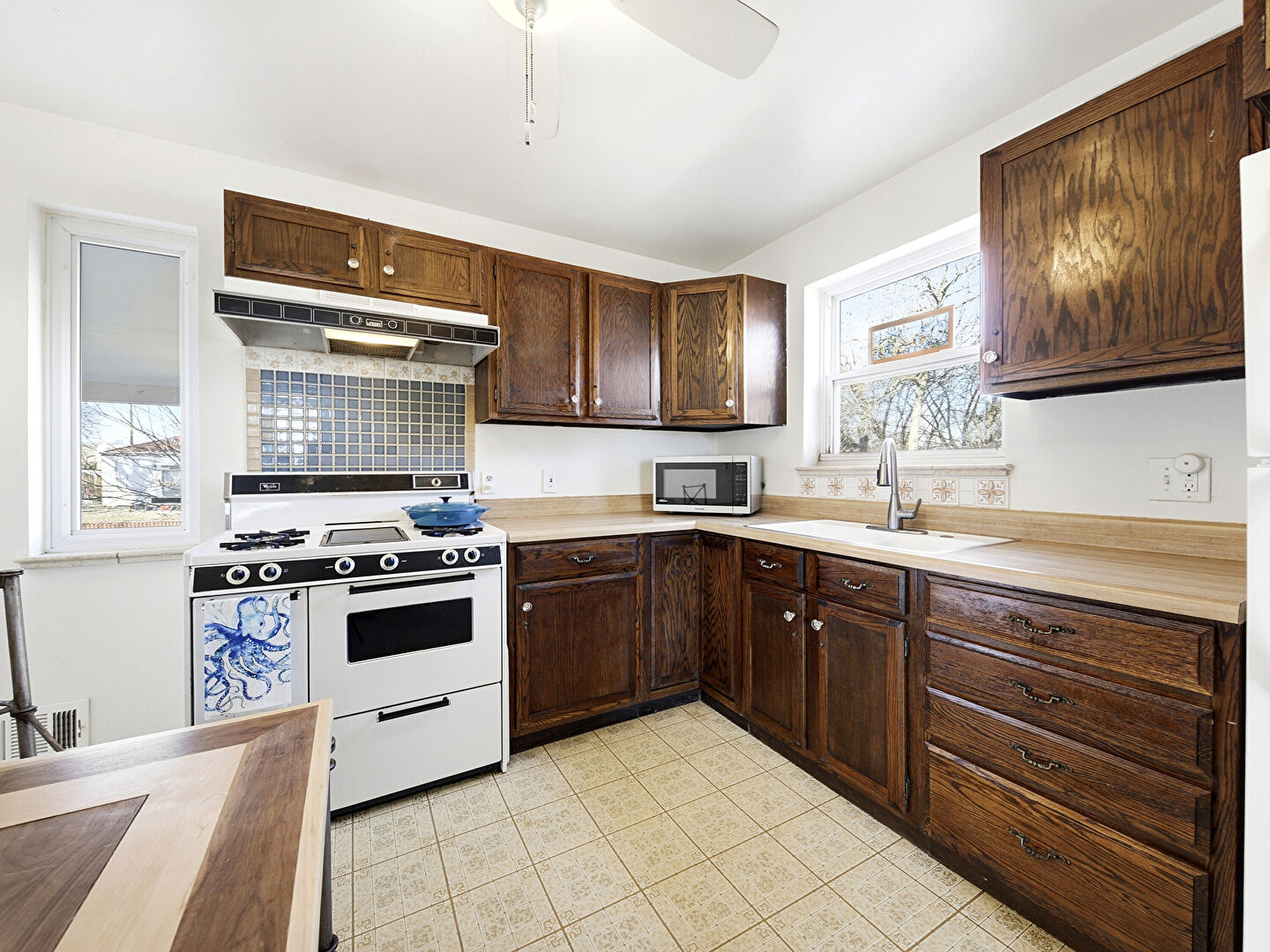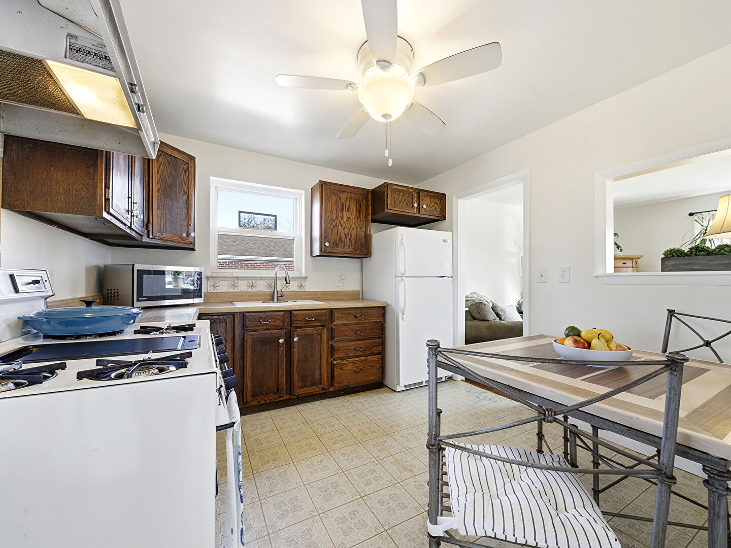 Baseboards Wall, Ceiling Fan, Dark Brown Cabinets, Drywall, L Shaped Kitchen, Natural Light, Shaker Cabinets, Tile Floor, Vent, Vinyl Floor, Visible Hinge Cabinets, Baseboards Wall, Dark Brown Cabinets, L Shaped Kitchen, Natural Light