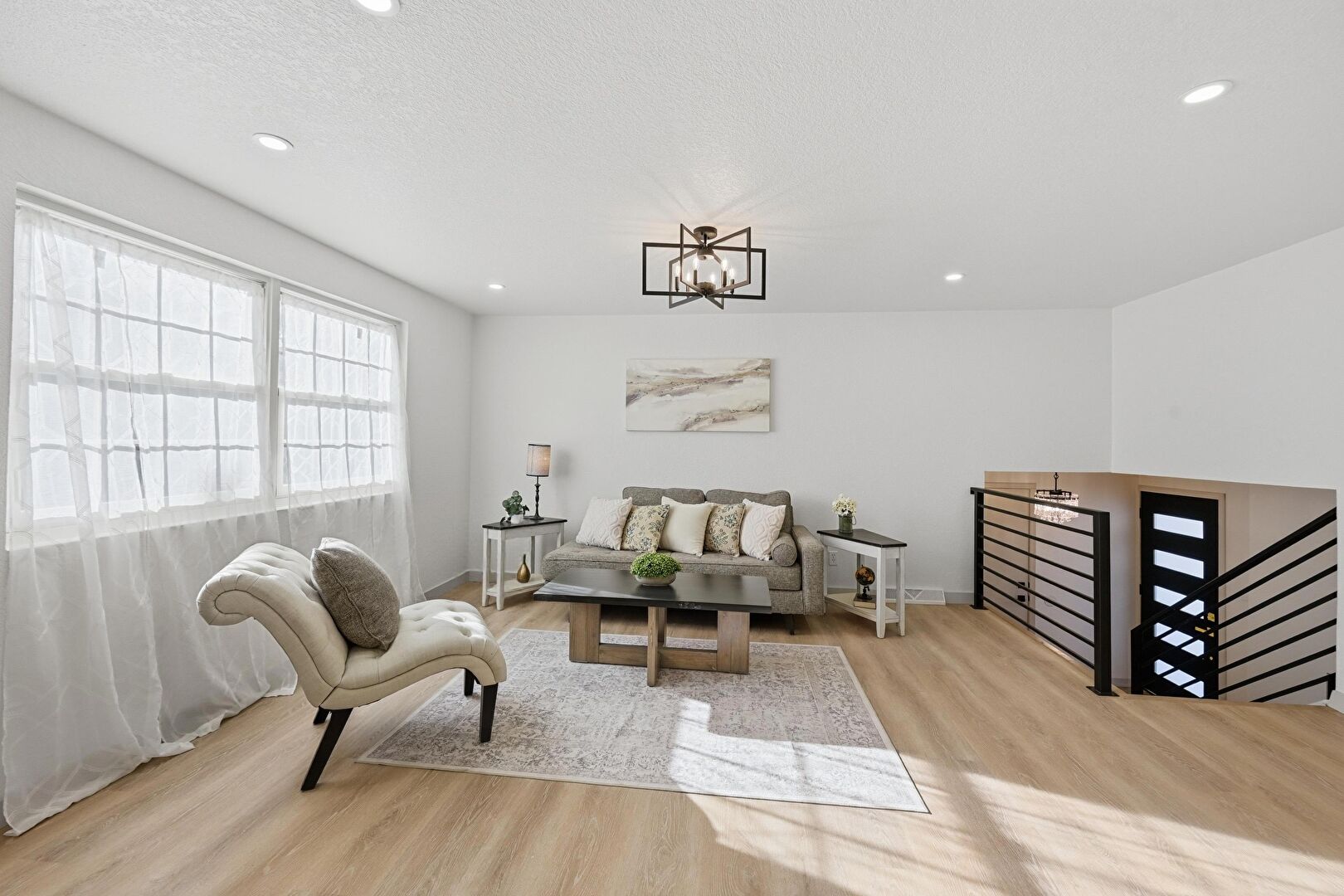 Baseboards Wall, Drywall, Natural Light, Notable Chandelier, Recessed Lighting, Stairs, Wood Finish Floor, Vent